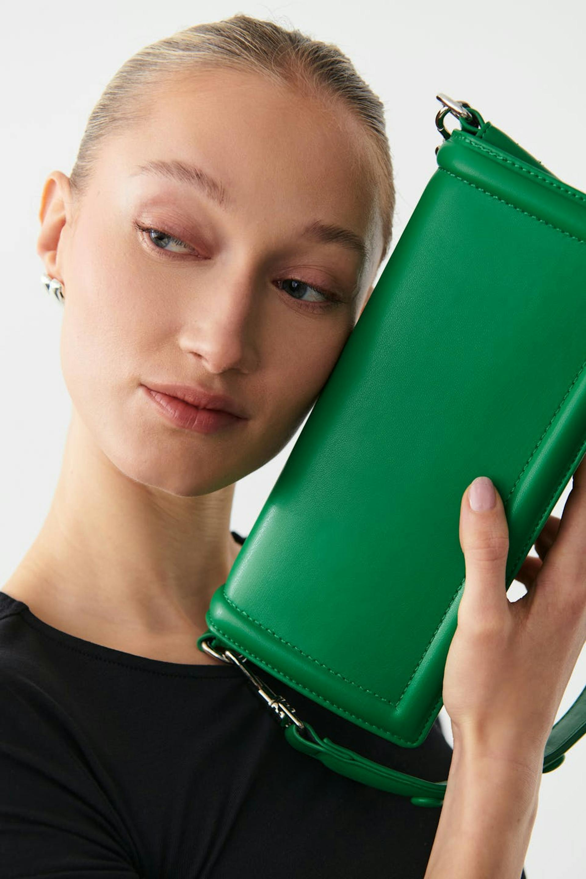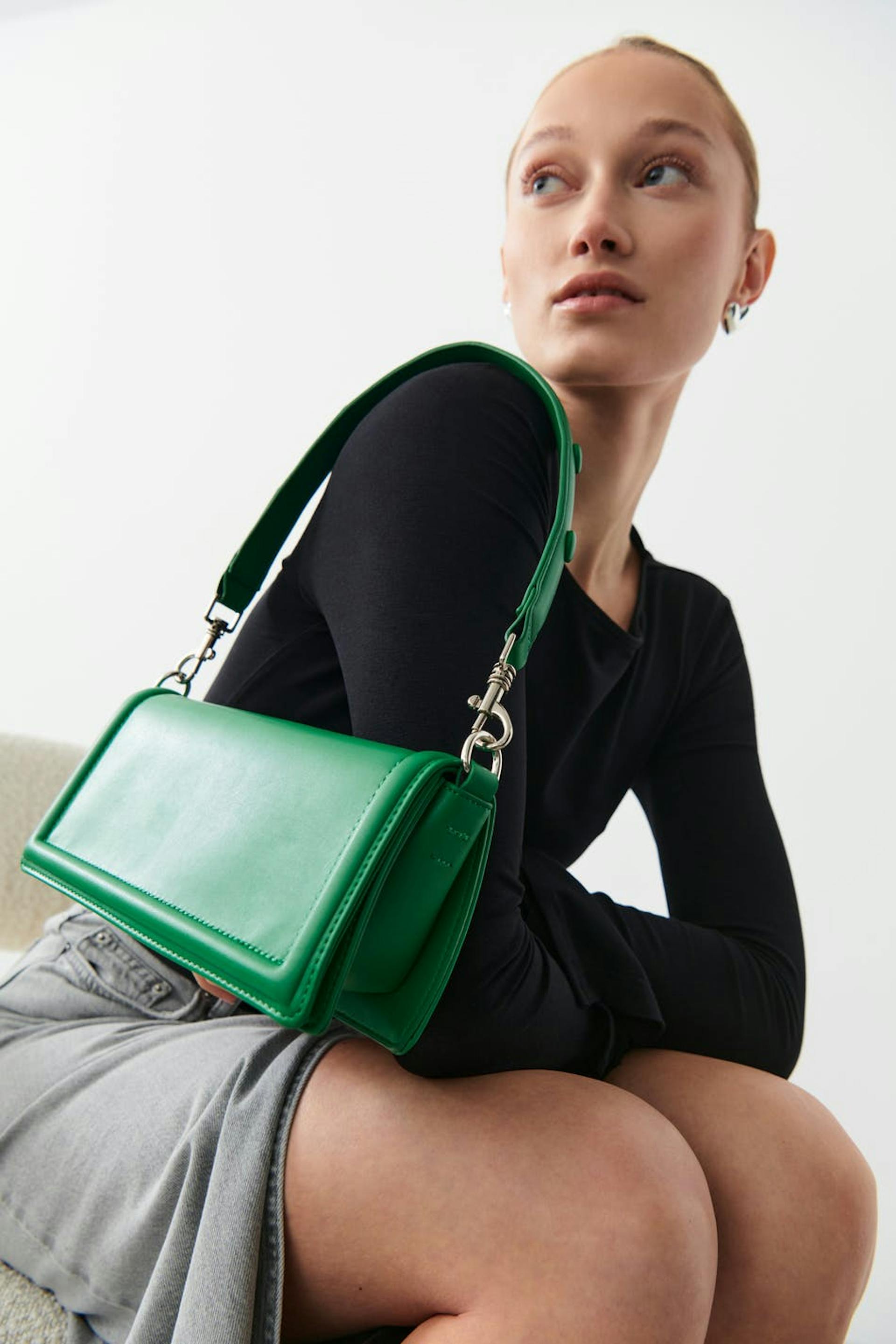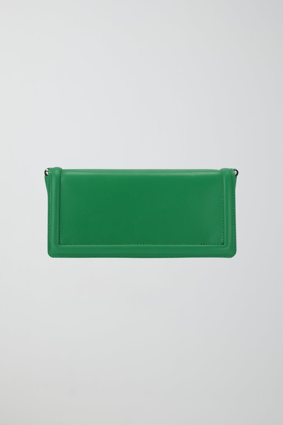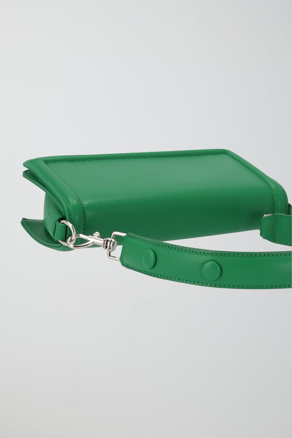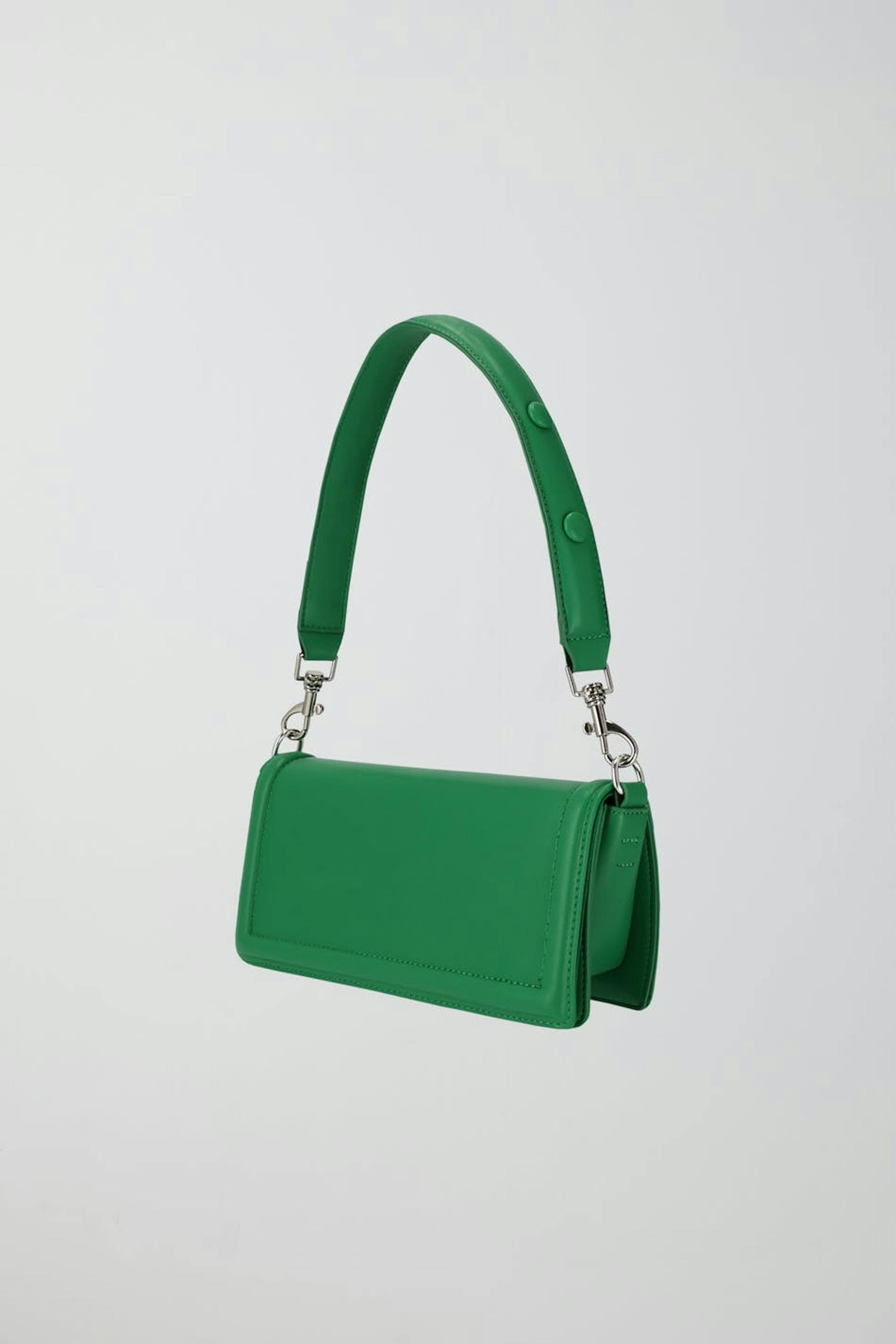 Suorakulmainen laukku läpillä. Laukku on vihreä ja siinä on lyhyt, irrotettava olkain koristeellisilla napeilla.