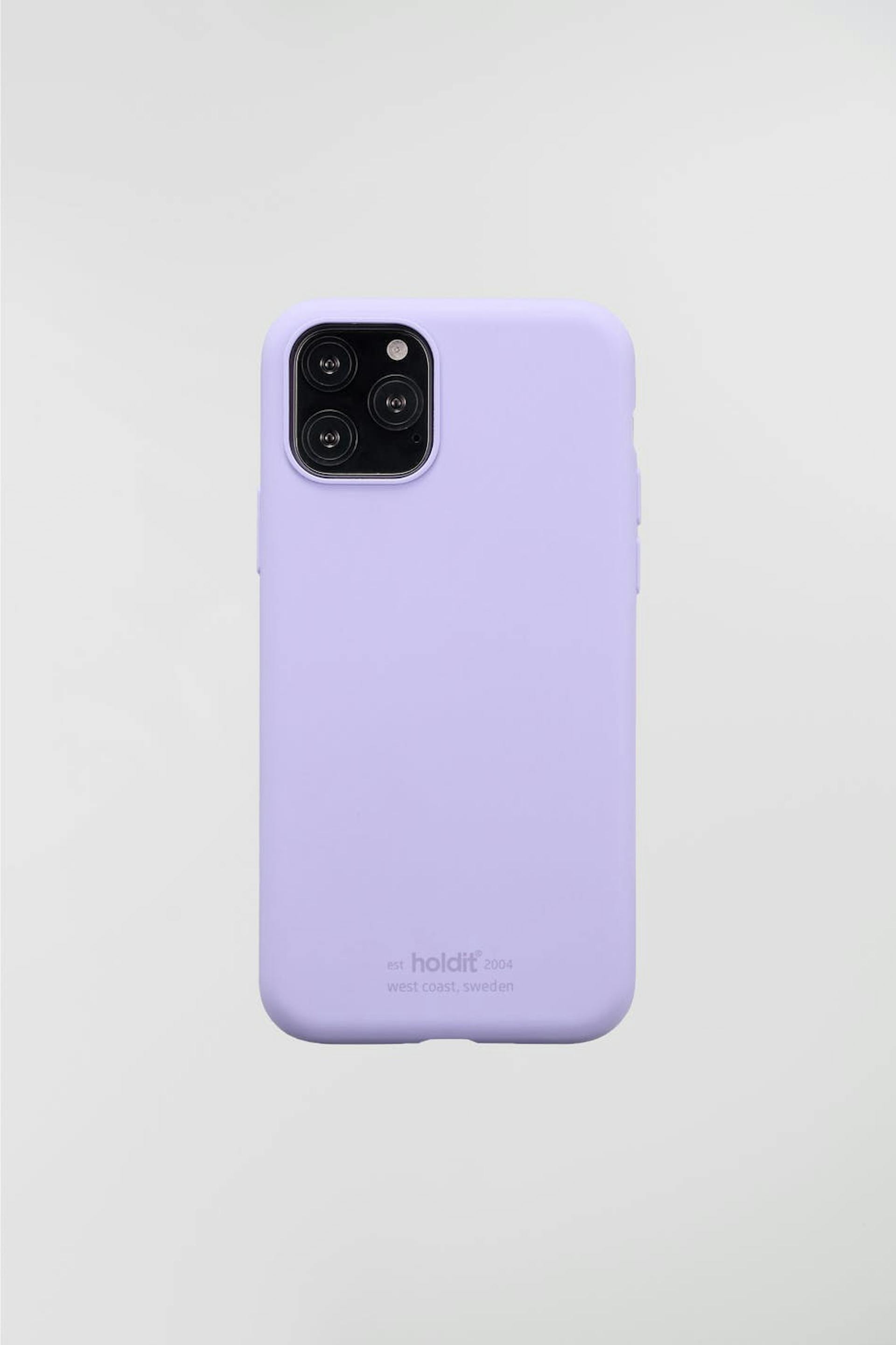 Älypuhelimen suojakuori Holdit-tuotemerkiltä. Älypuhelimen suojakuori on liila. Se valmistetaan silikonista. iPhone 11 pro.