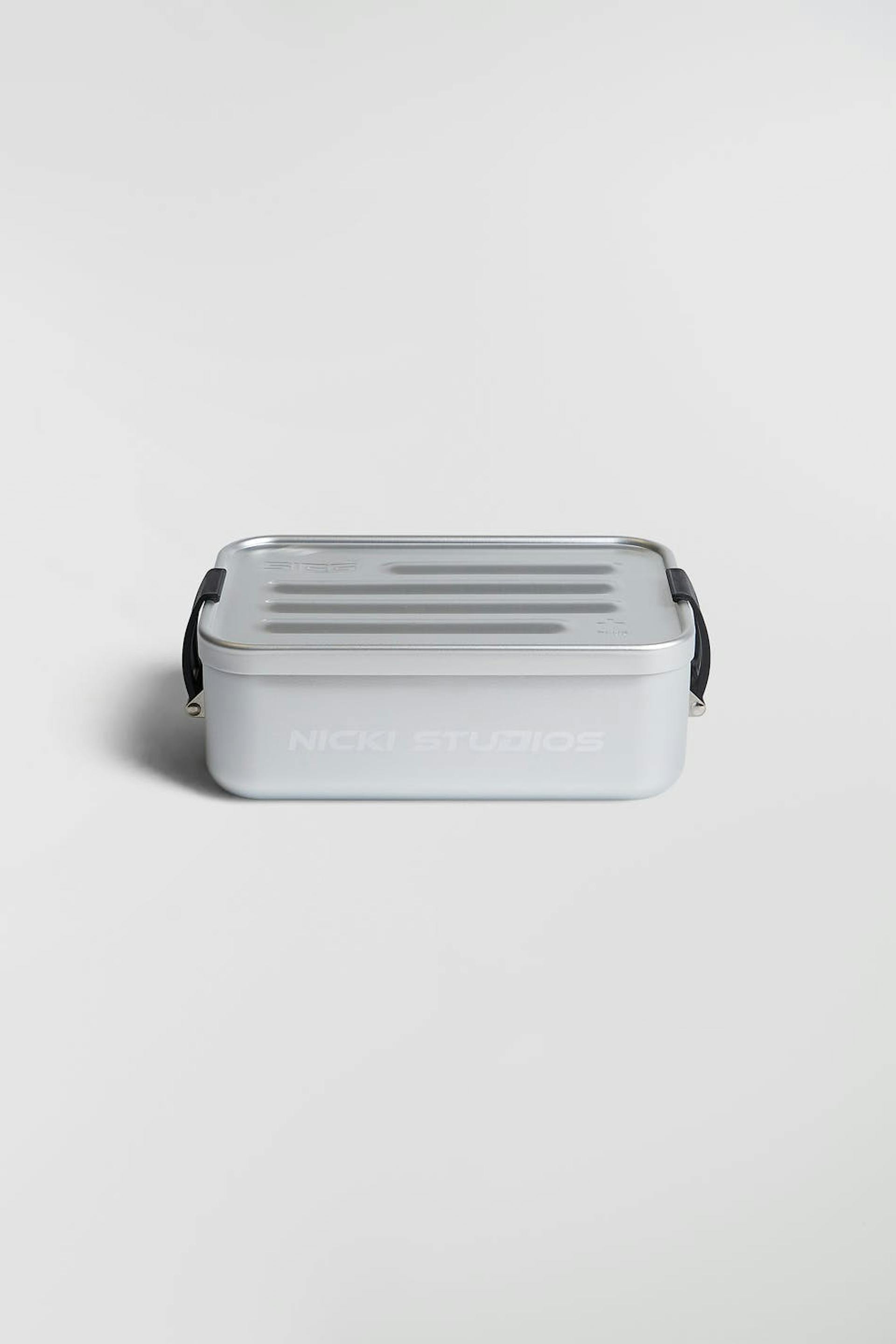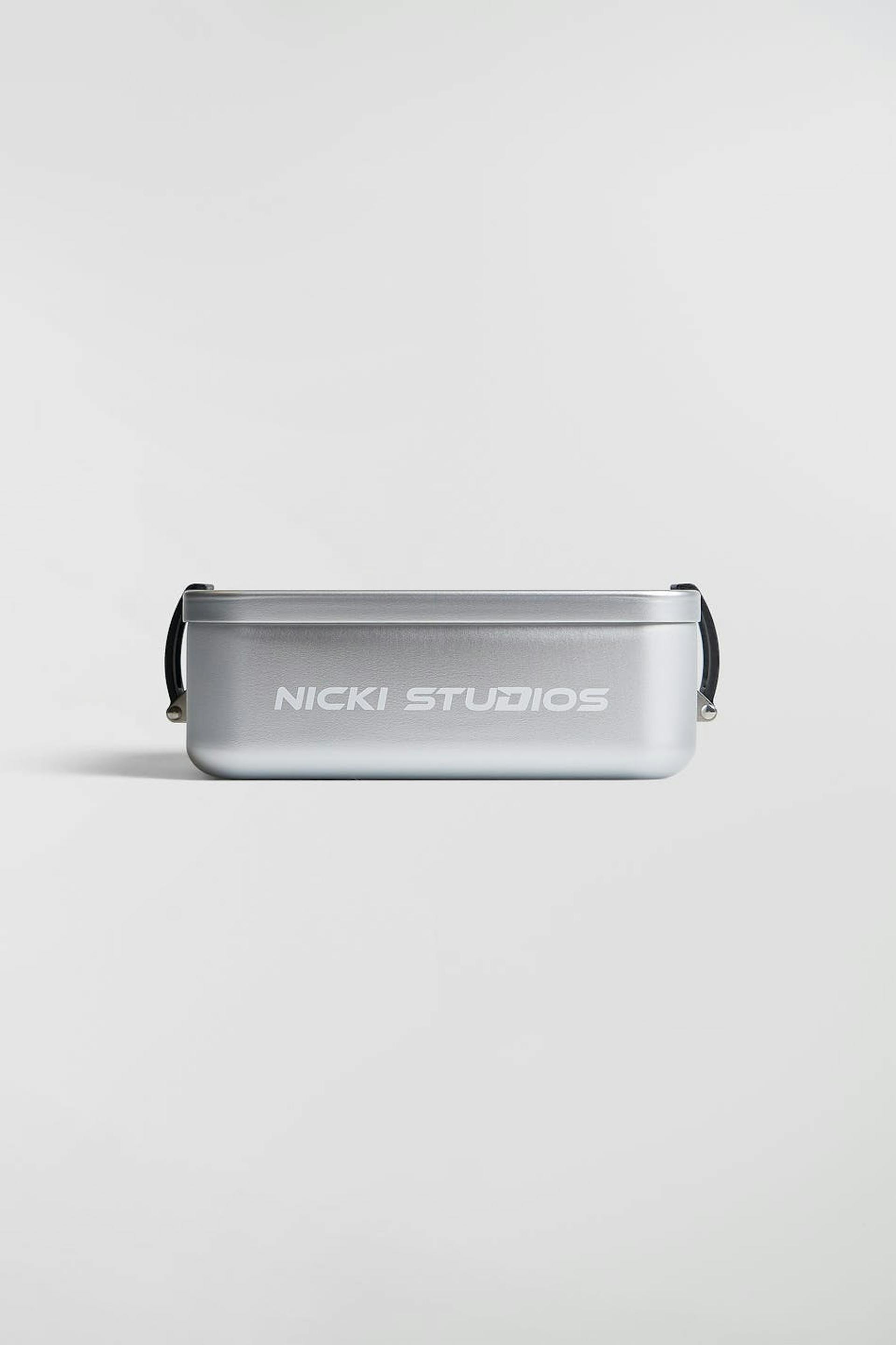Nicki Studios X Gina Tricot. Alumiininen eväsrasia logoprintillä edessä. Eväsrasia on hopea ja siinä on irrotettava erotin.