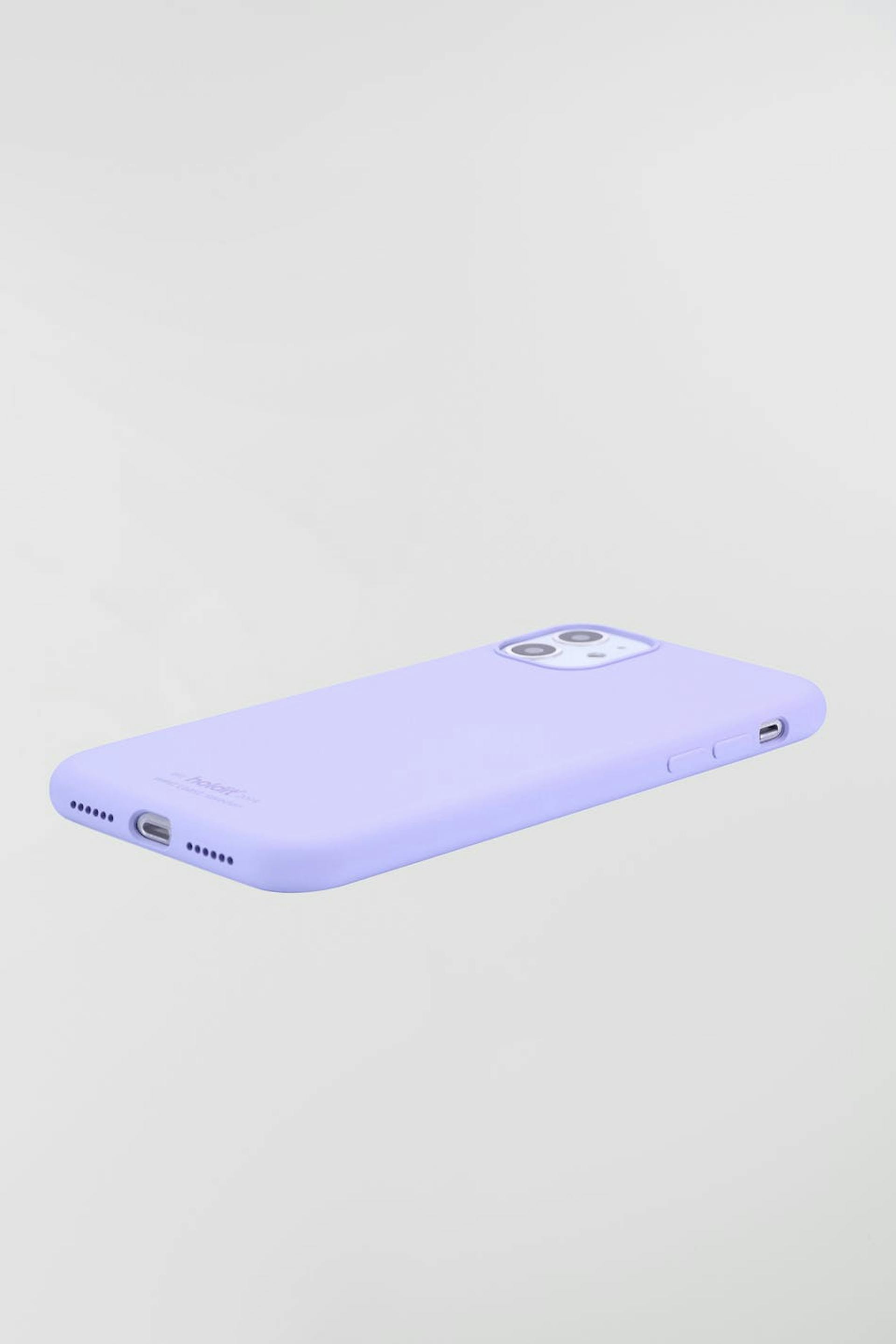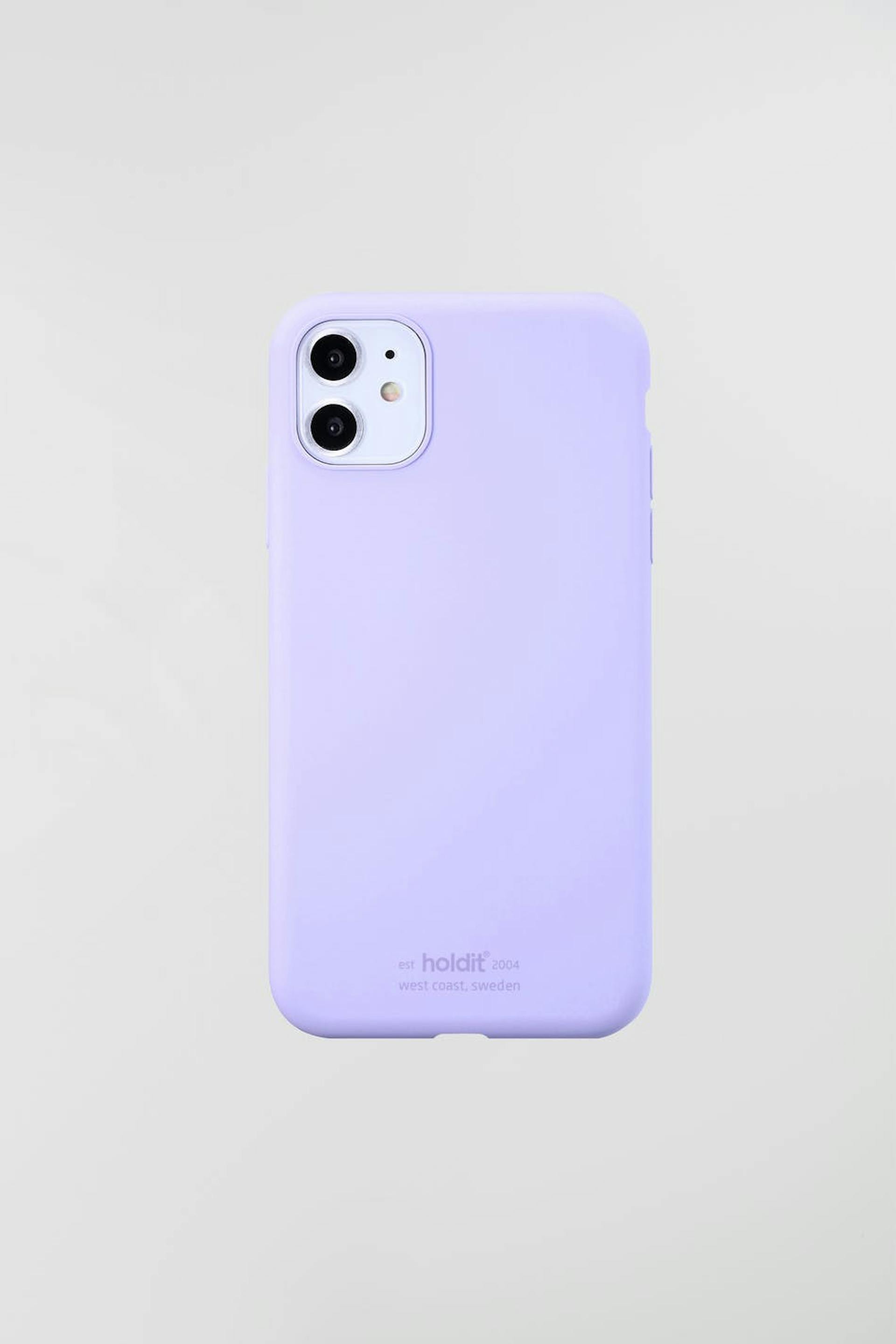 Älypuhelimen suojakuori Holdit-tuotemerkiltä. Älypuhelimen suojakuori on liila. Se valmistetaan silikonista. iPhone 11.