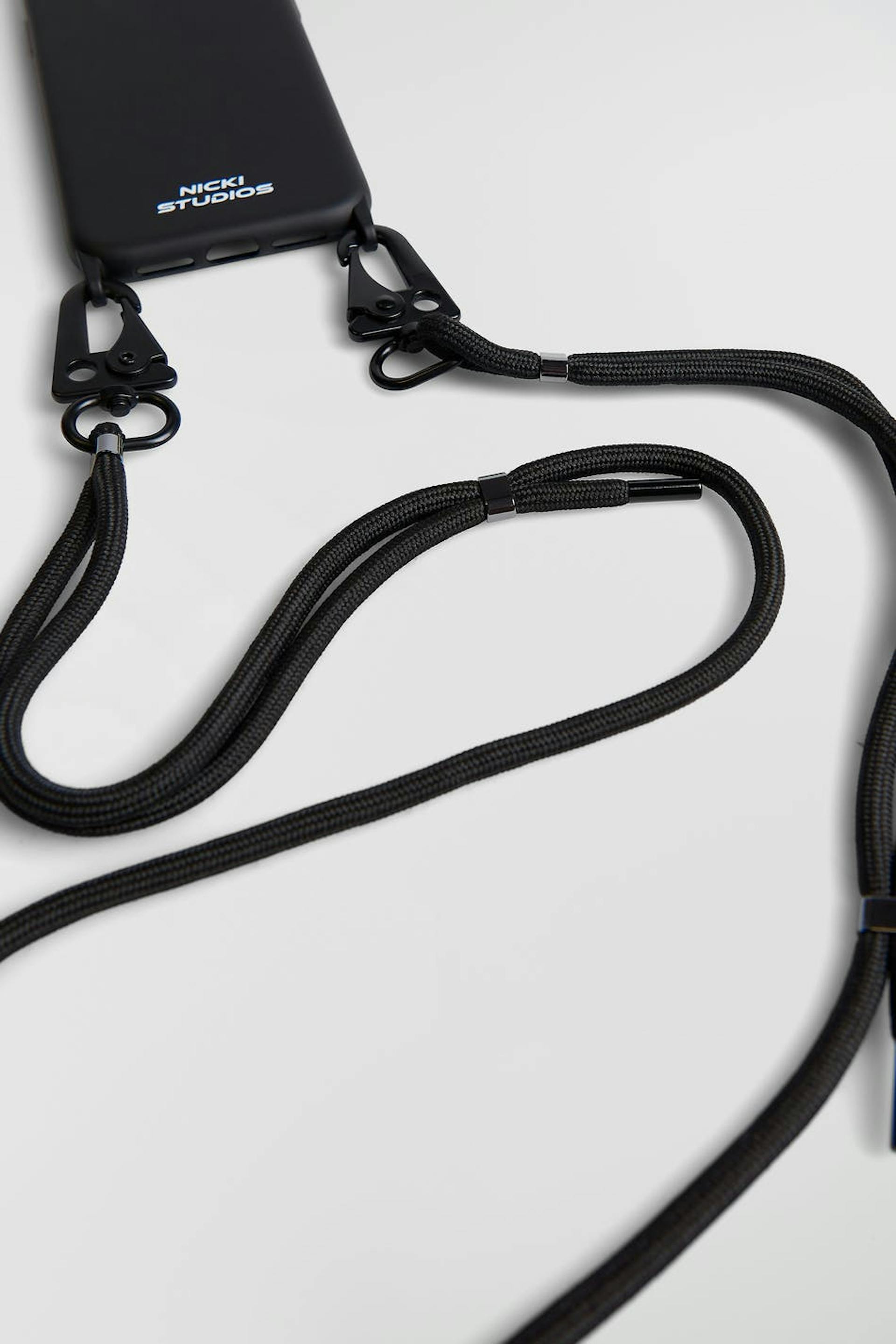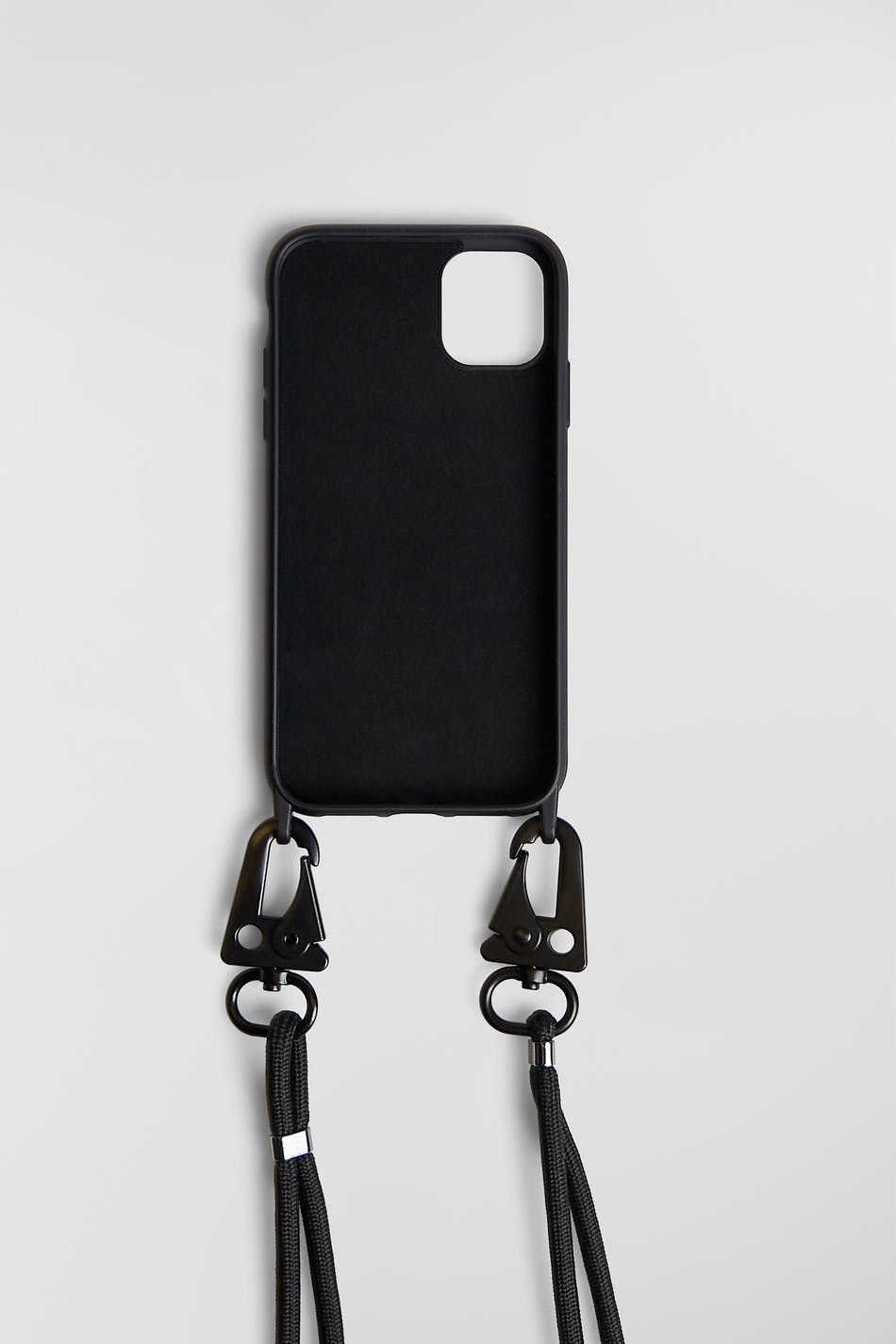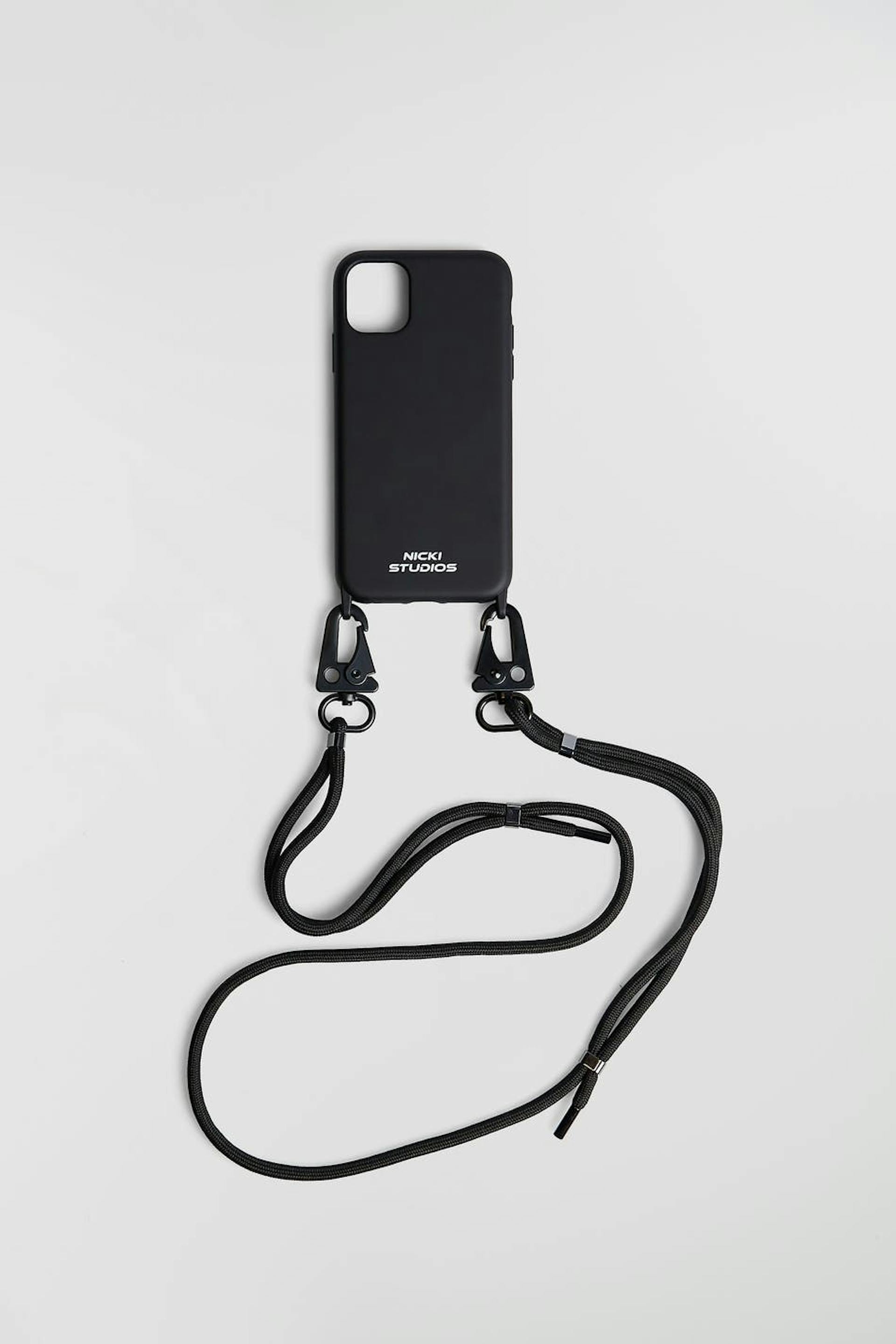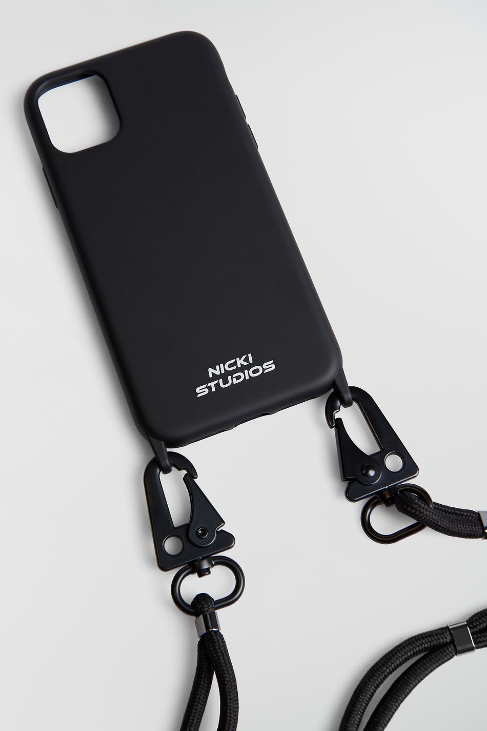 Nicki Studios X Gina Tricot. Älypuhelimen suojakuori iPhone XR/11:lle irrotettavilla hihnoilla hummerilukoilla. Älypuhelimen suojakuori on musta ja siinä on brändilogo edessä.