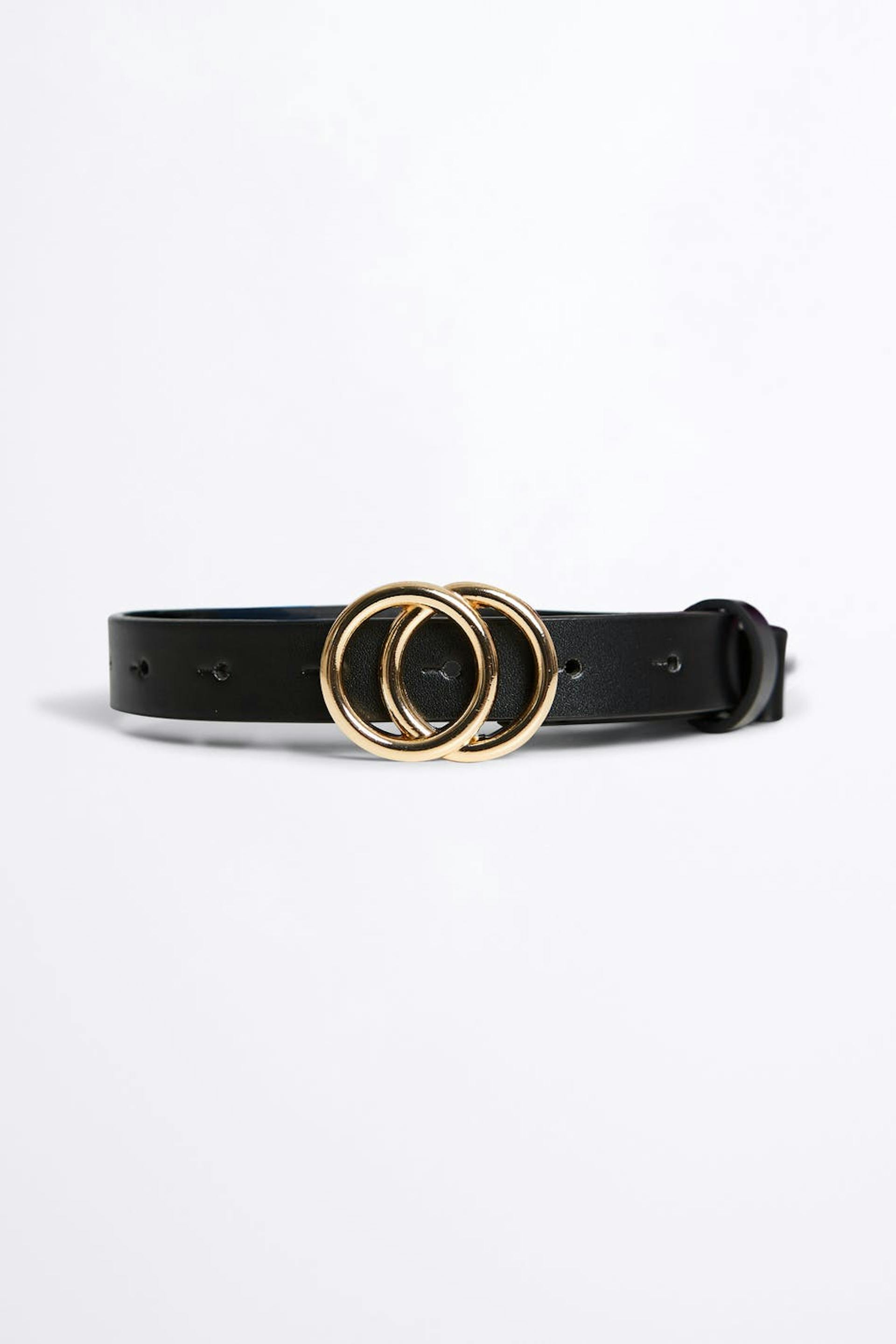 Vyö pyöreällä soljella metallista. Vyö on musta ja kultainen. Se valmistetaan tekonahasta.