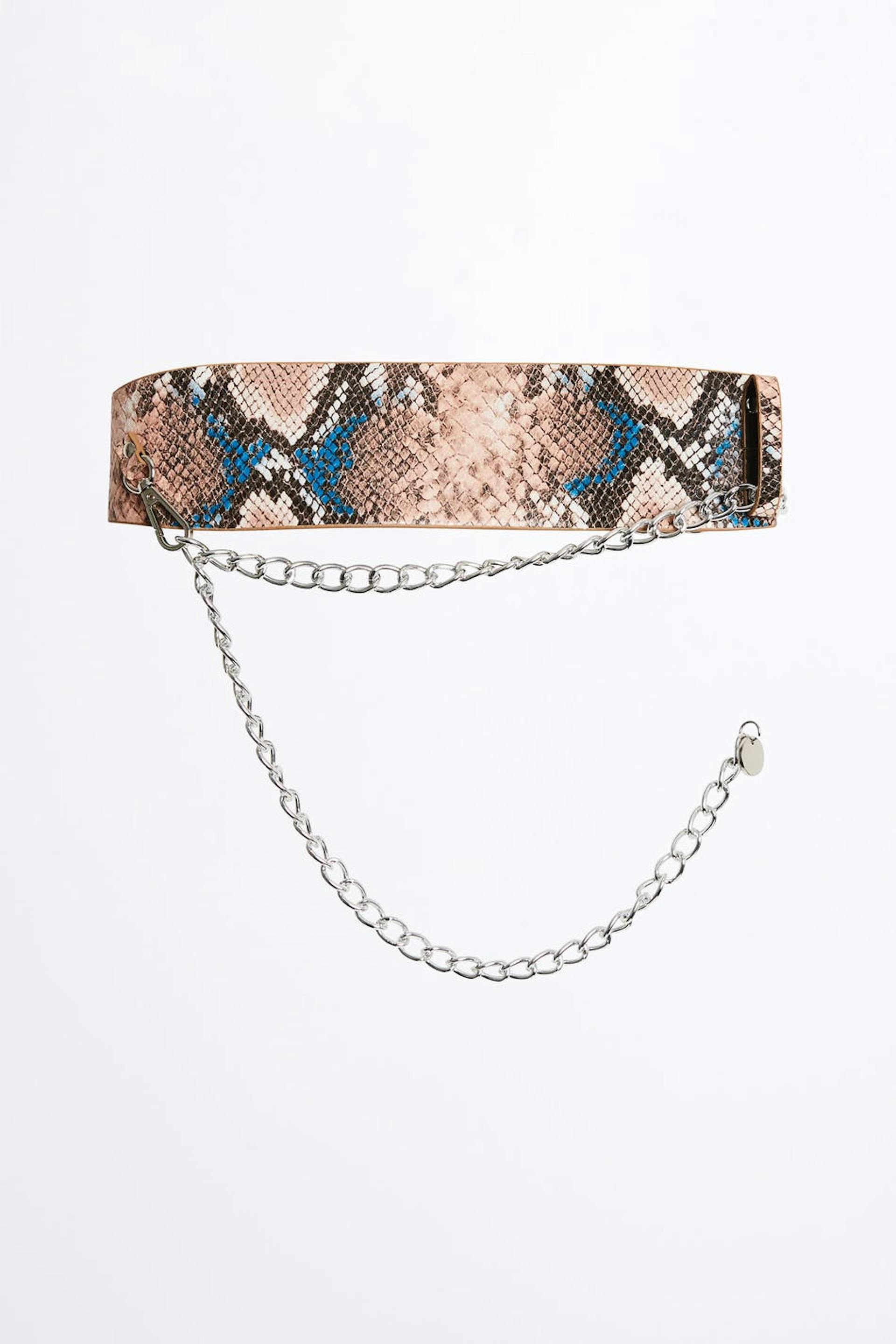 Leveä vyö ketjulla. Vyö on pinkki.