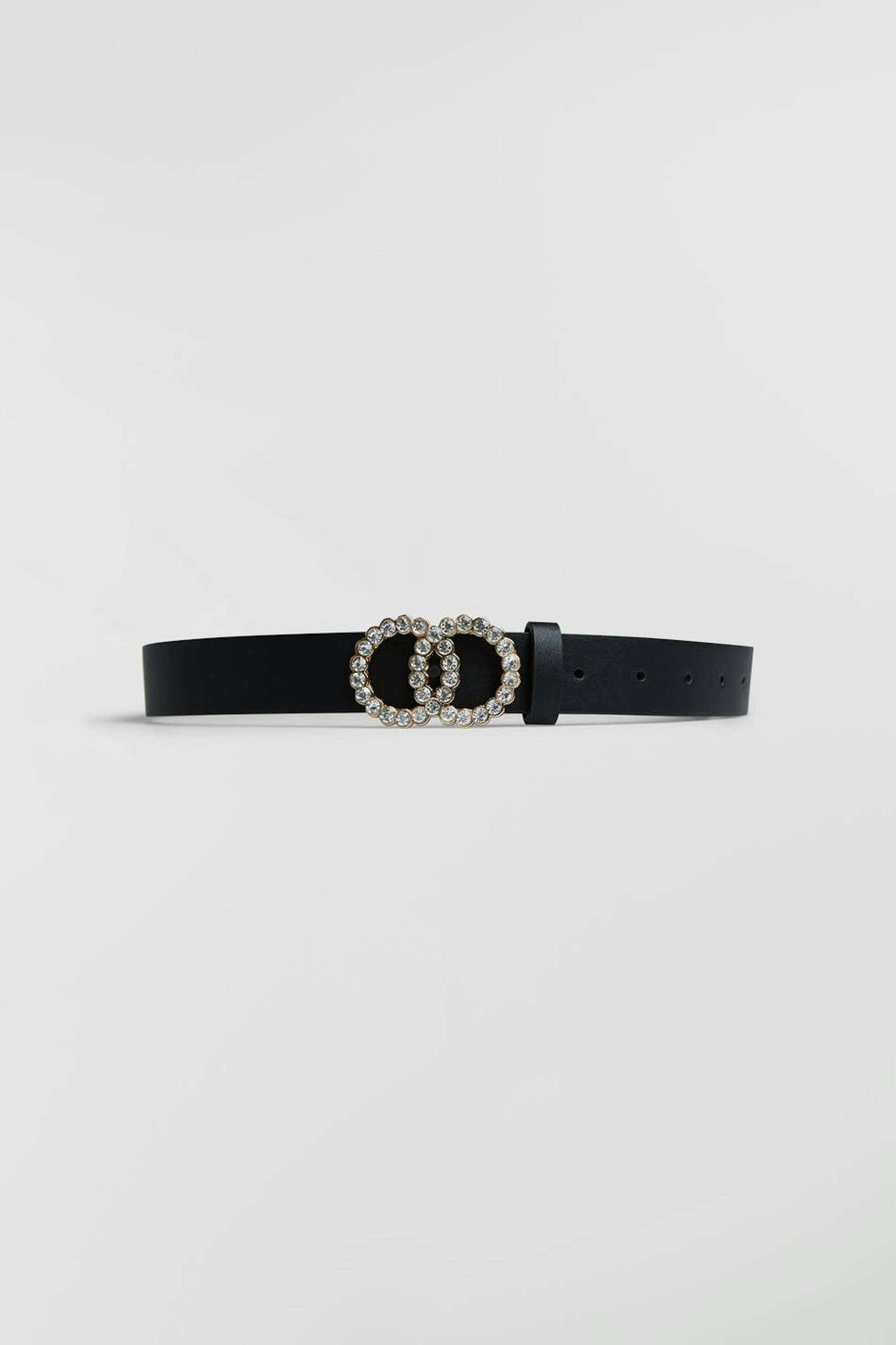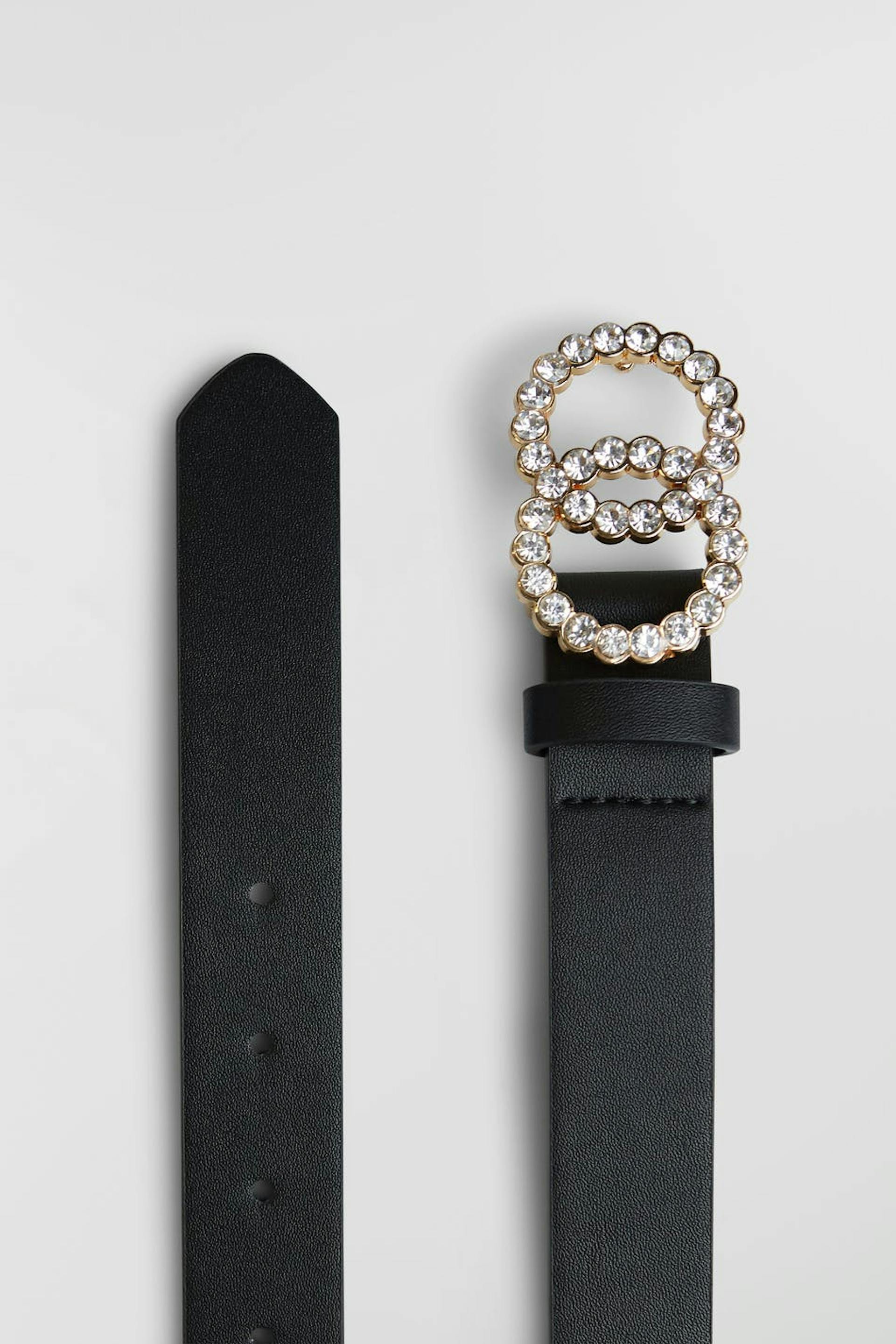 Vyö soljella tekojalokivilla. Vyö on musta. Se valmistetaan tekonahasta.