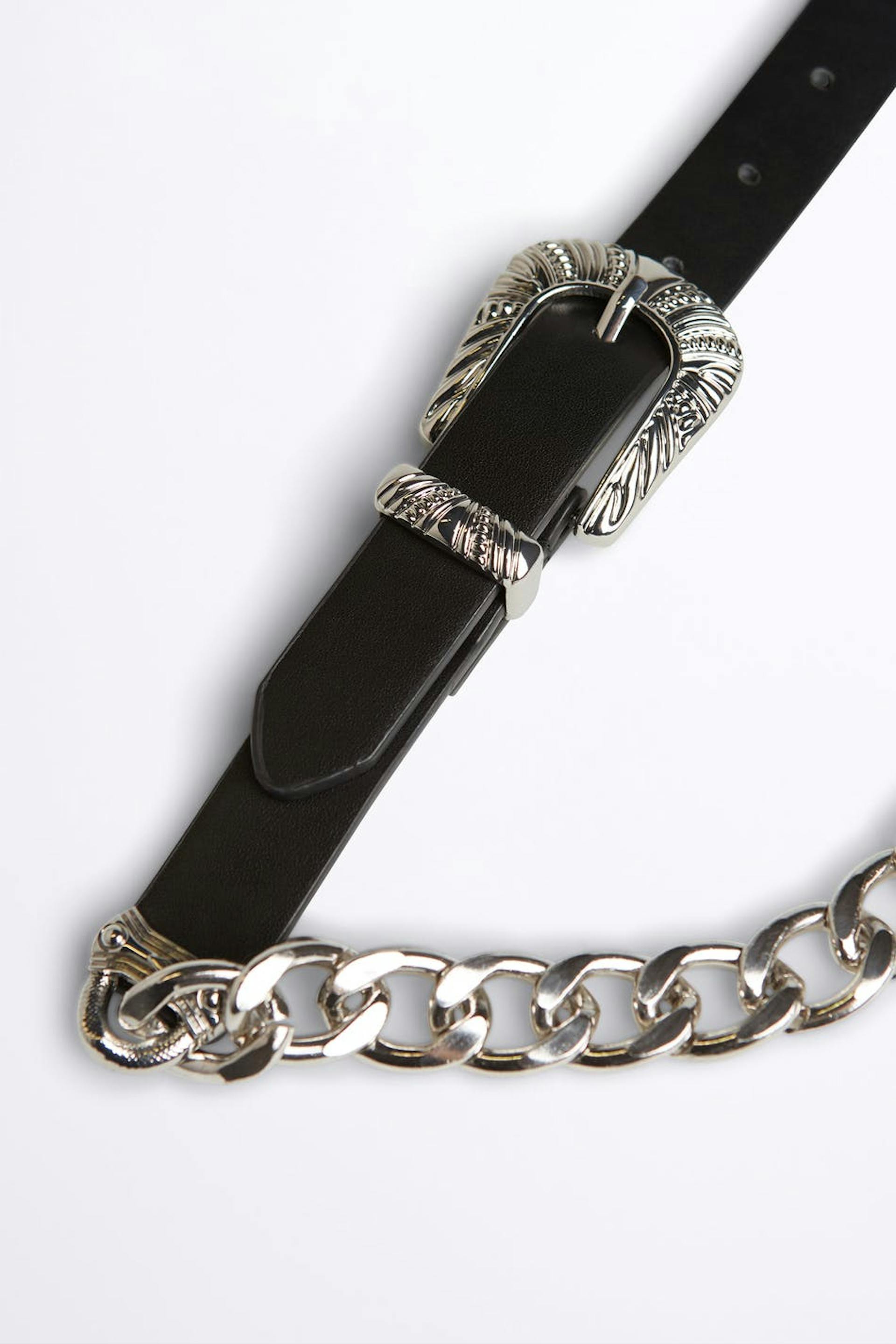 Vyö ketjulla takana. Vyö on musta ja siinä on solki metallista.