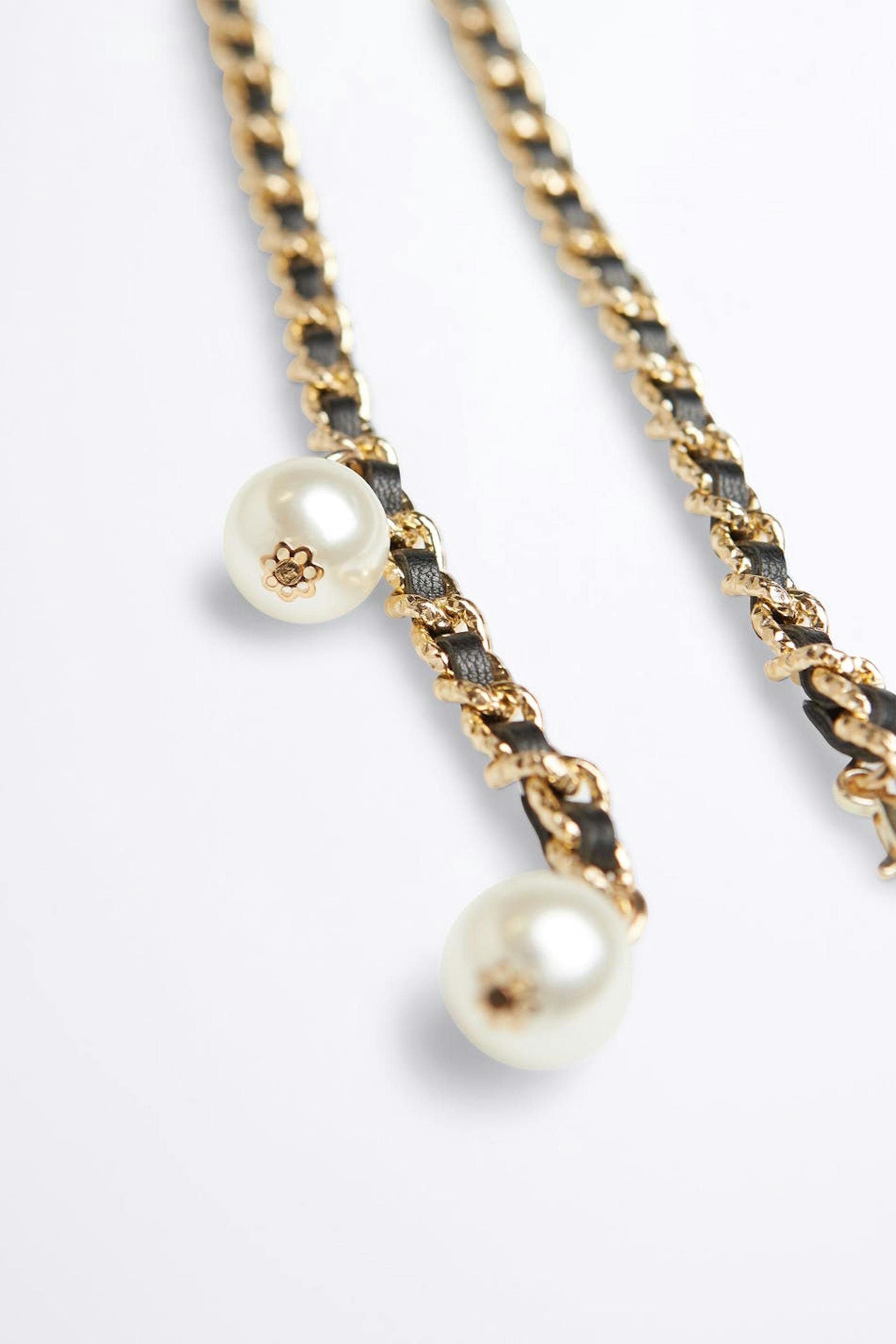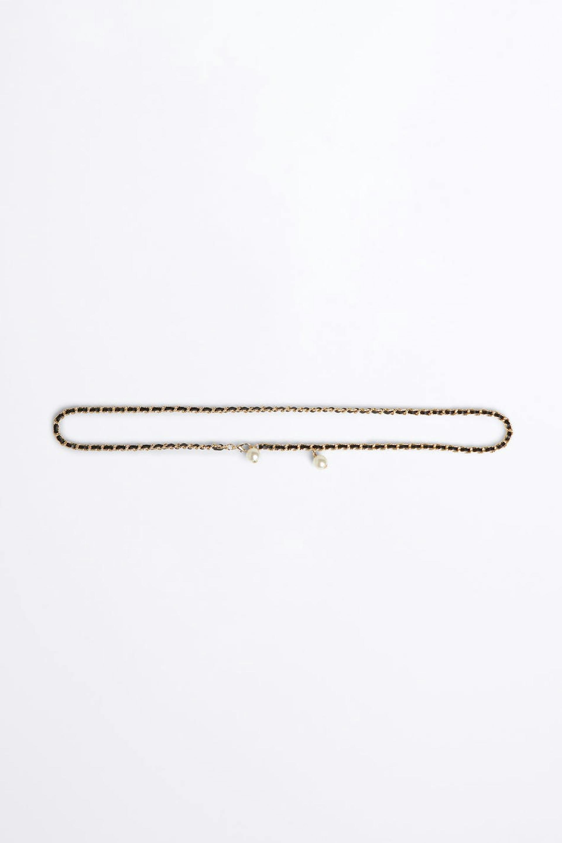 Vyö kultaisella ketjulla. Vyössä on musta nauha. Siinä on helmikoristelut.