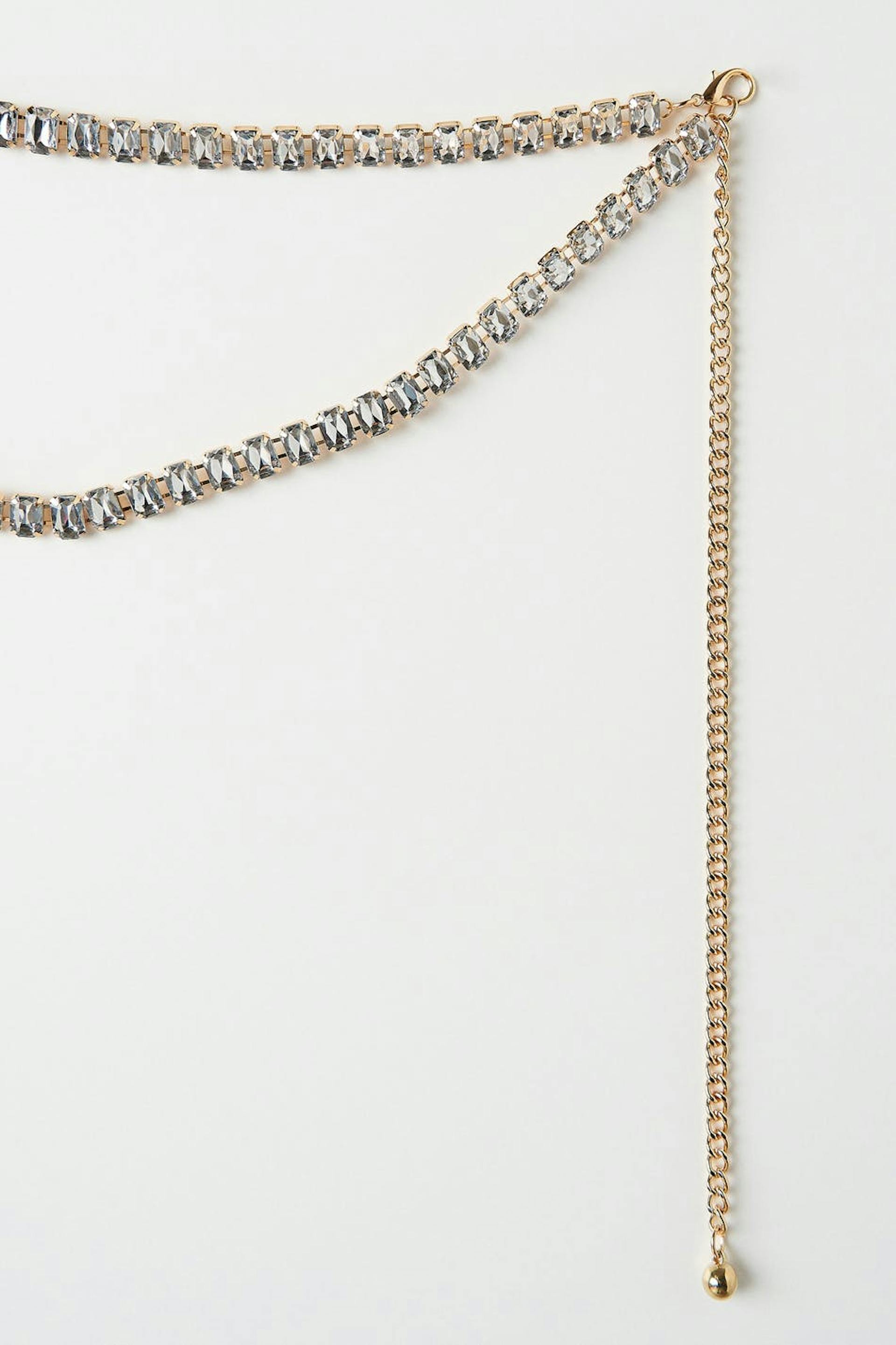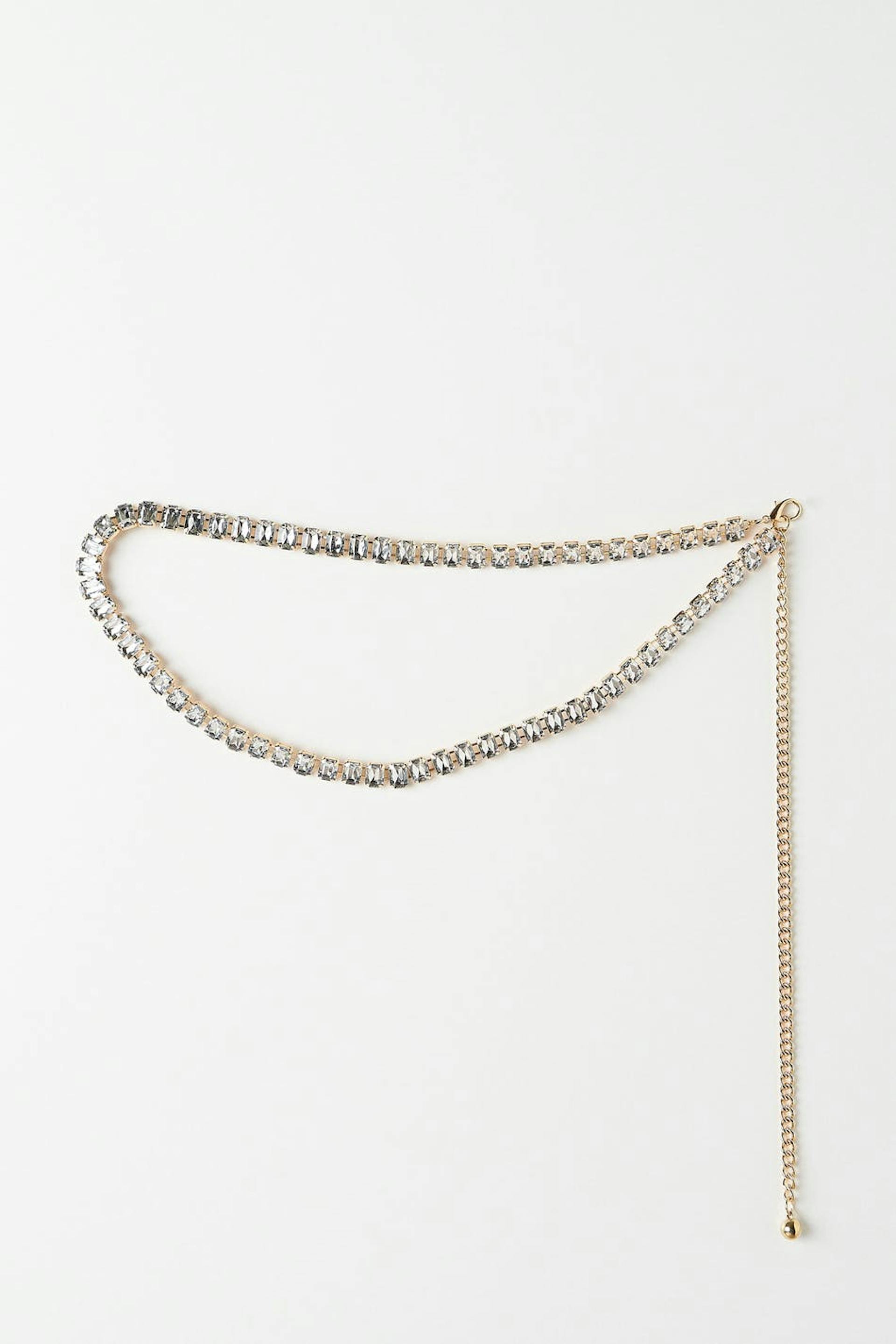 Ketjuvyö tekojalokivillä. Ketju on kultainen ja siinä on kynsilukko.