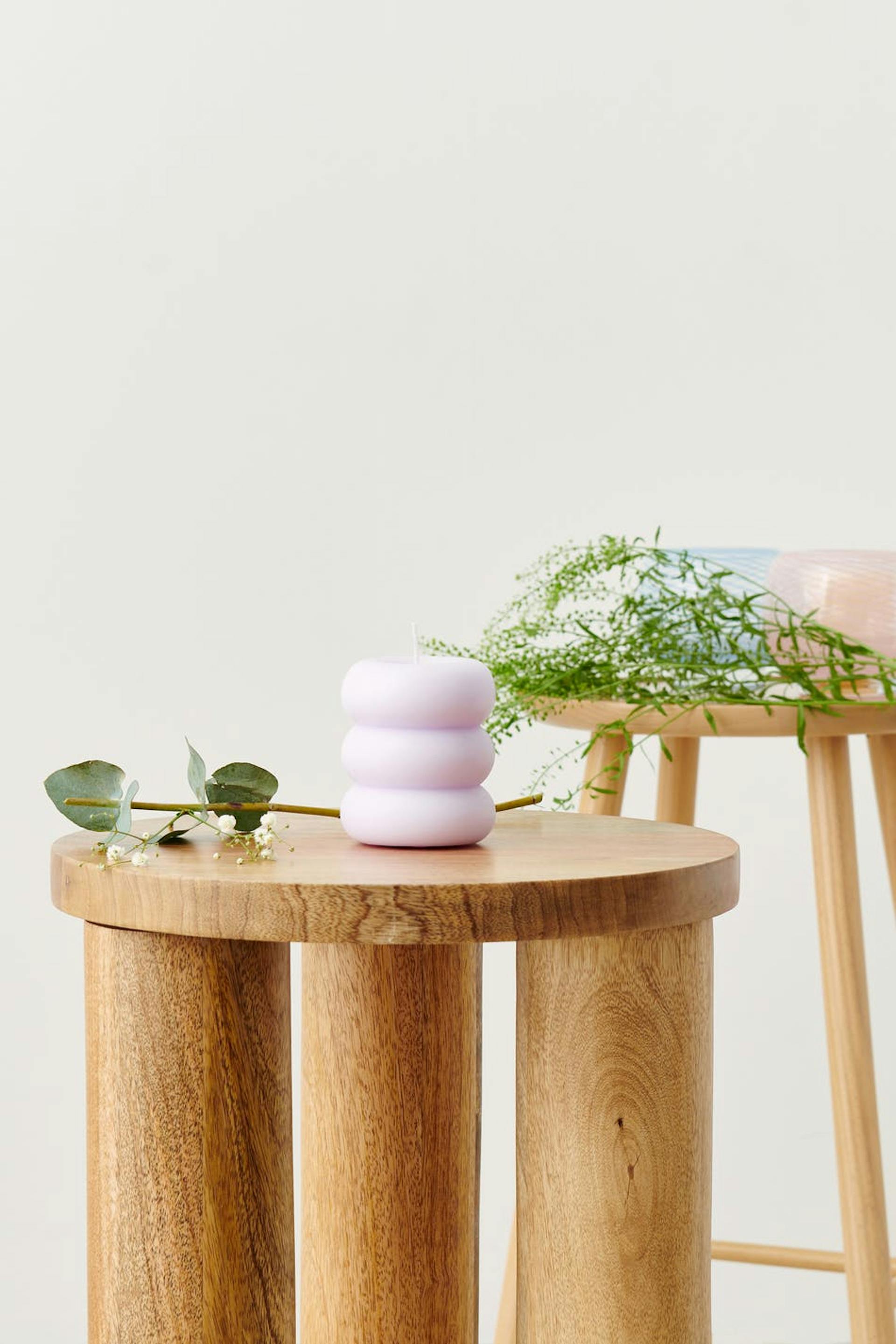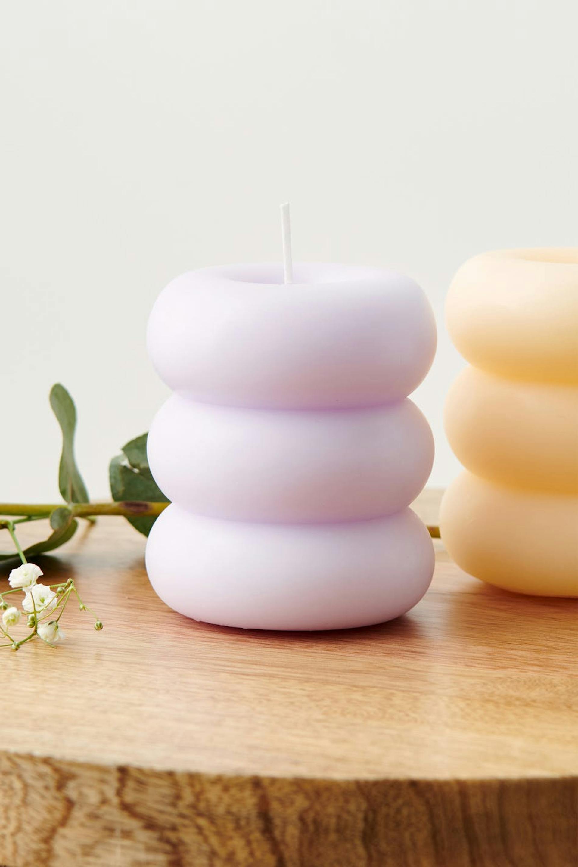 Kynttilä pyörrekuviolla. Kynttilä on liila.