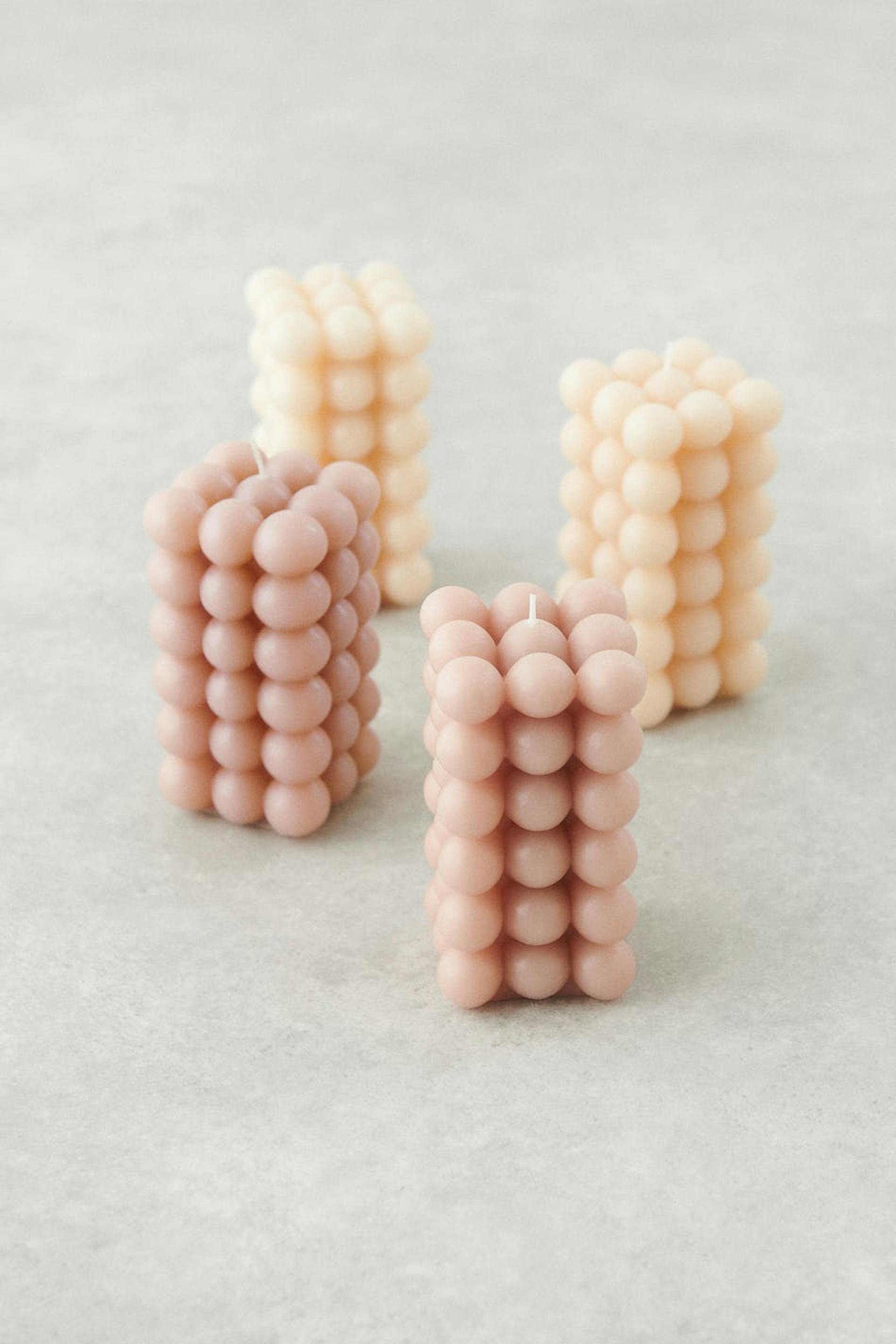 Kulmikas kuplakynttilä Gina Home-tuotemerkiltä sydänlangalla. Kuplakynttilä on beige ja siinä on koristeelliset kuplayksityiskohdat parafiinivahasta.