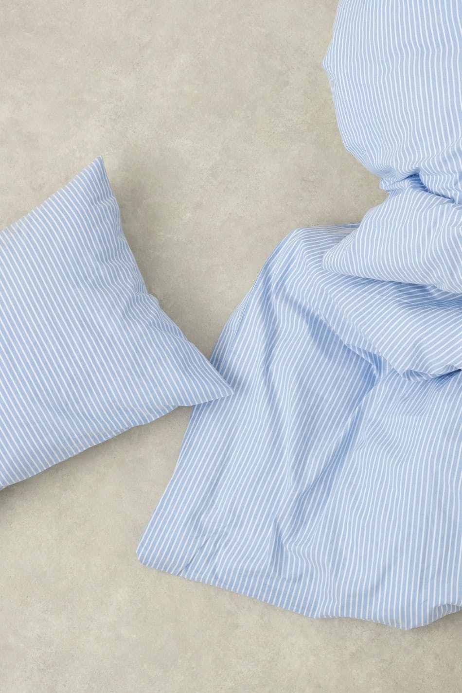 Raidallinen pussilakanasetti Gina Home-tuotemerkiltä pehmeällä materiaalilla puuvillasta. Pussilakanasetti on sininen ja siinä on pussilakana yhteensopivalla tyynynpäällisellä.
