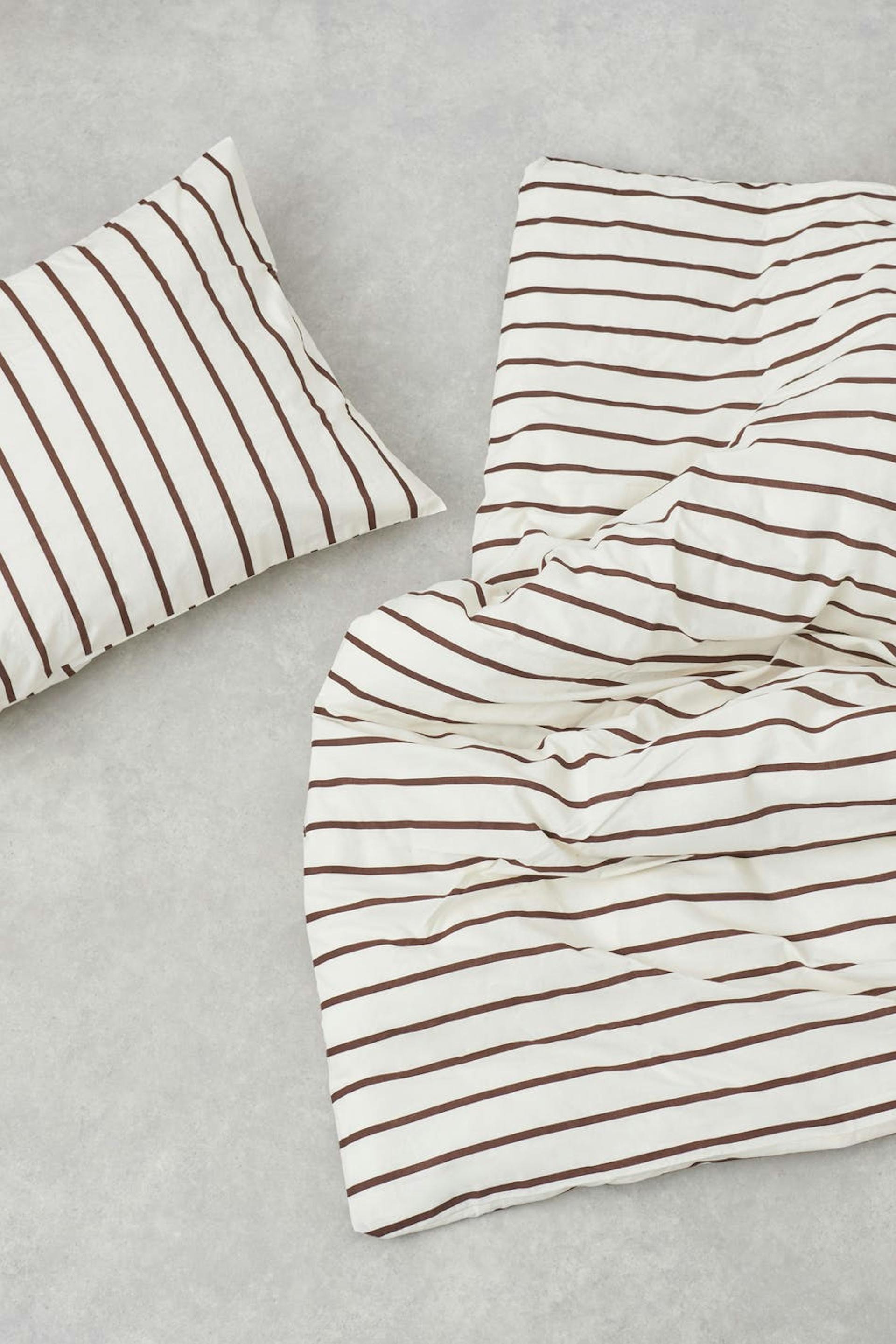 Raidallinen pussilakanasetti Gina Home-tuotemerkiltä pehmeällä materiaalilla puuvillasta. Pussilakanasetti on ruskea ja siinä on pussilakana yhteensopivalla tyynynpäällisellä.
