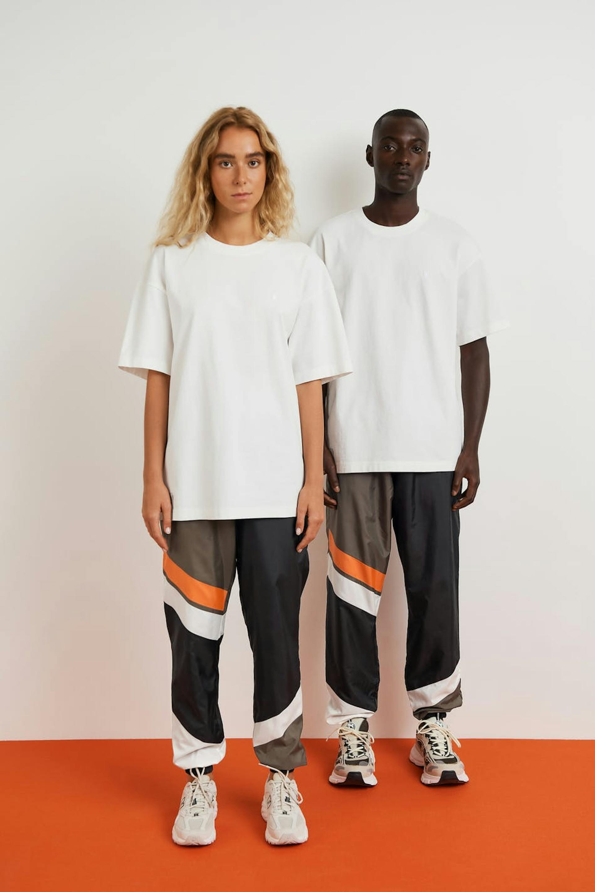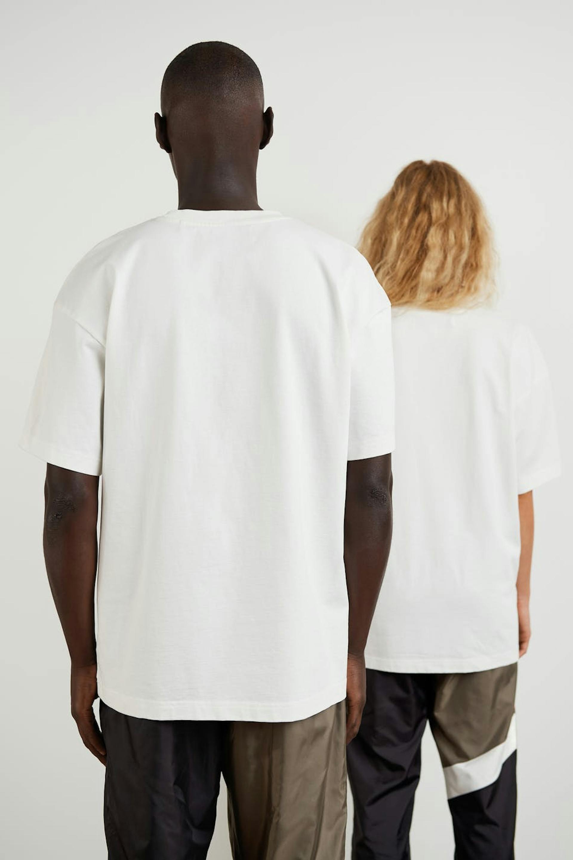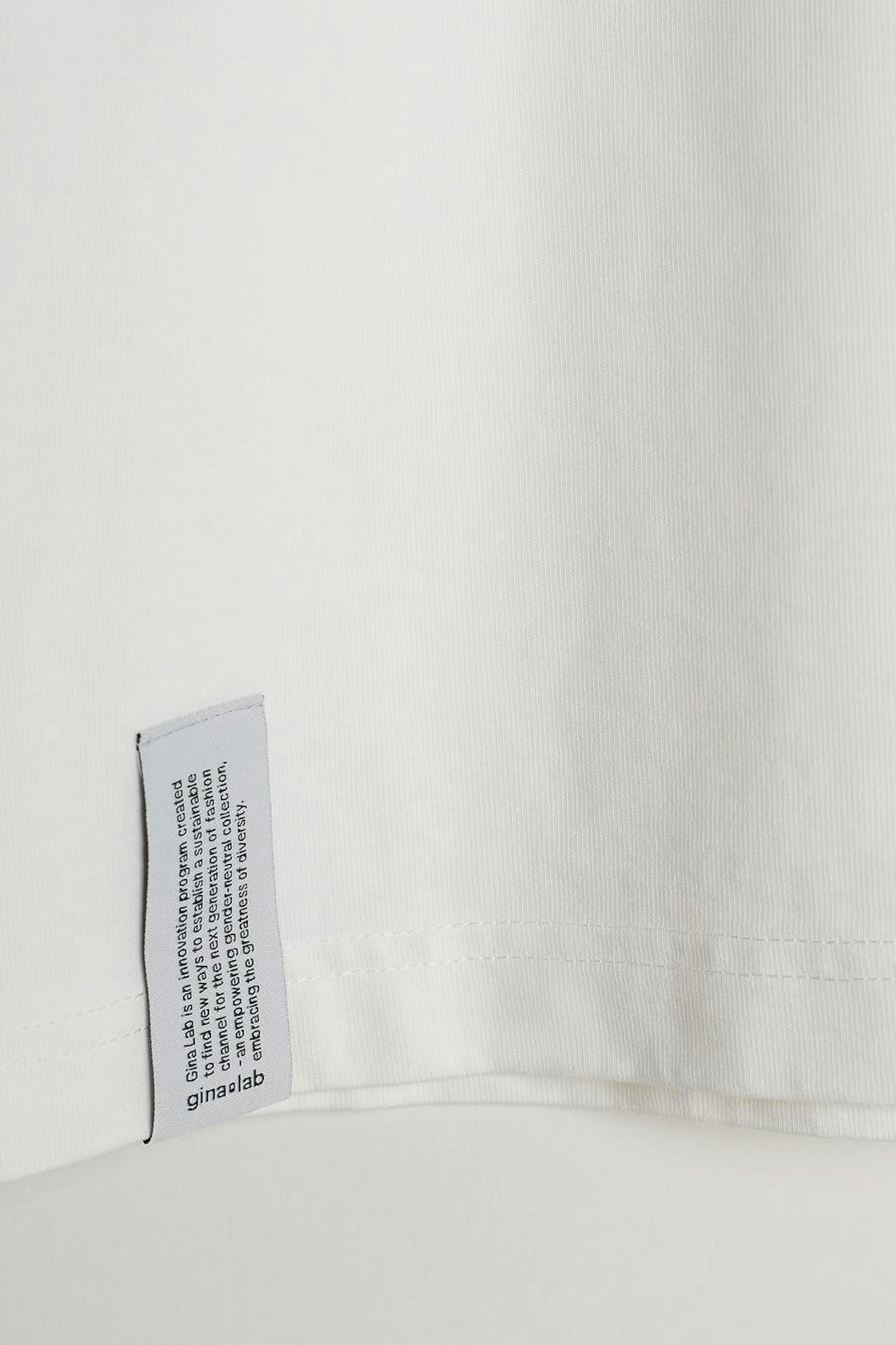 Unisex T-paita Gina Lab-tuotemerkiltä ylisuuri istuvuudella. Valkoinen, lyhythihainen, gender-neutral ja ajaton. Siinä on kirjailtu logo rinnassa ja ribbed mansetti kaula-aukossa.
