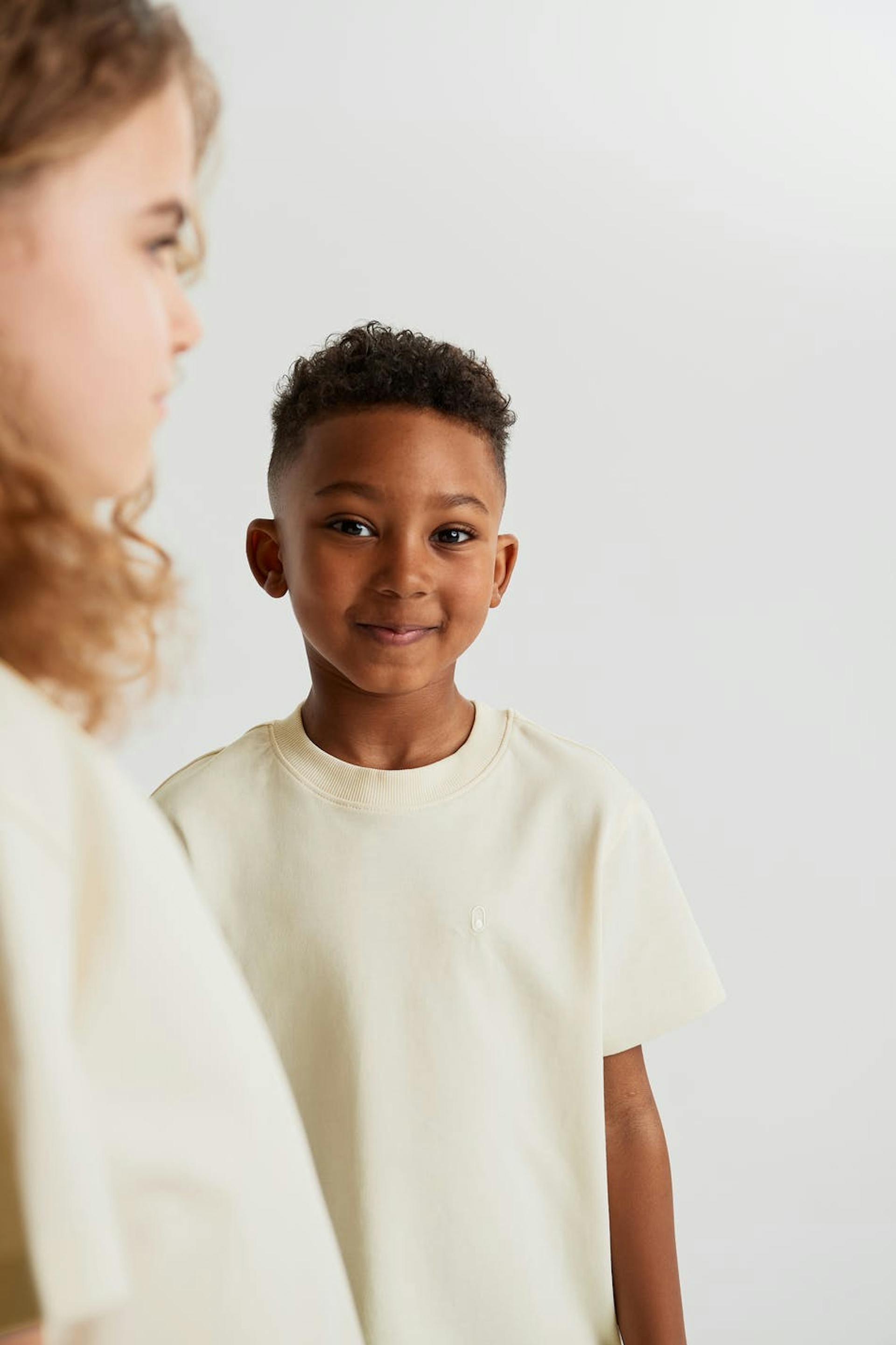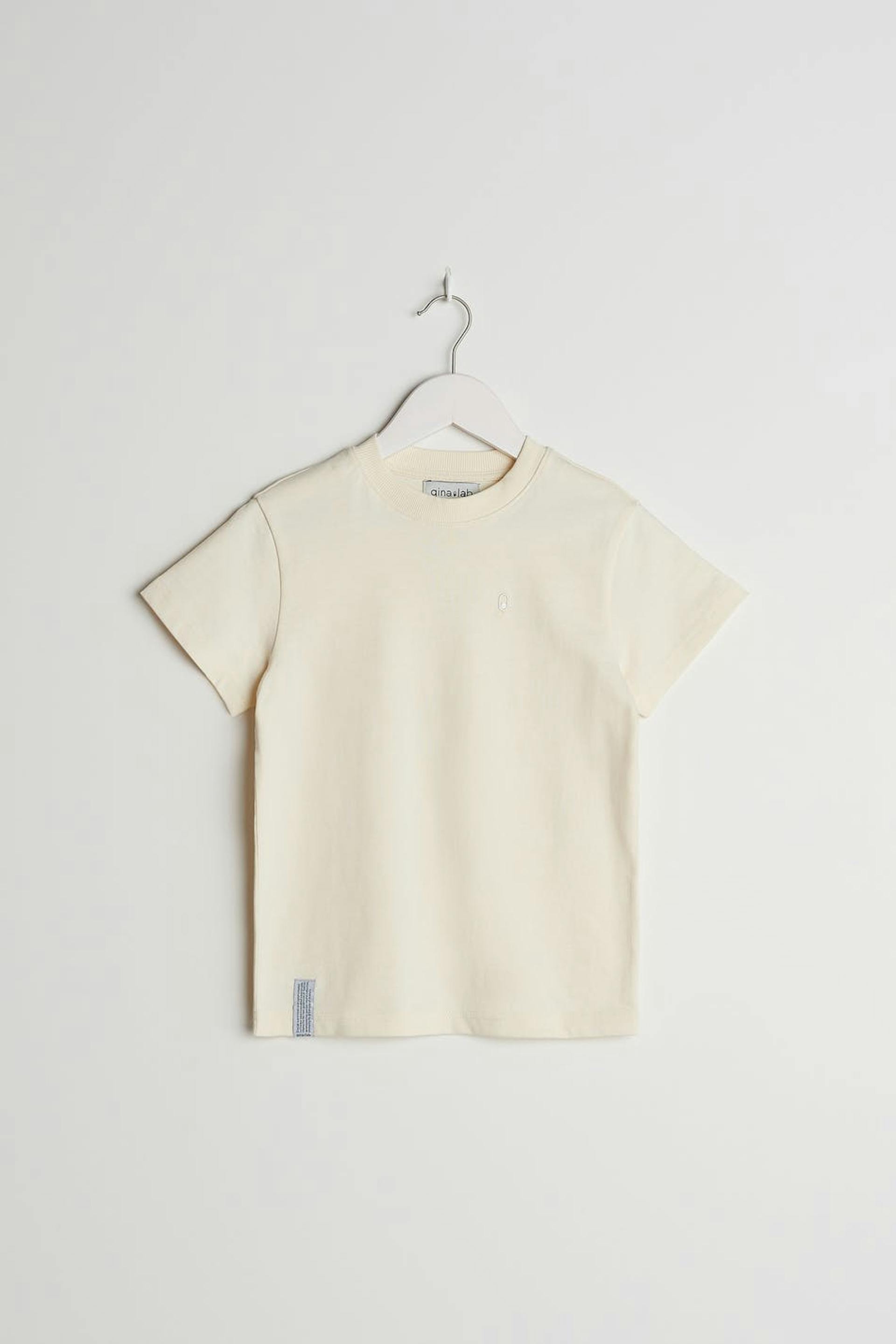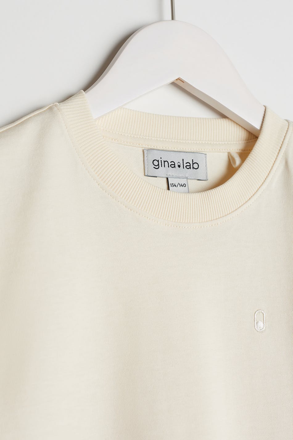 Unisex T-paita Gina Lab-tuotemerkiltä lapsille ylisuuri istuvuudella. T-paita on vaaleanbeige ja gender-neutral ja siinä on ribbed mansetti kaula-aukossa. Siinä on pieni, kirjailtu logo rinnassa.
