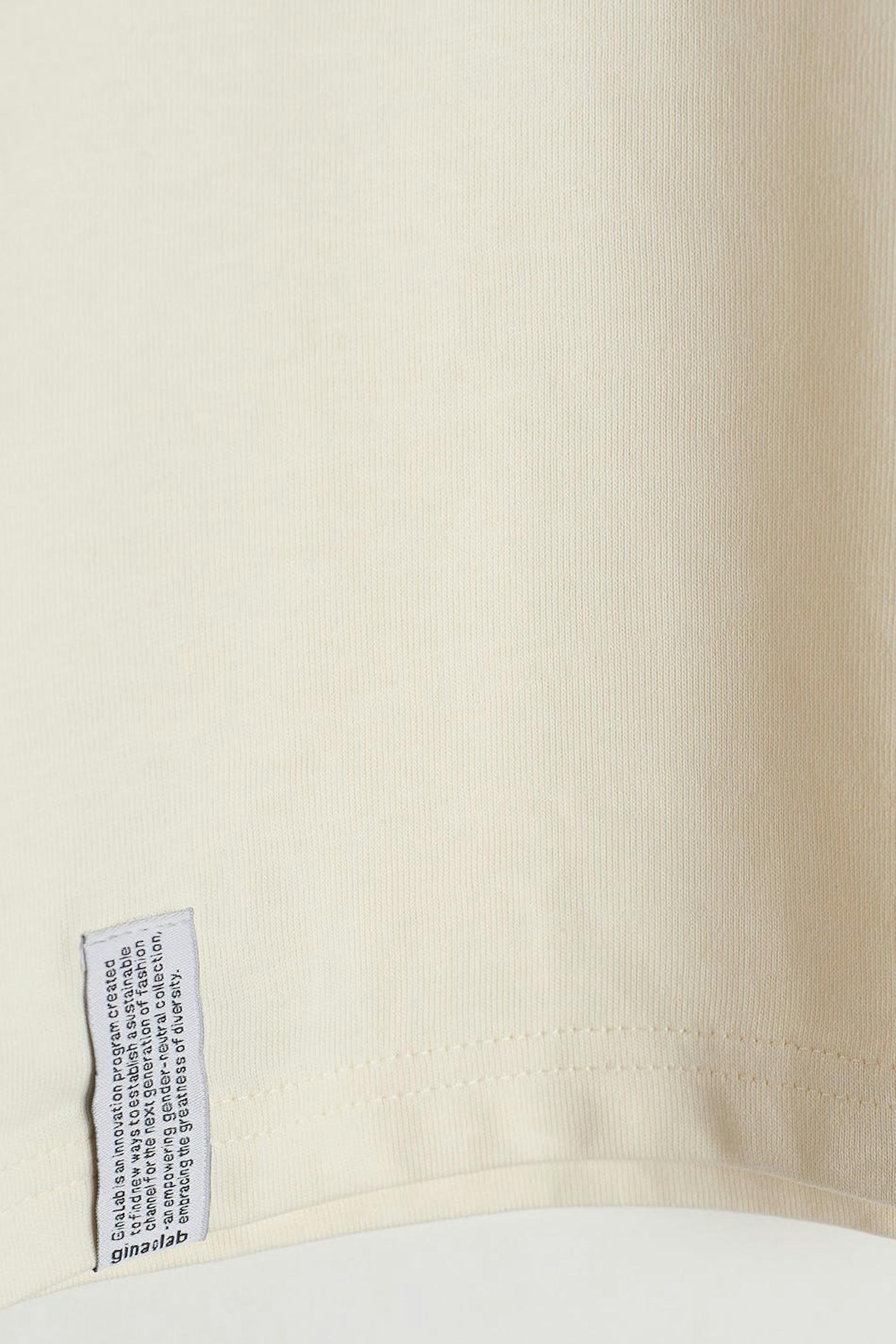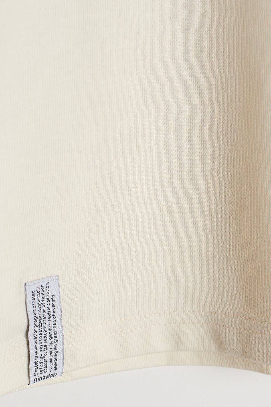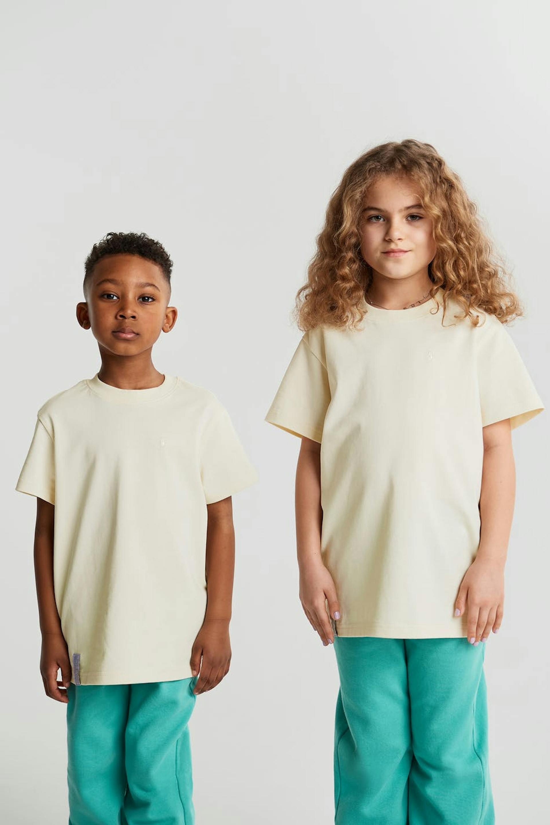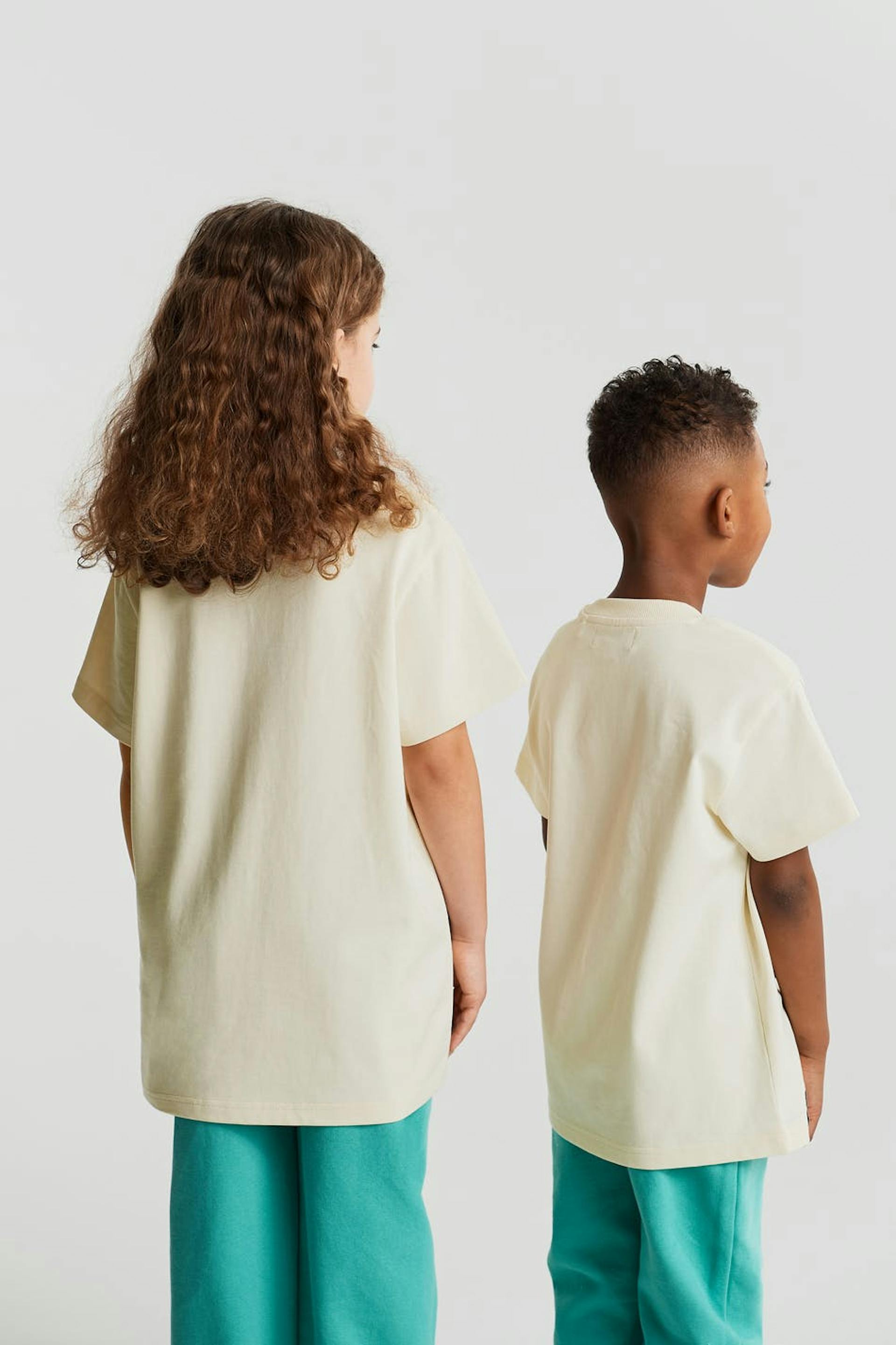 Unisex T-paita Gina Lab-tuotemerkiltä lapsille ylisuuri istuvuudella. T-paita on vaaleanbeige ja gender-neutral ja siinä on ribbed mansetti kaula-aukossa. Siinä on pieni, kirjailtu logo rinnassa.