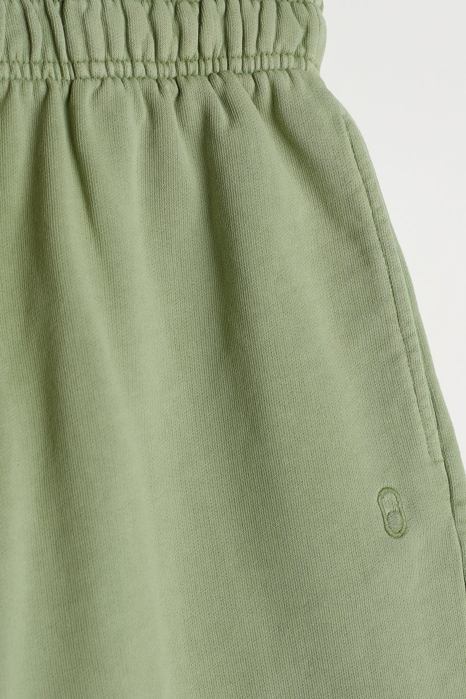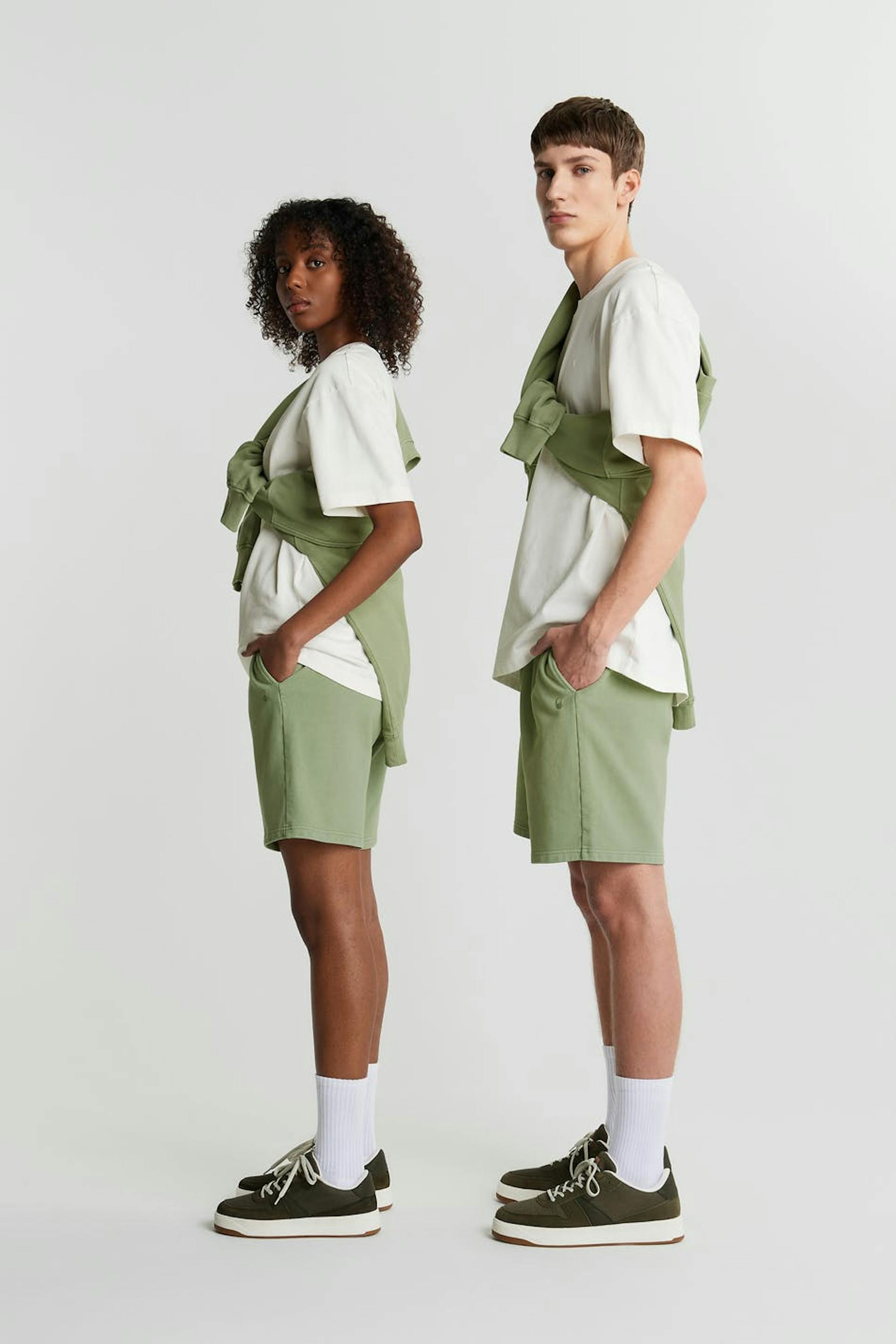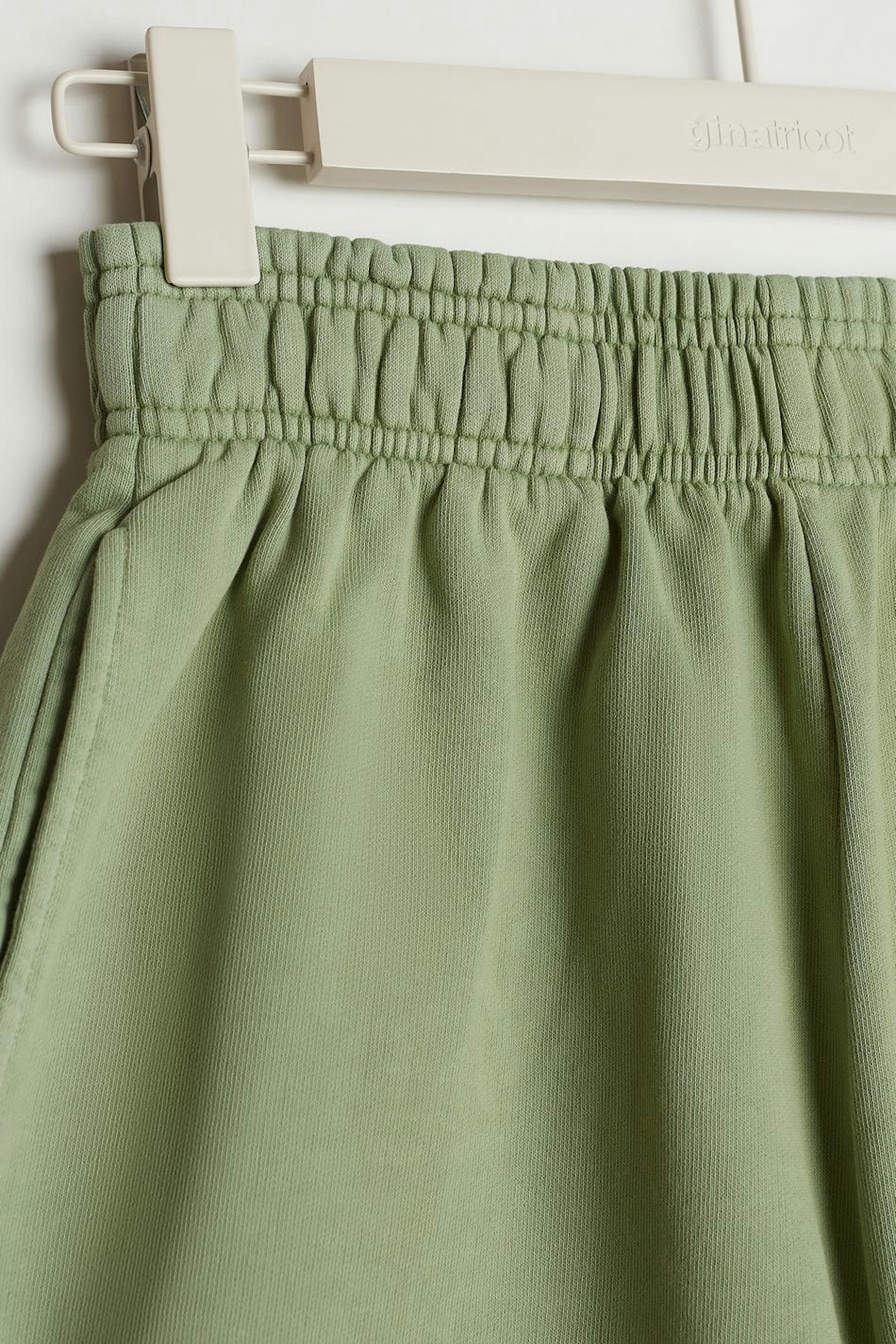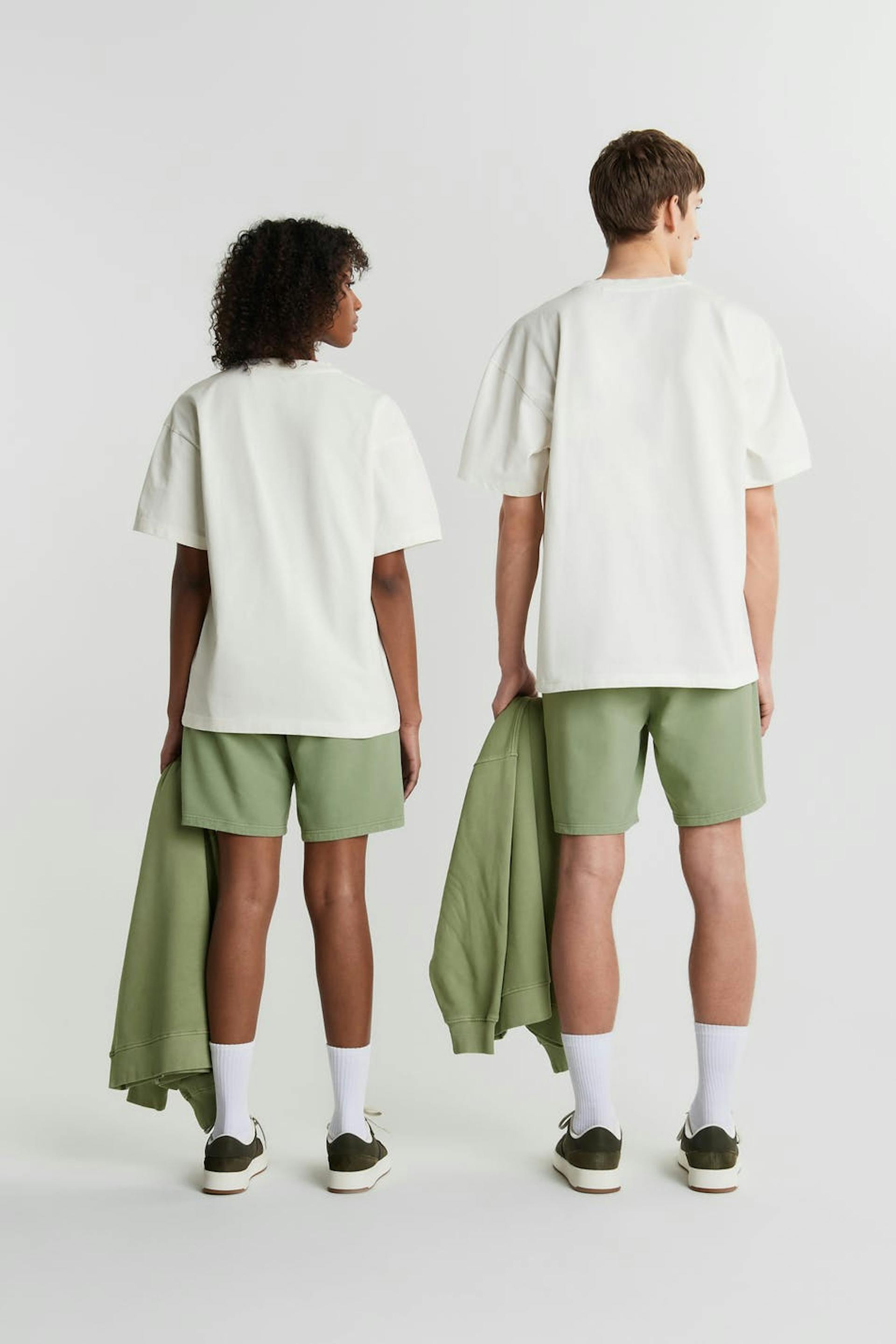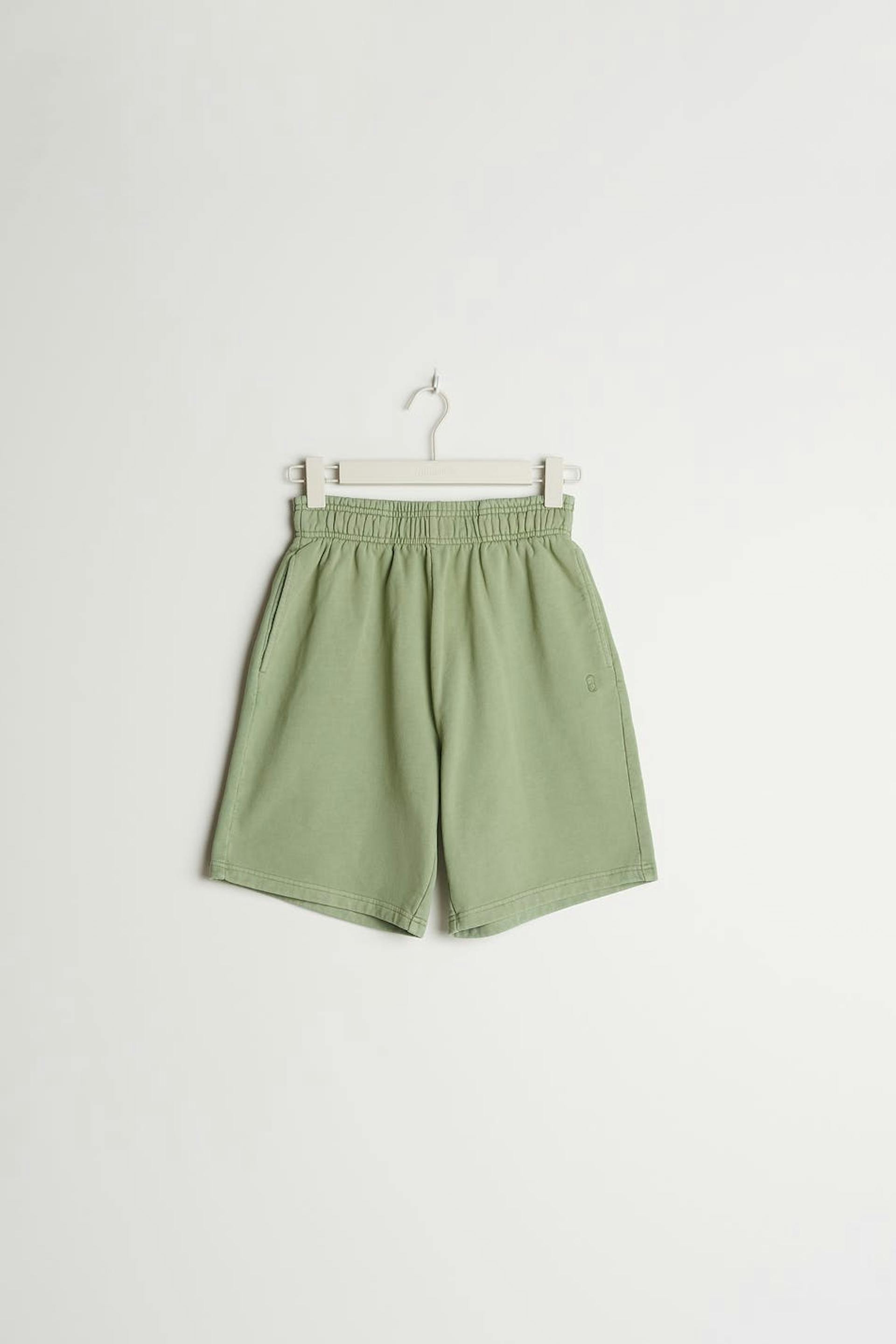Unisex shortsit Gina Lab-tuotemerkiltä ylisuuri istuvuudella. Shortsit ovat vihreitä, pehmeitä ja gender-neutraleja. Niissä on taskut sivuissa, pehmeä elastinen vyötäröllä ja pieni, kirjailtu logo yhdellä sivulla. GOTS certified, Mineral dye.