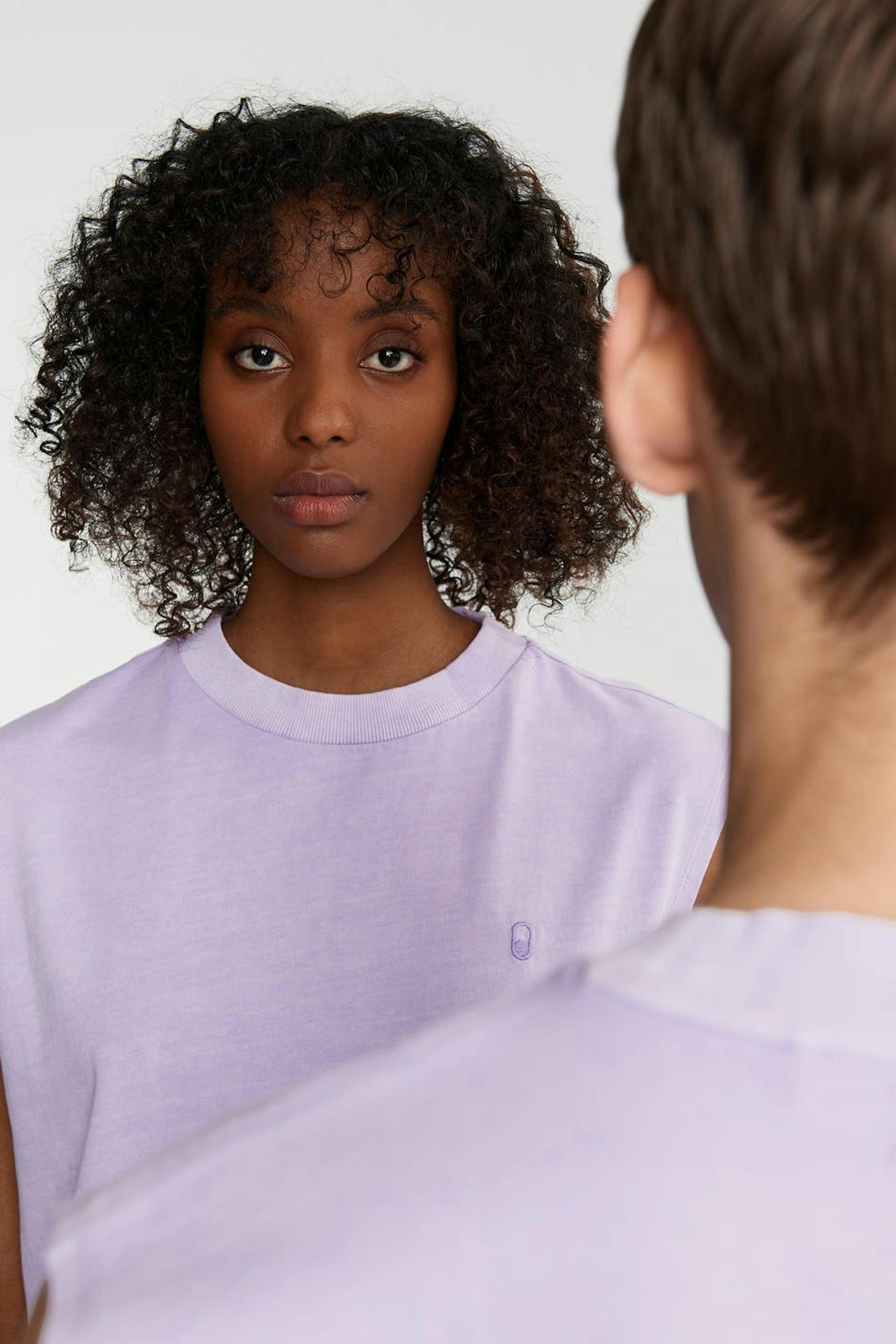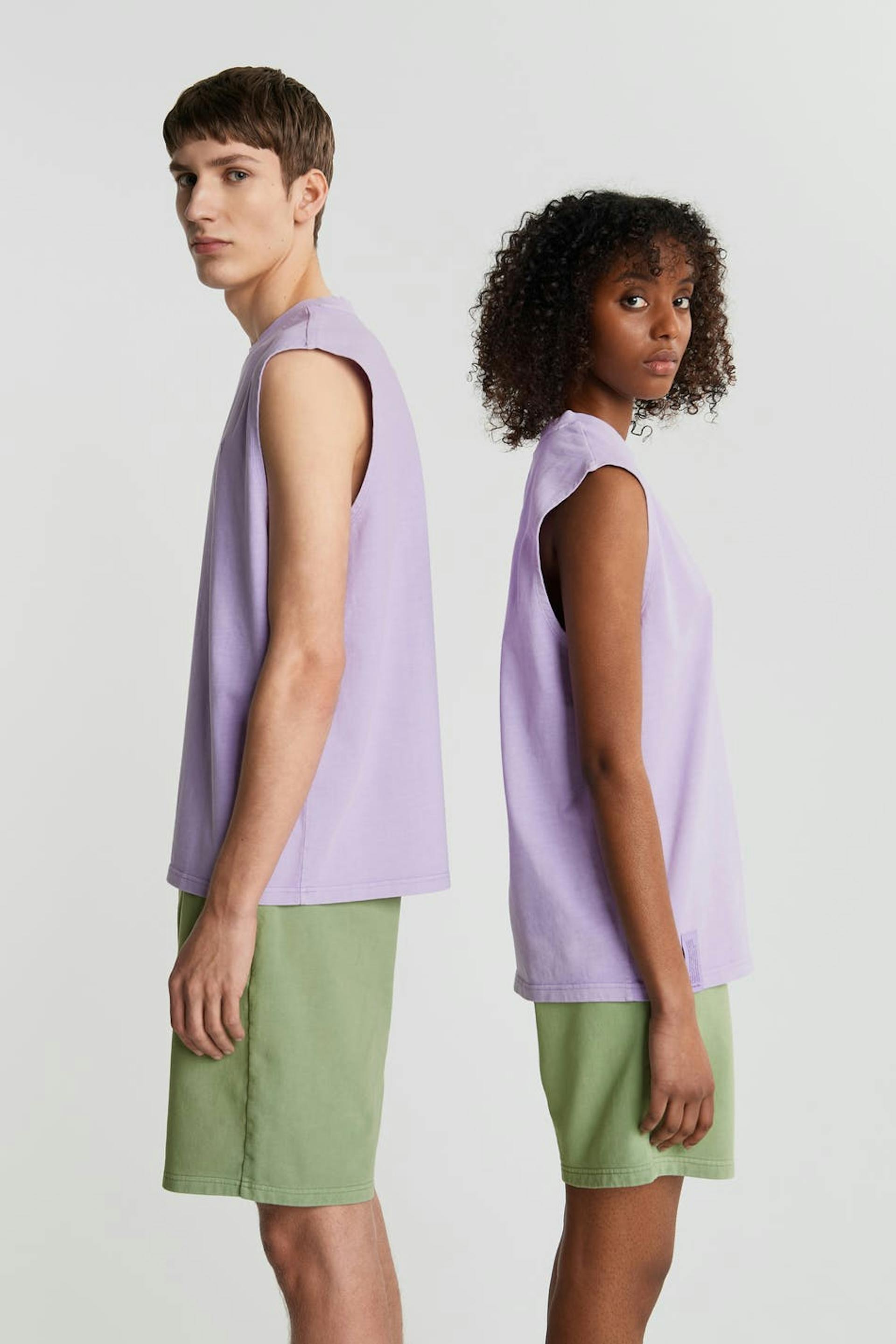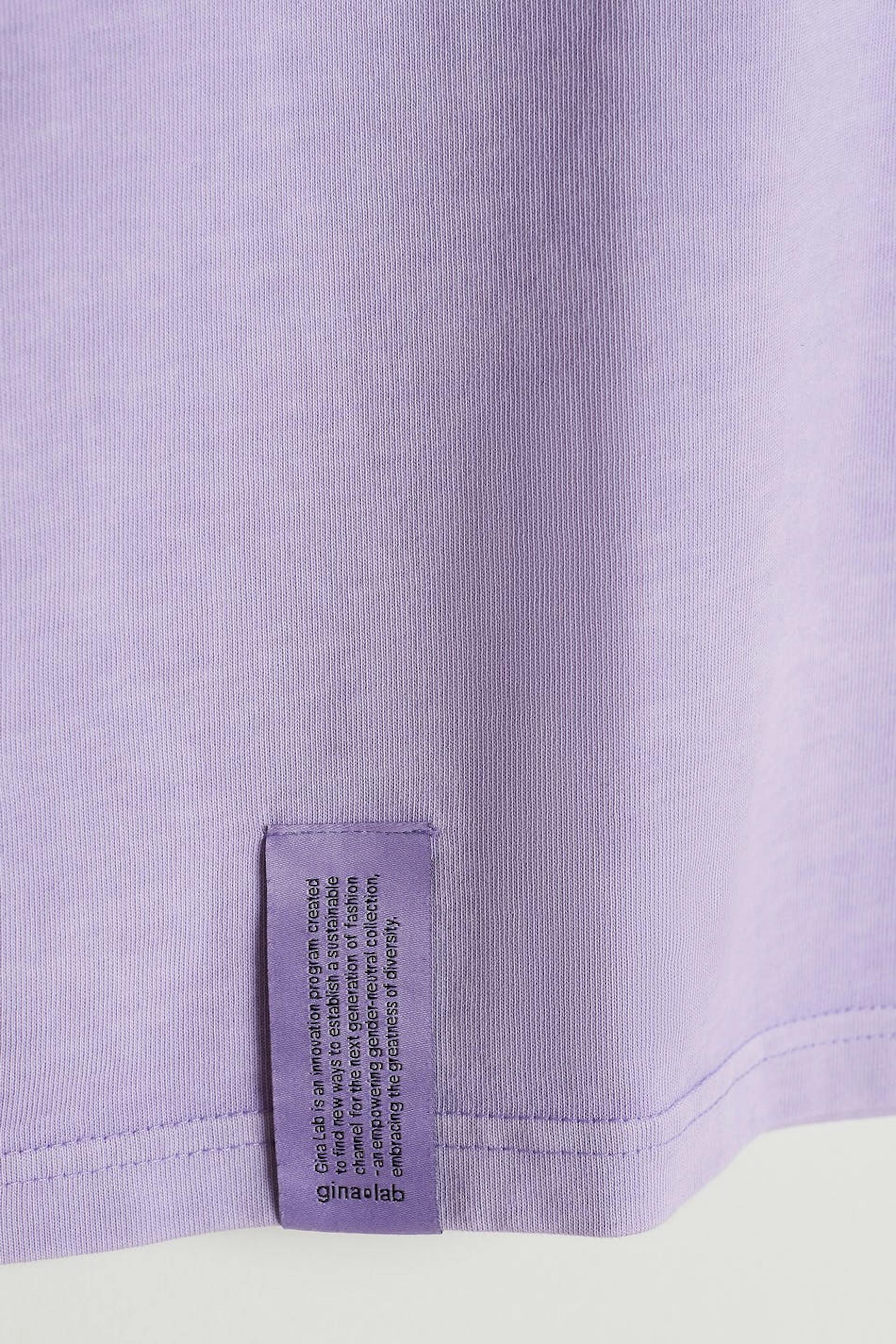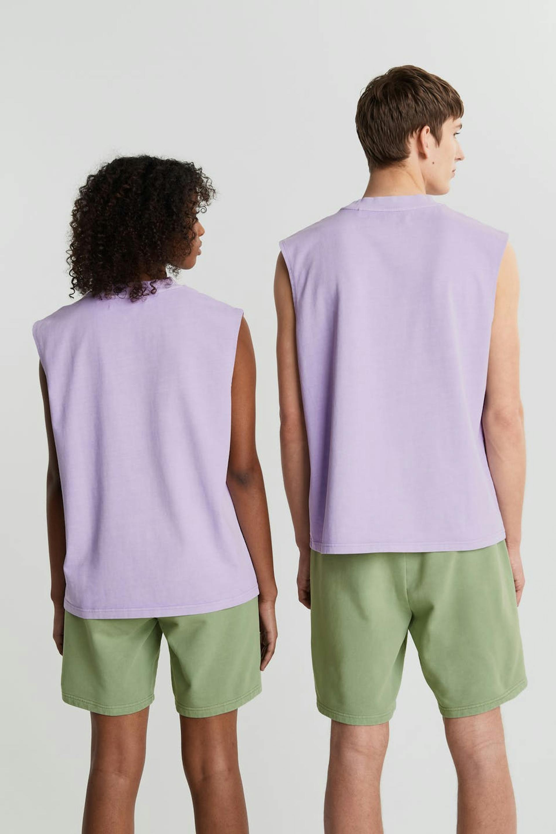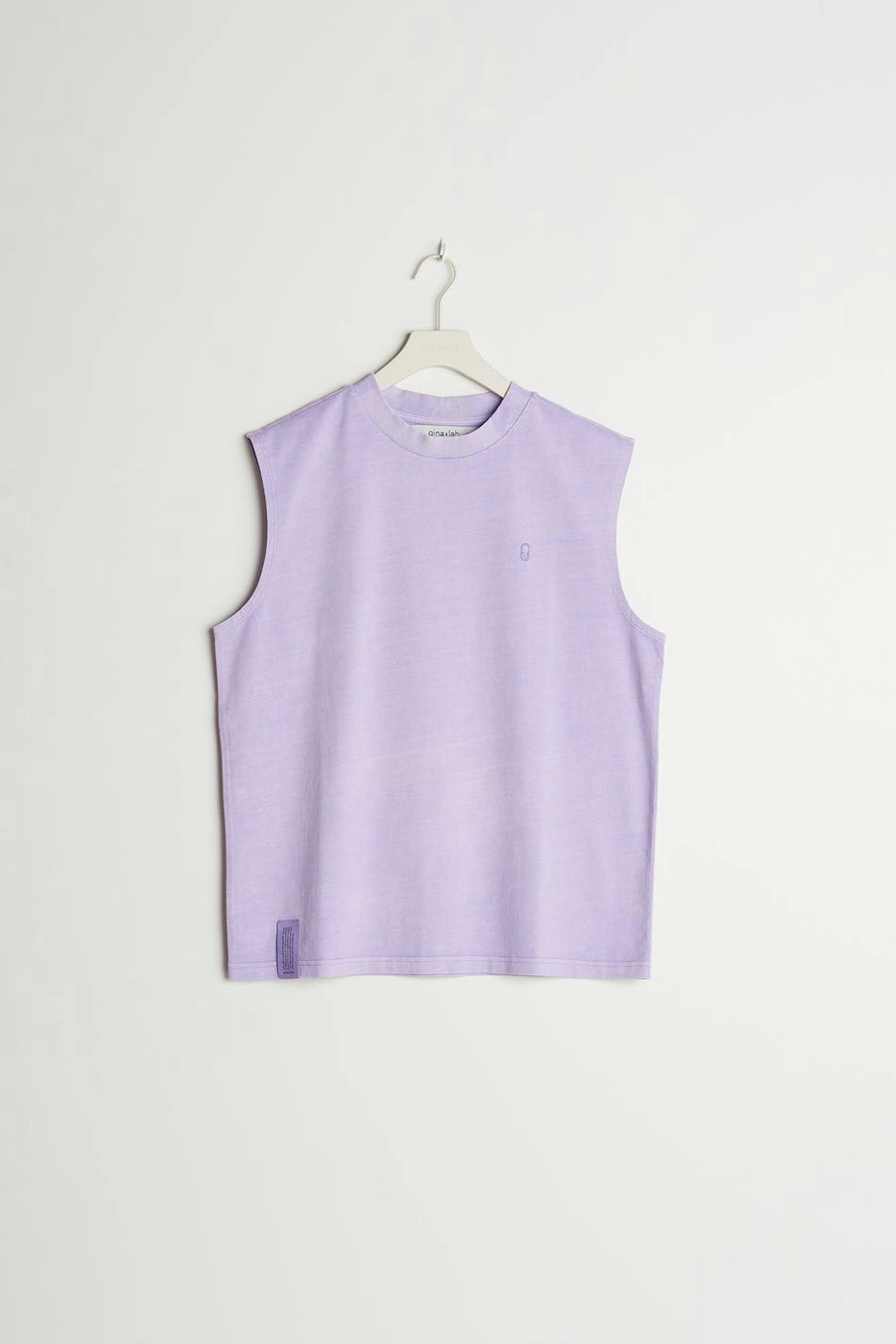 Unisex toppi Gina Lab-tuotemerkiltä suoralla, ylisuurella istuvuudella. Toppi on liila, gender-neutral ja hihaton. Siinä on logo rinnassa. GOTS certified, Mineral dye.