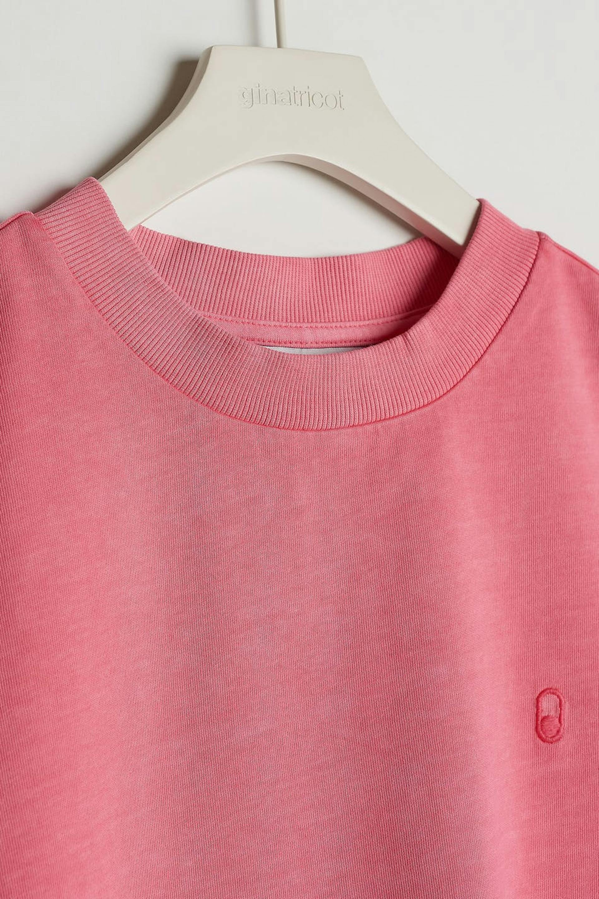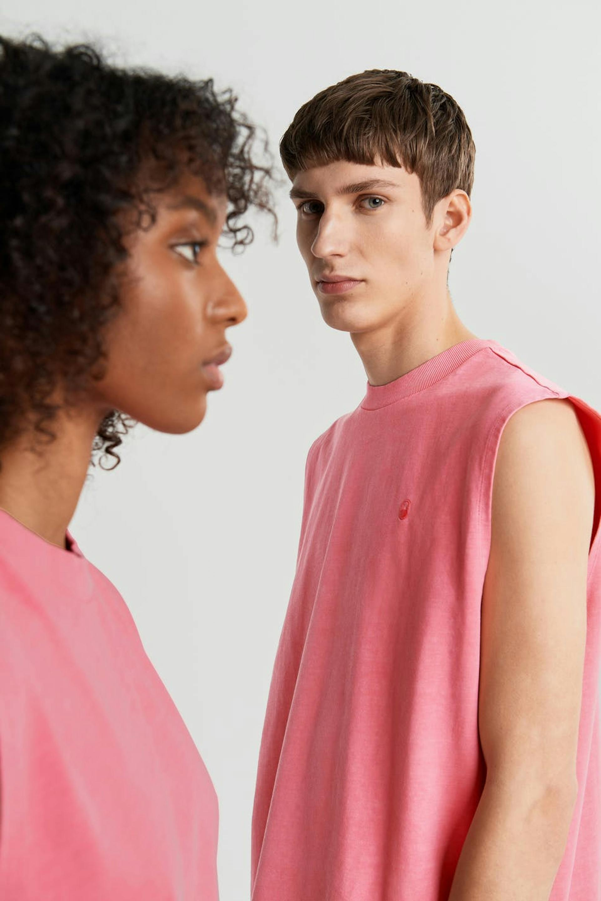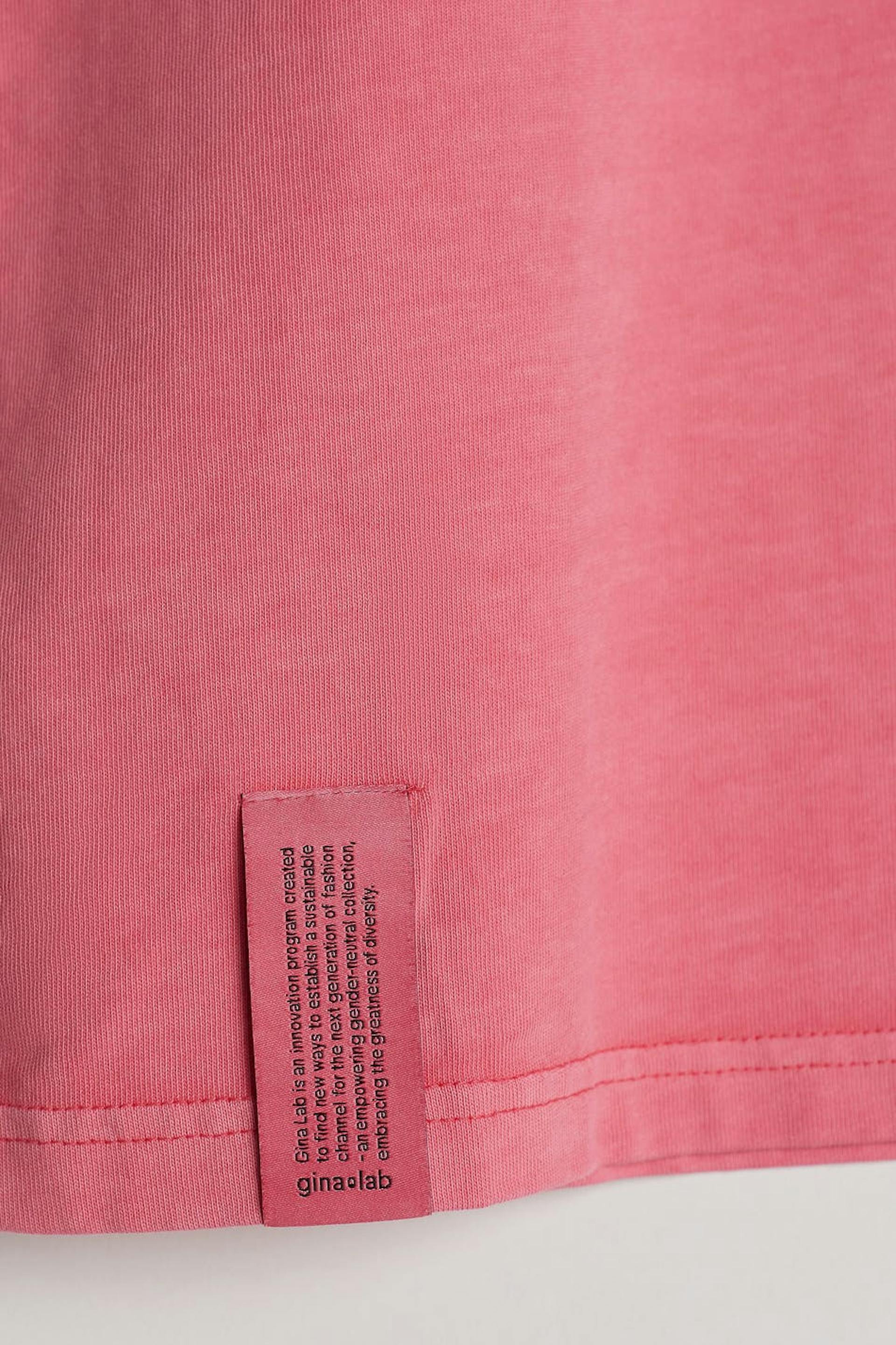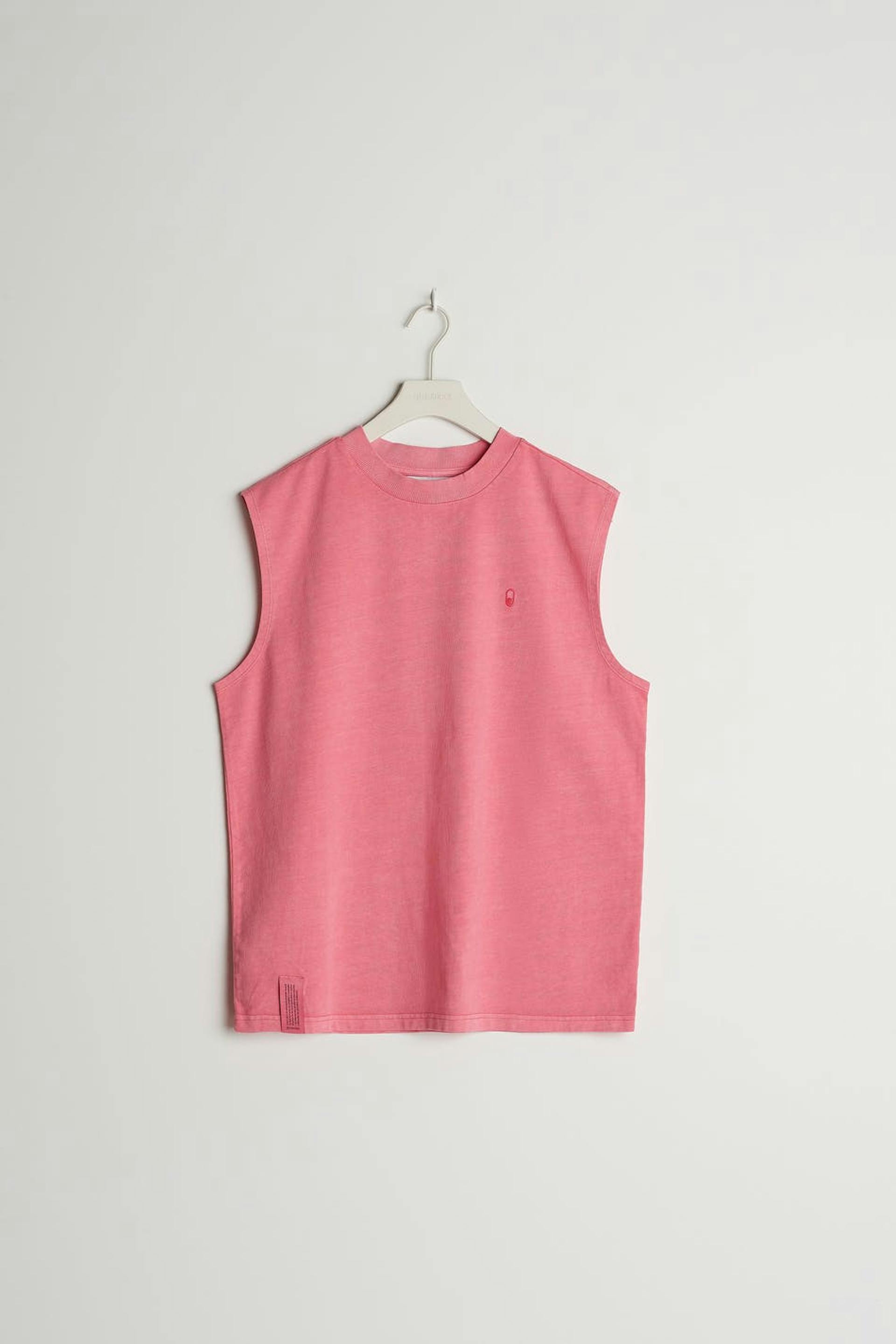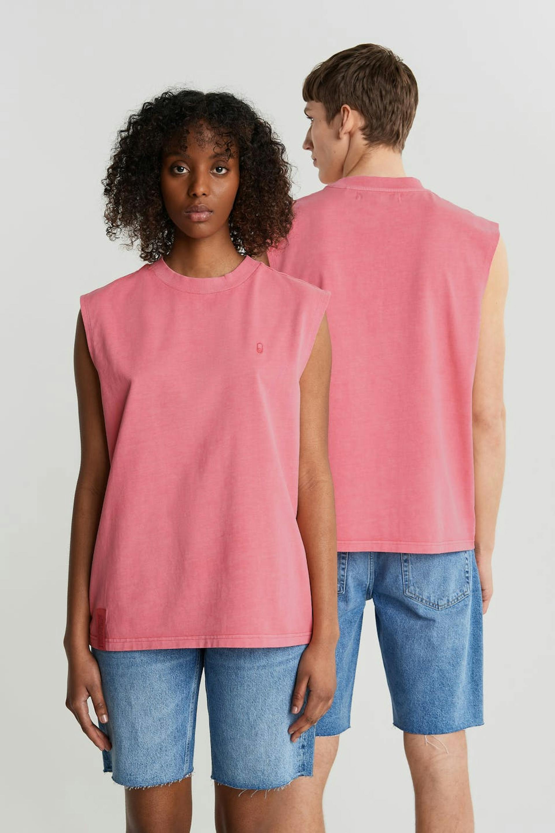 Unisex toppi Gina Lab-tuotemerkiltä suoralla, ylisuurella istuvuudella. Toppi on pinkki, gender-neutral ja hihaton. Siinä on logo rinnassa. GOTS certified, Mineral dye.
