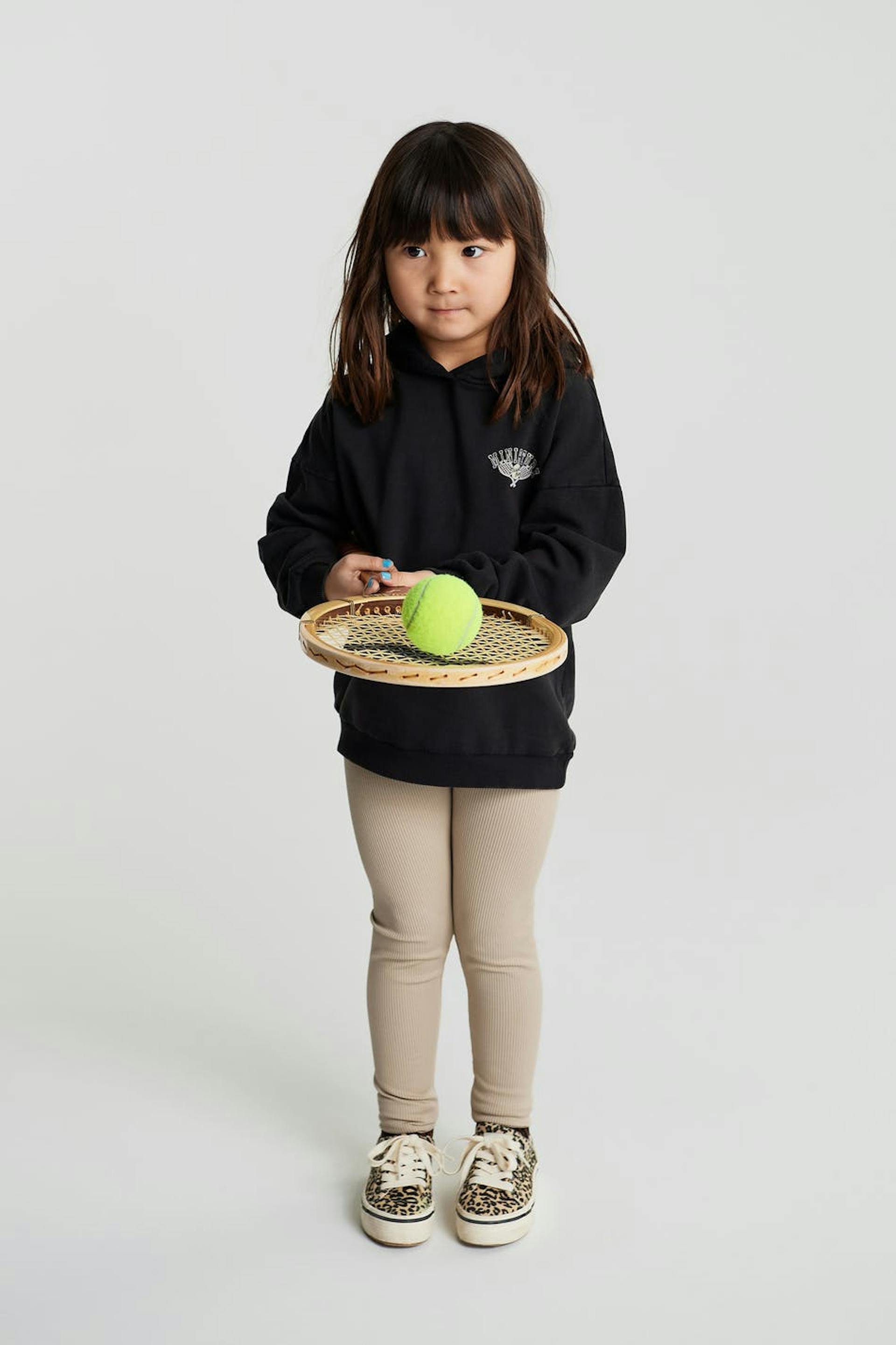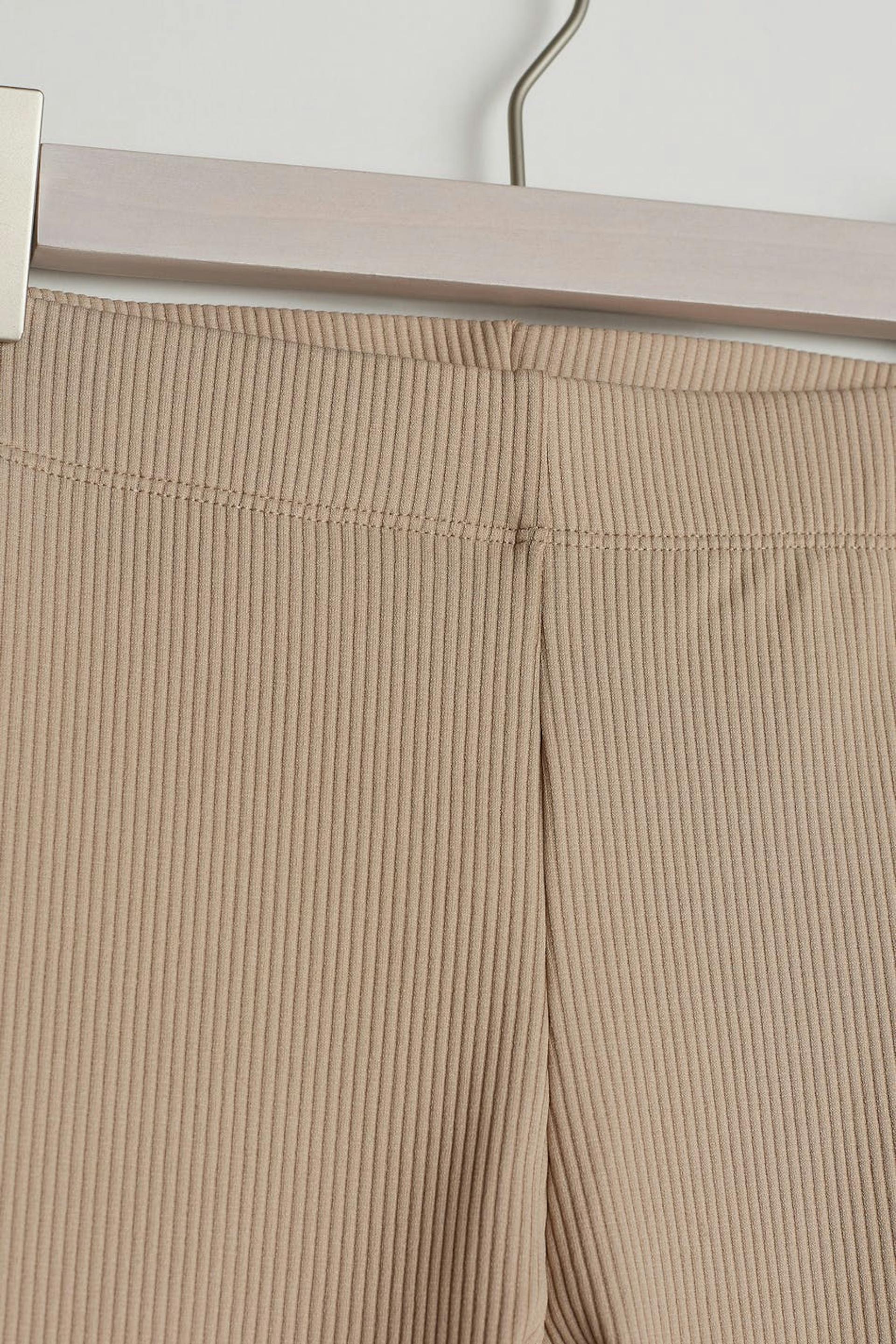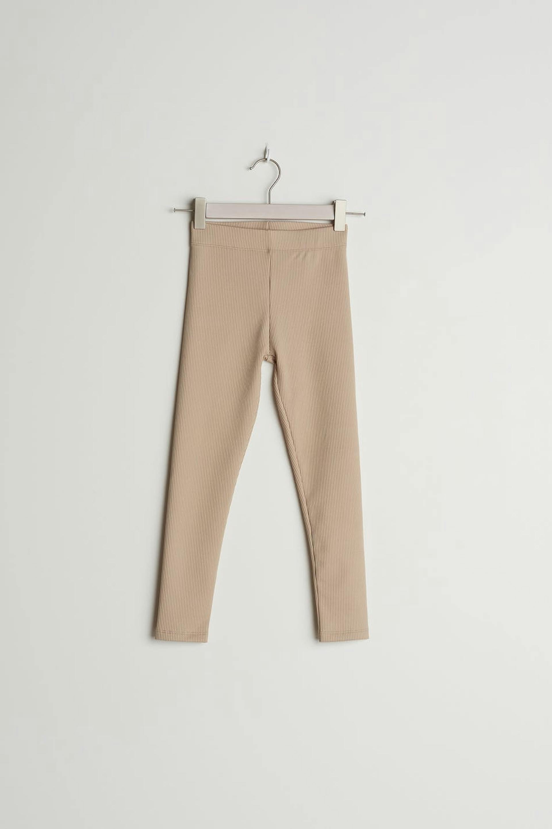 Pehmeät legginsit lapsille vartalonmyötäisellä istuvuudella. Legginsit ovat beigejä, unisex ja resorimaisia. Niissä on kuminauha vyötäröllä.