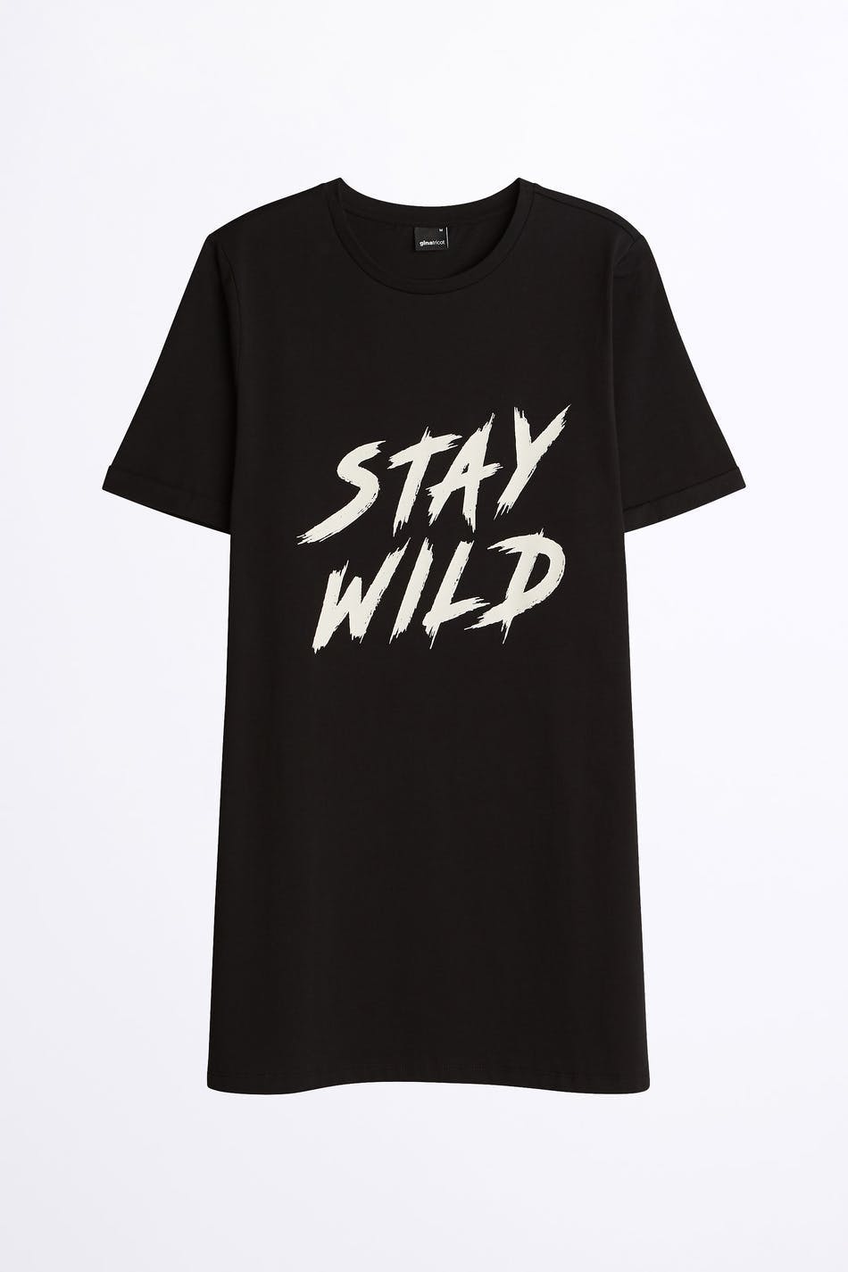 T-paitamekko ylisuuri istuvuudella. Mekko on musta ja siinä on printti tekstillä.