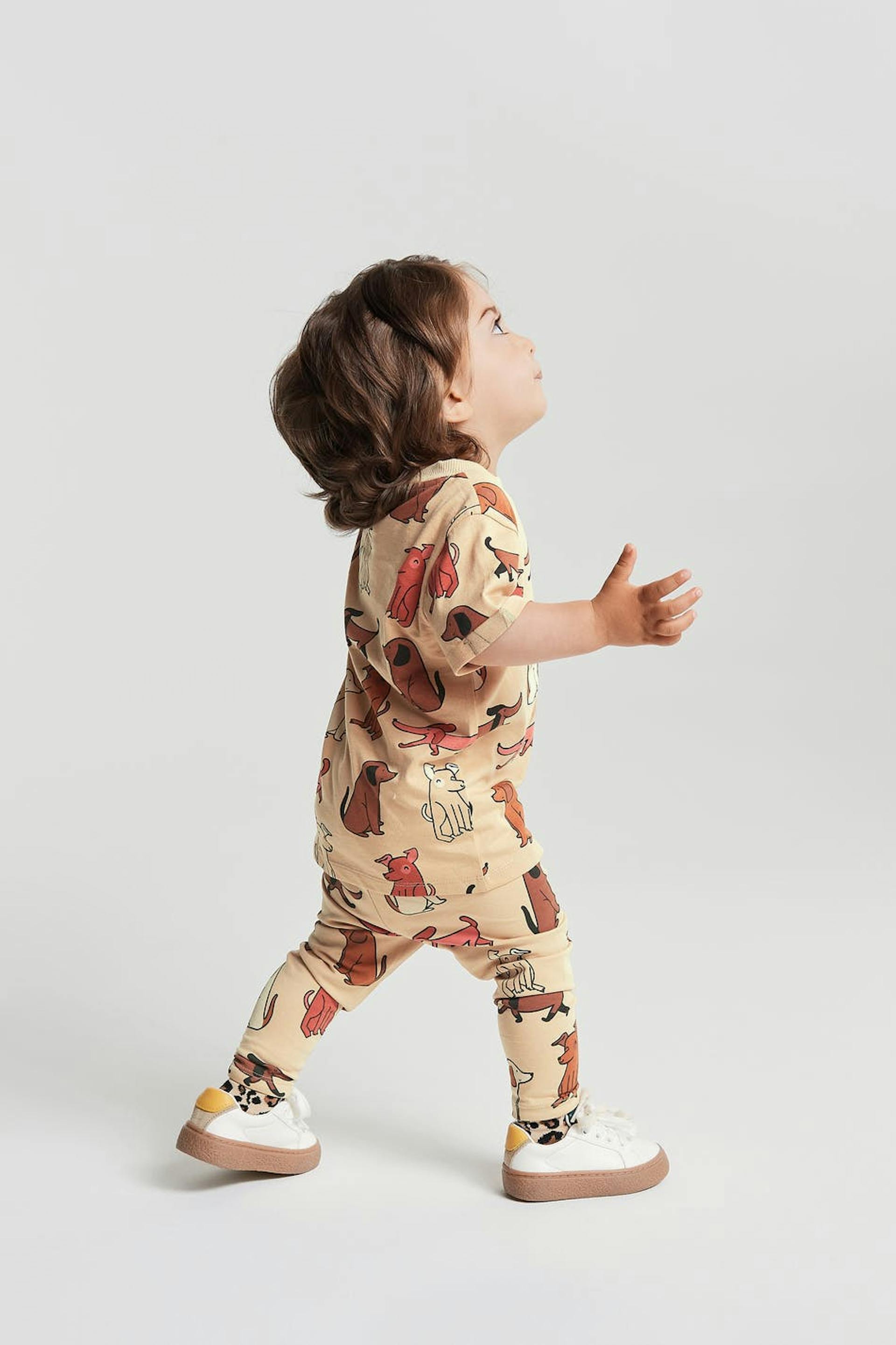 Unisex legginsi vauvoille kuvioinnilla. Legginsi on beige. Se valmistetaan trikoosta.