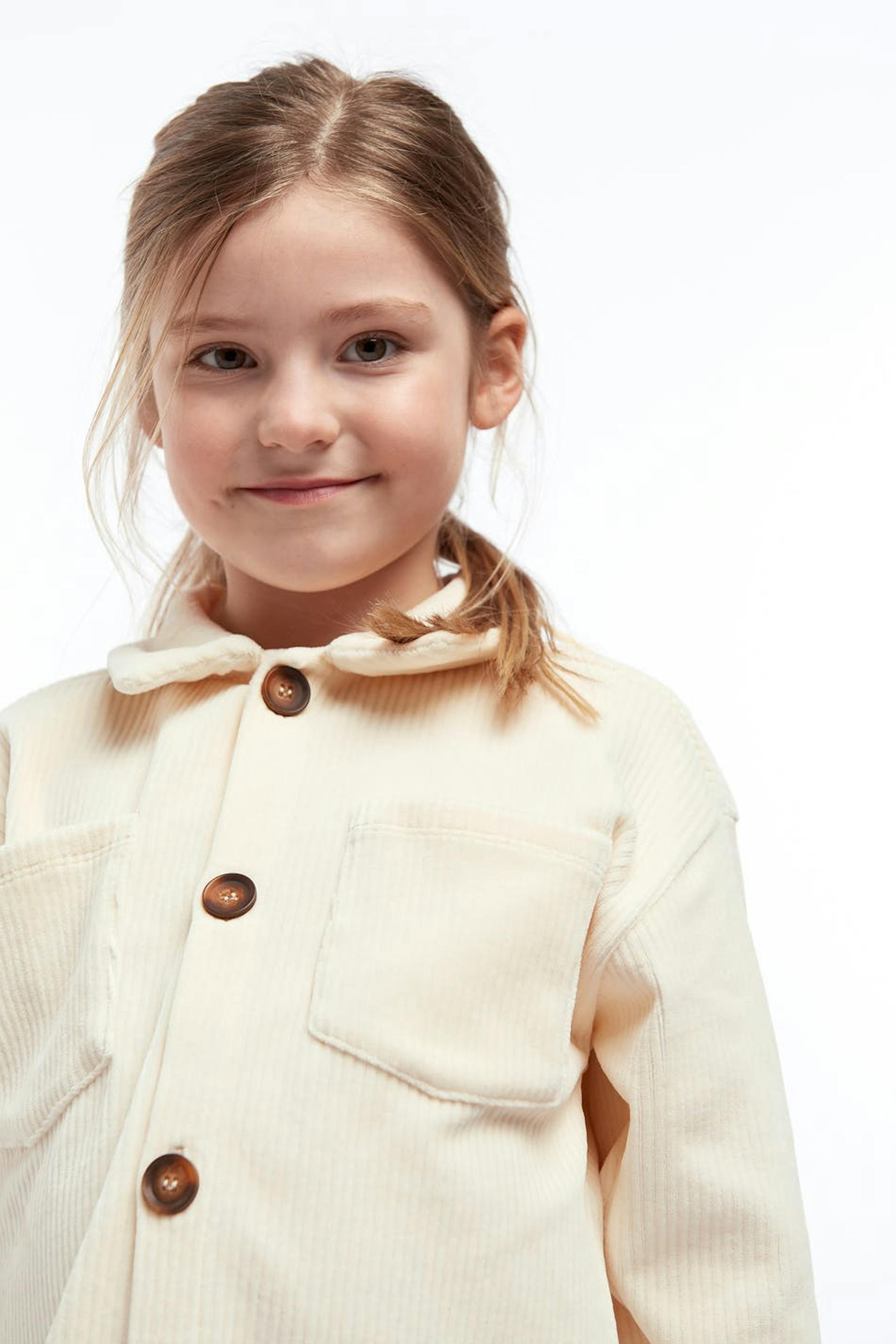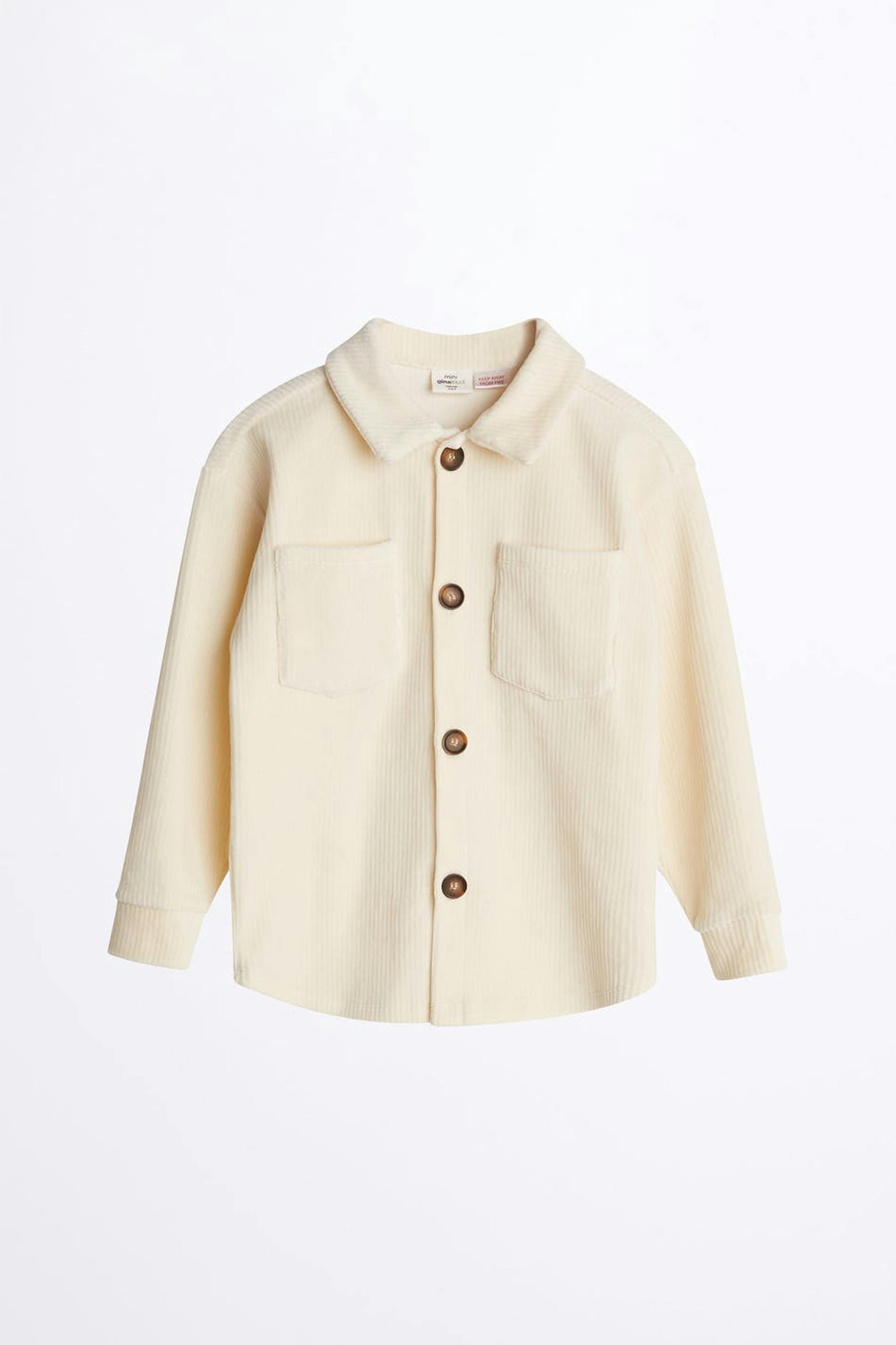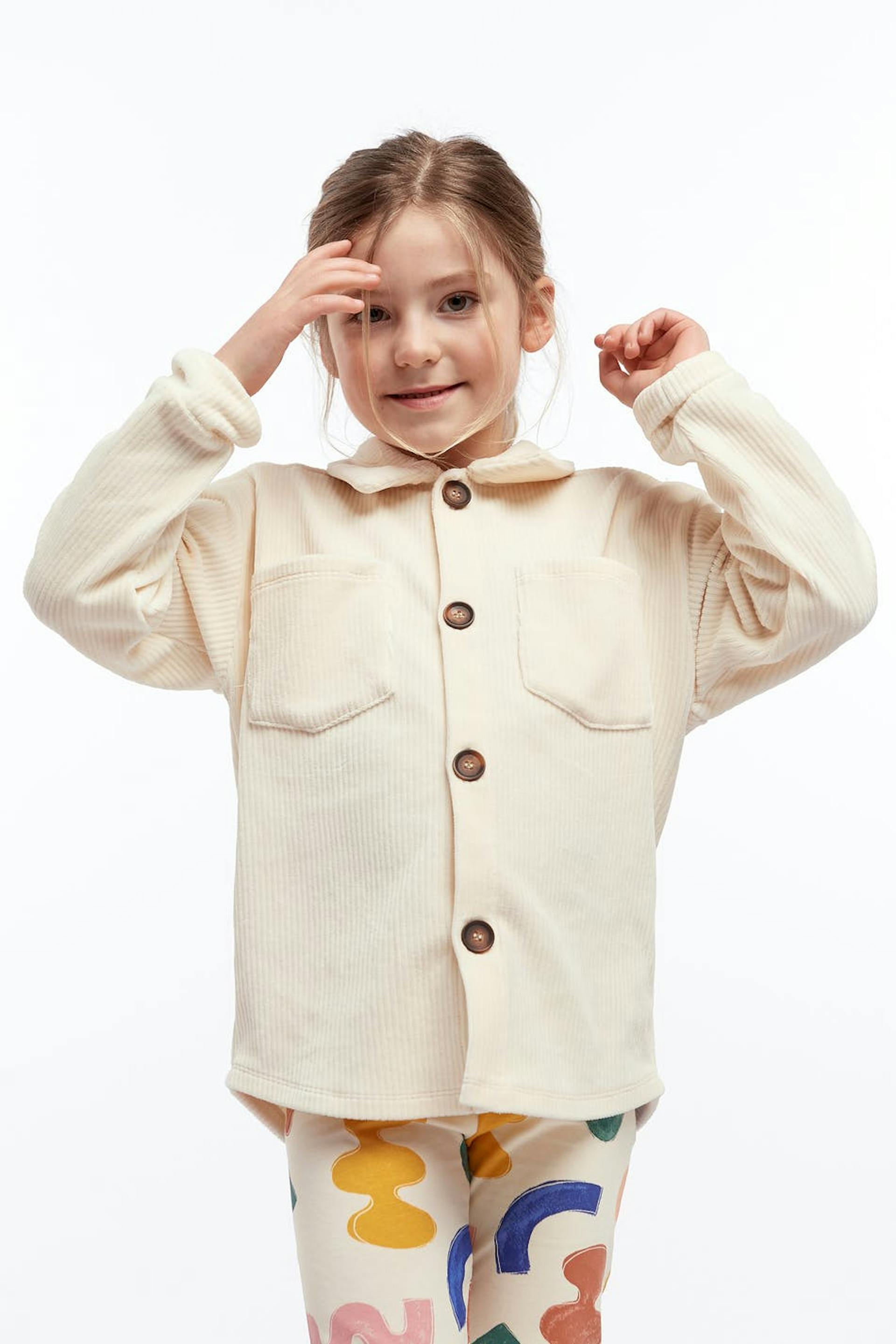Paita lapsille rintataskuilla. Paita on beige ja siinä on napit edessä. Se valmistetaan vakosametesta.