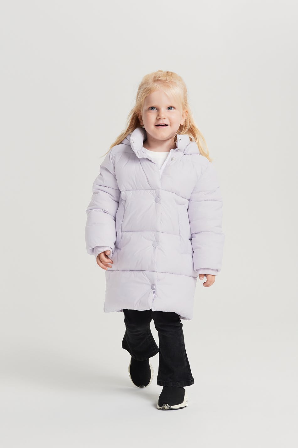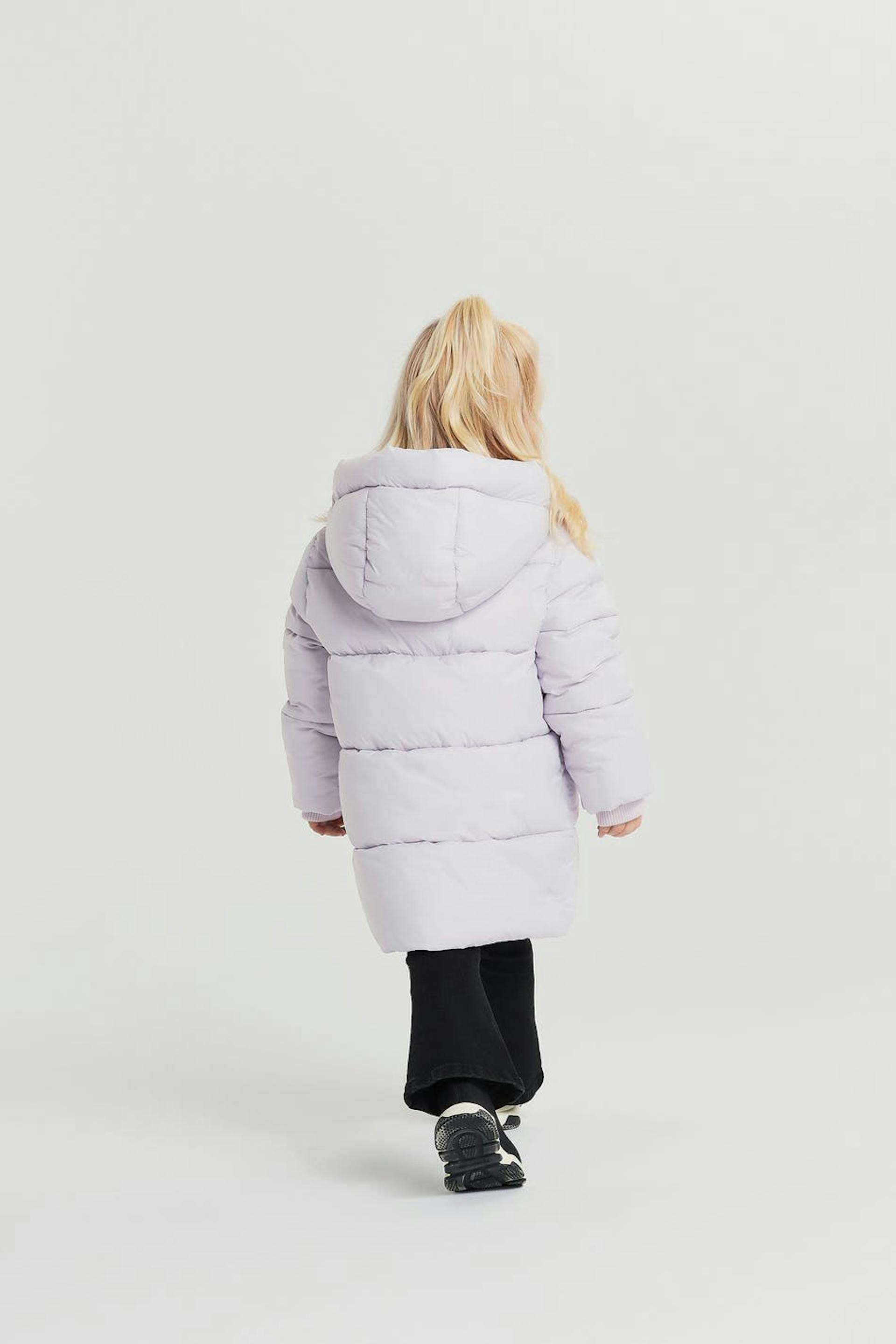 Takki lapsille normaalilla leikkauksella. Takki on liila ja siinä on irrotettava huppu. Siinä on viiltotaskut edessä, vetoketju ja snap-napit.