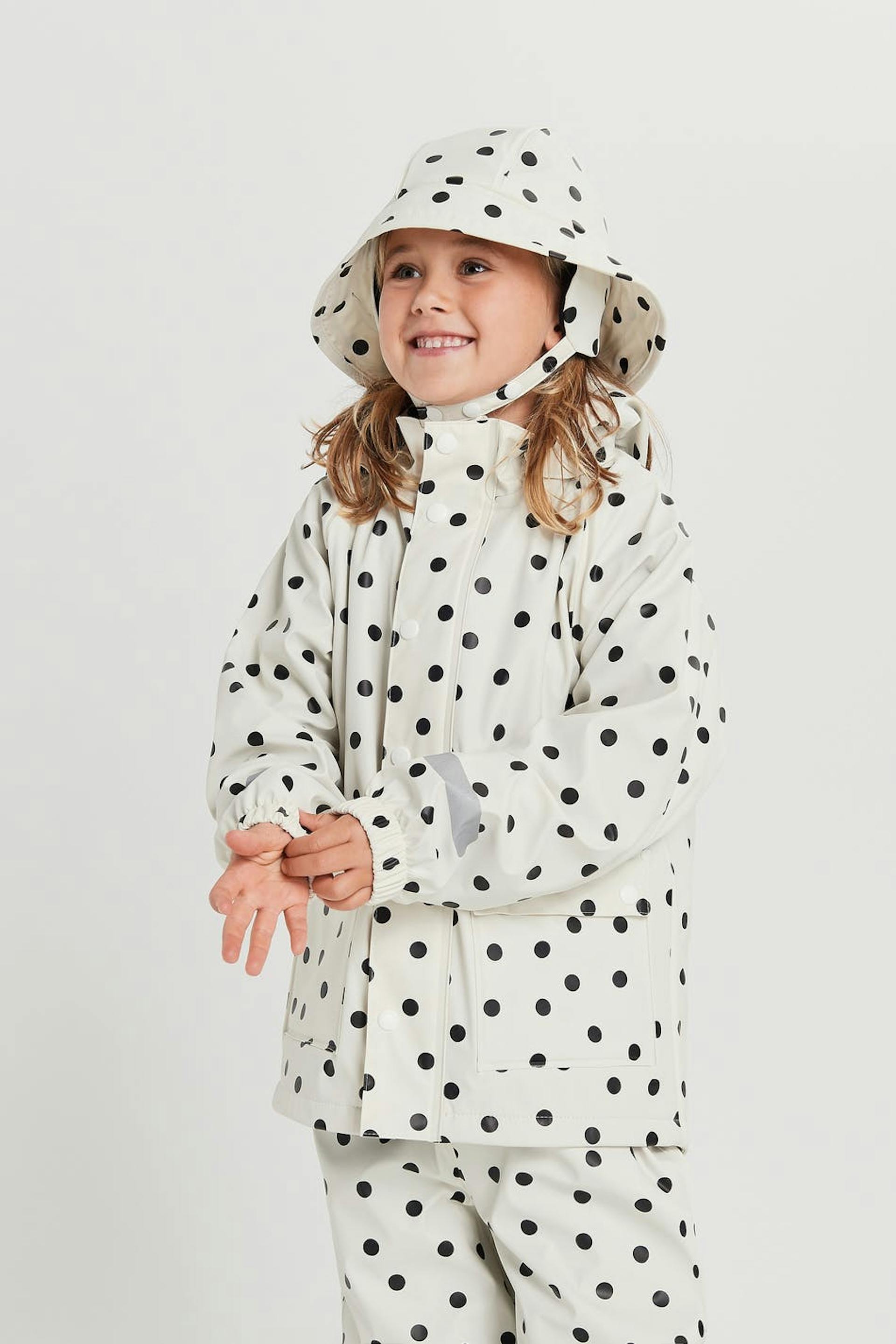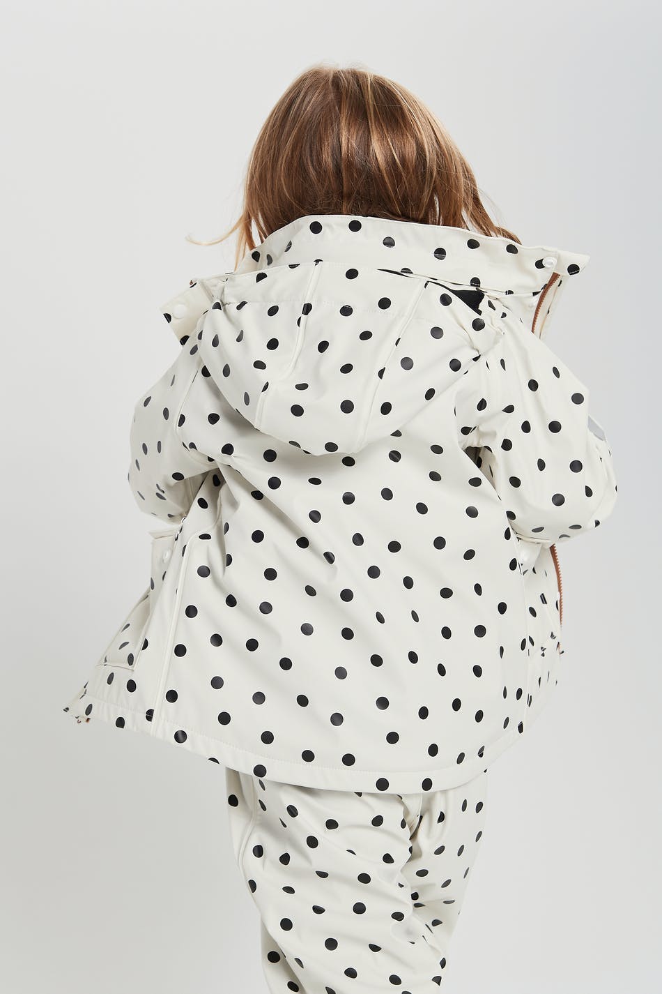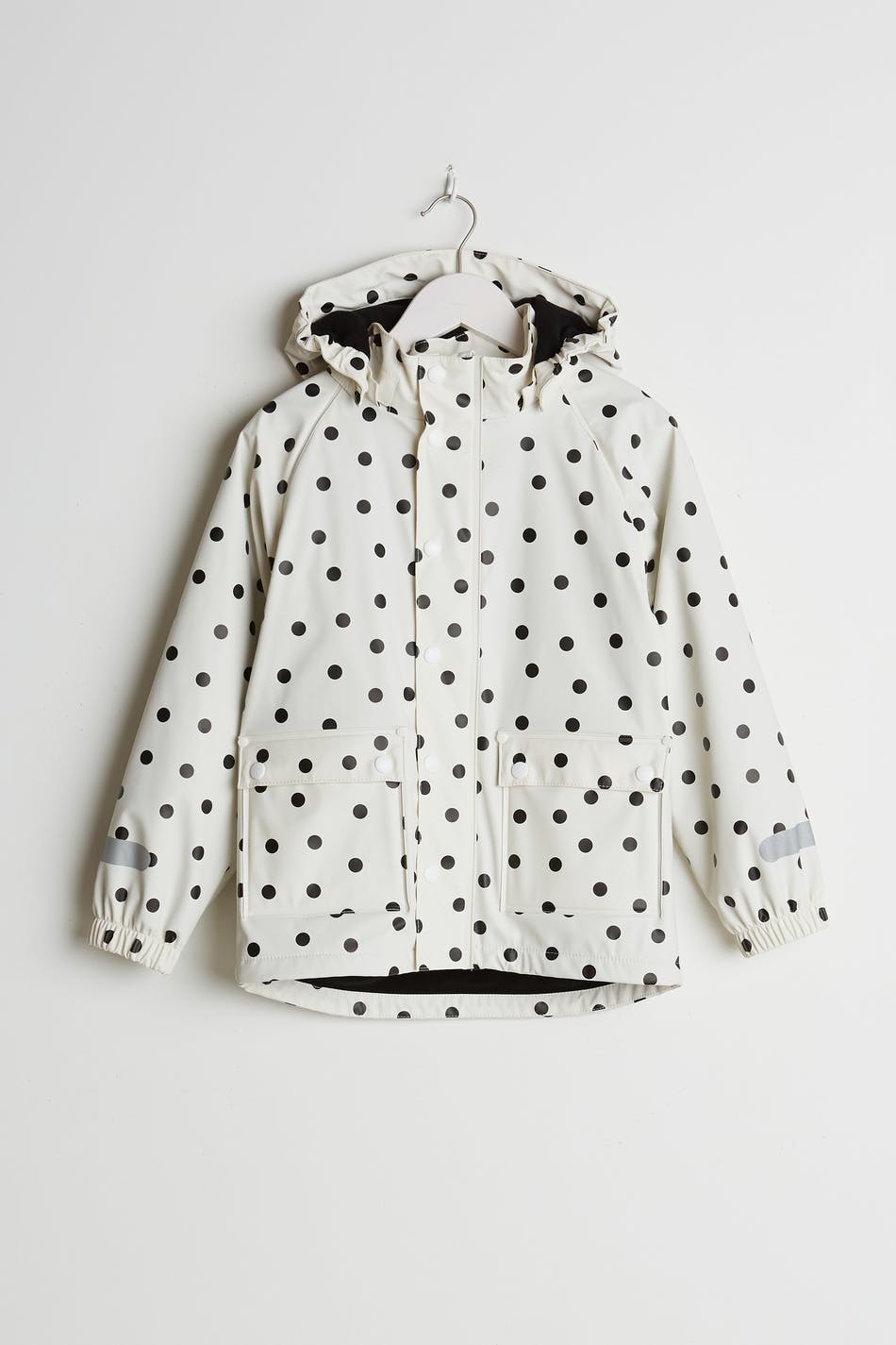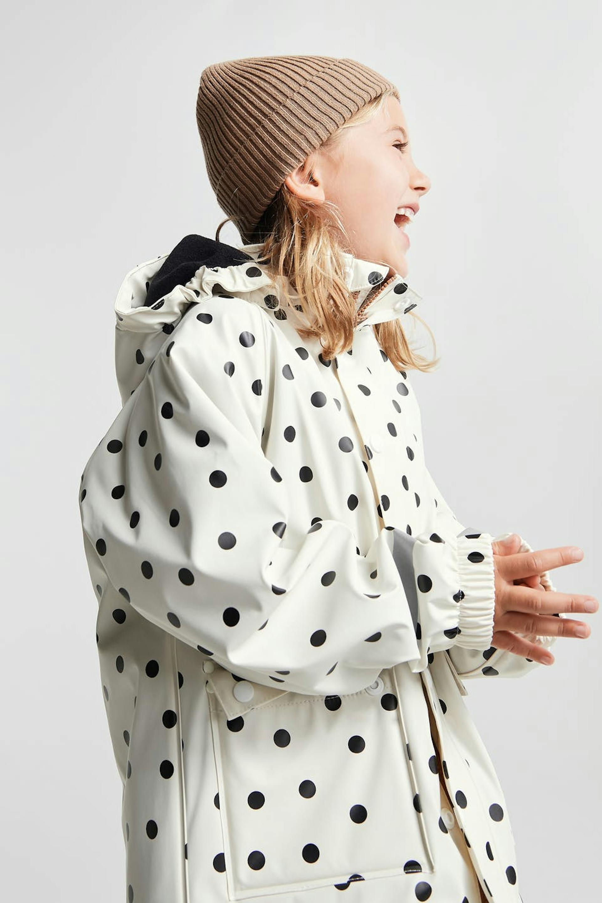 Tretorn X Gina tricot. Sadetakki yhteistyössä Tretorn:n kanssa. Pilkullinen sadetakki lapsille vuorauksella fleeceestä. Valkoinen, vedenkestävä, tuulenpitävä ja ilman PFC ja PVC:tä. Siinä on irrotettava huppu, heijastavat yksityiskohdat hihansuissa ja yhteenliitetyt saumat. Vesipilari: 5 000 mm.