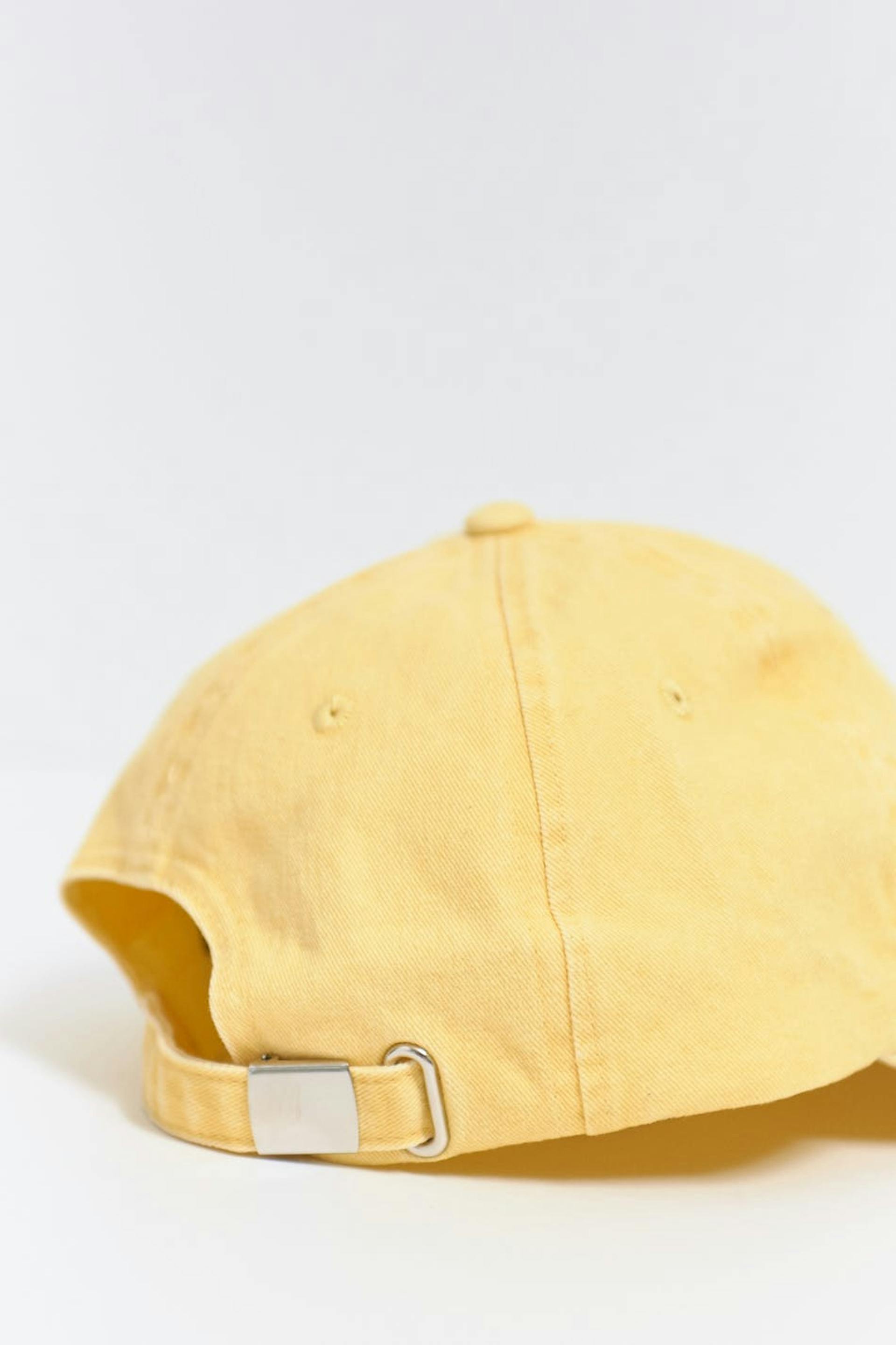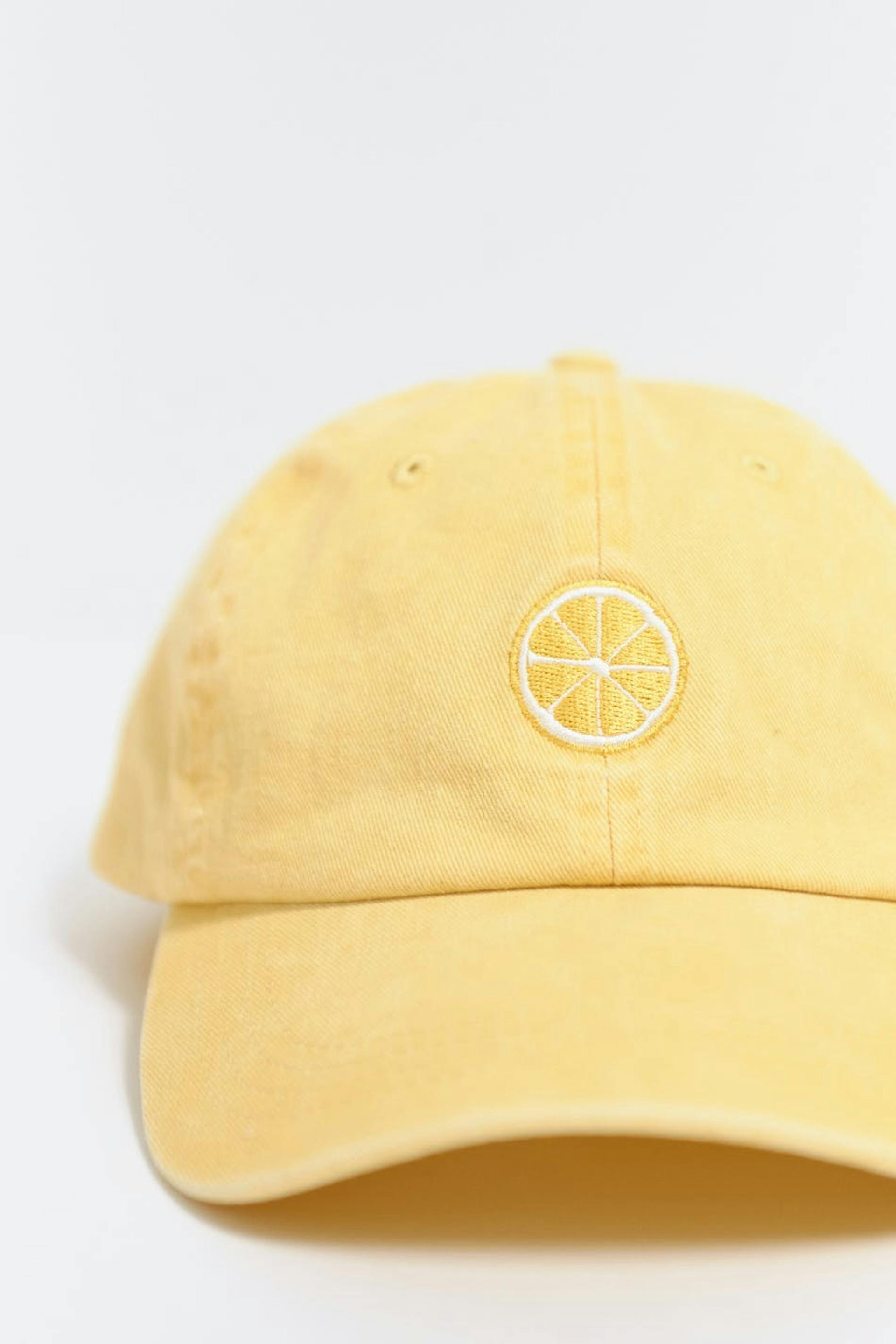 Klassinen lippis puuvillasta kirjaillulla sitruunalla. Lippis on keltainen ja siinä on säätötarra takana.