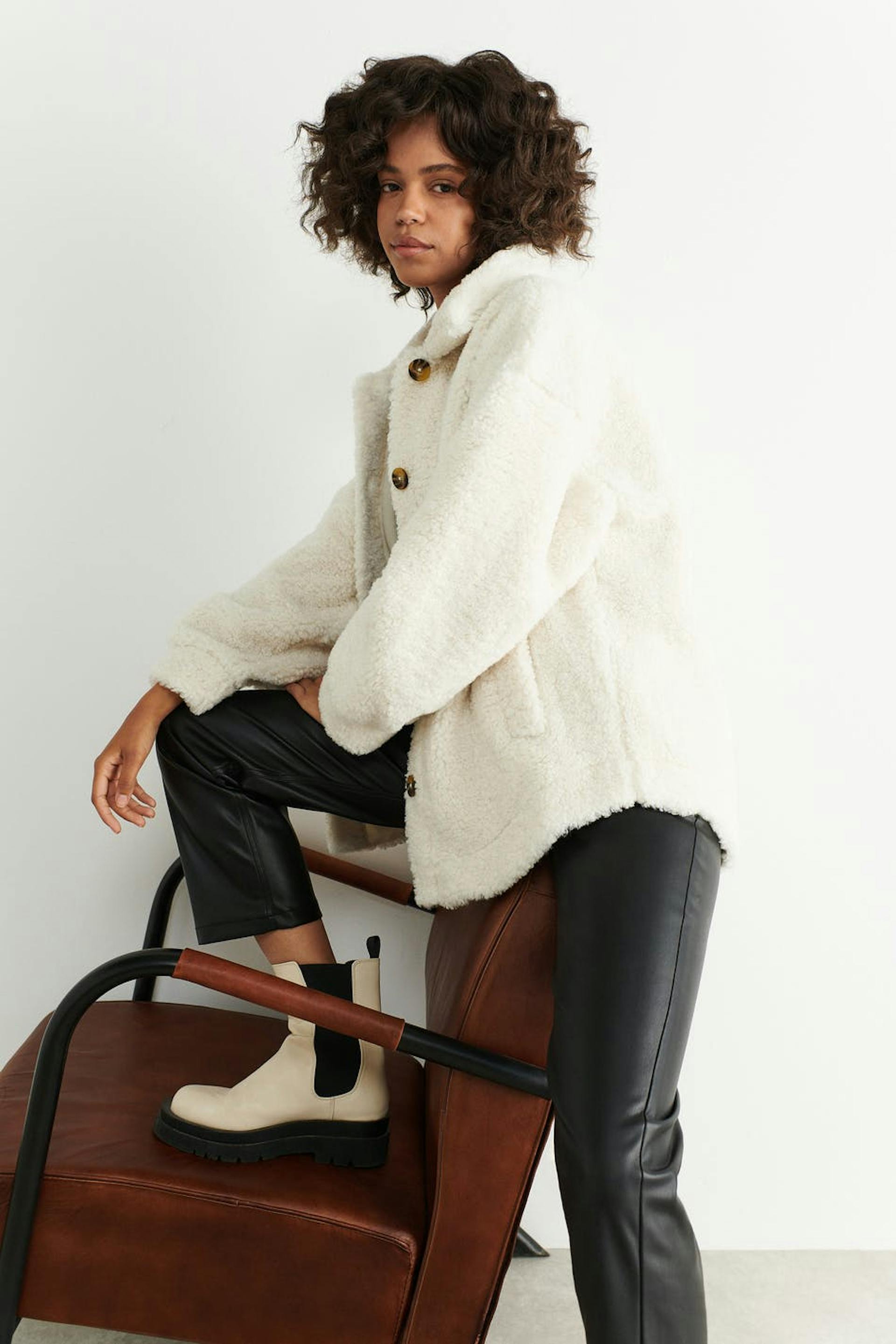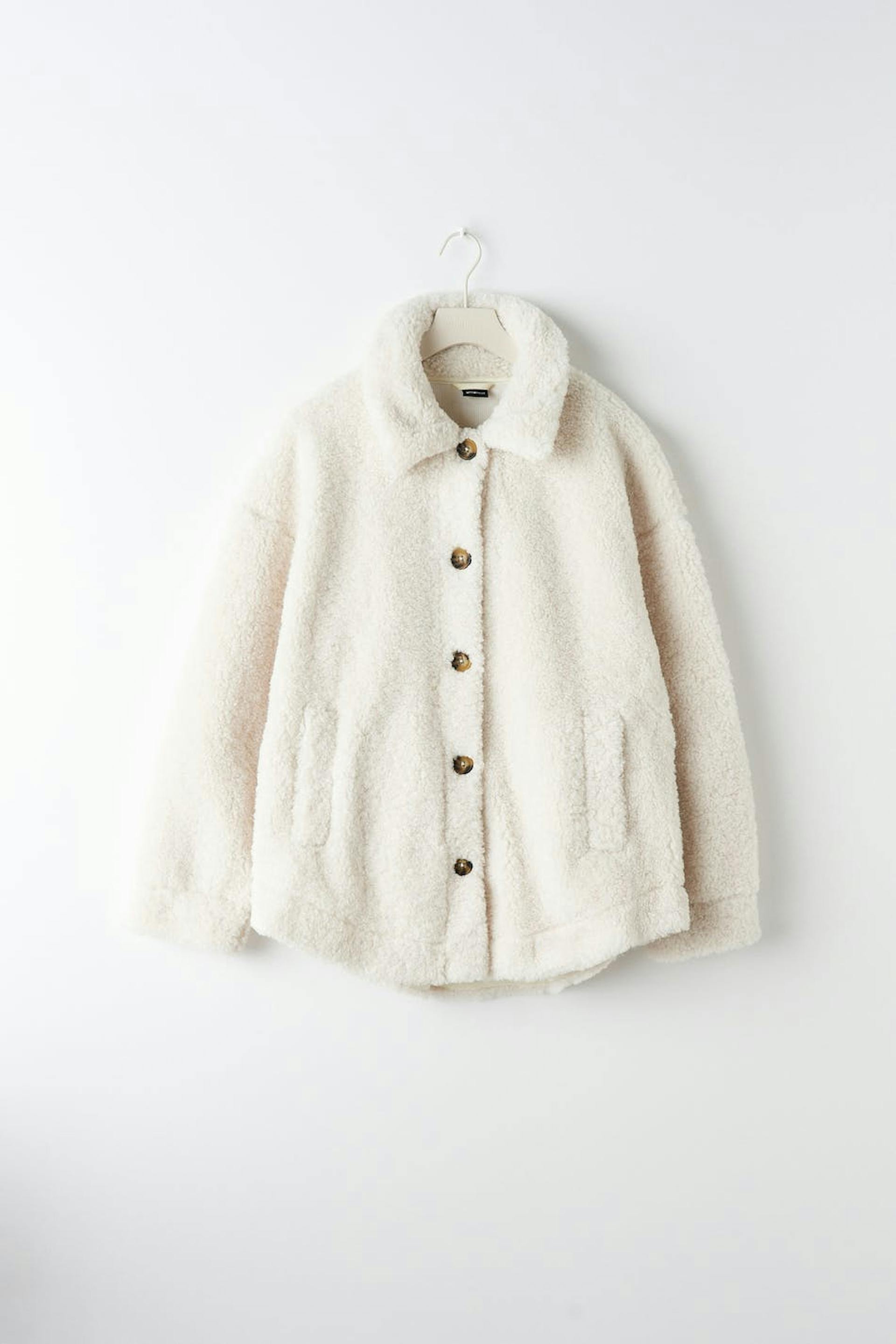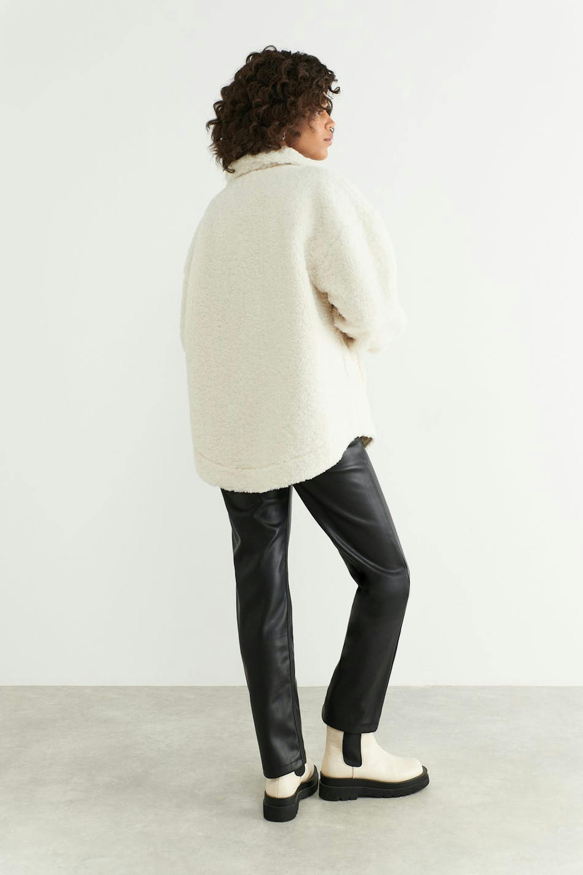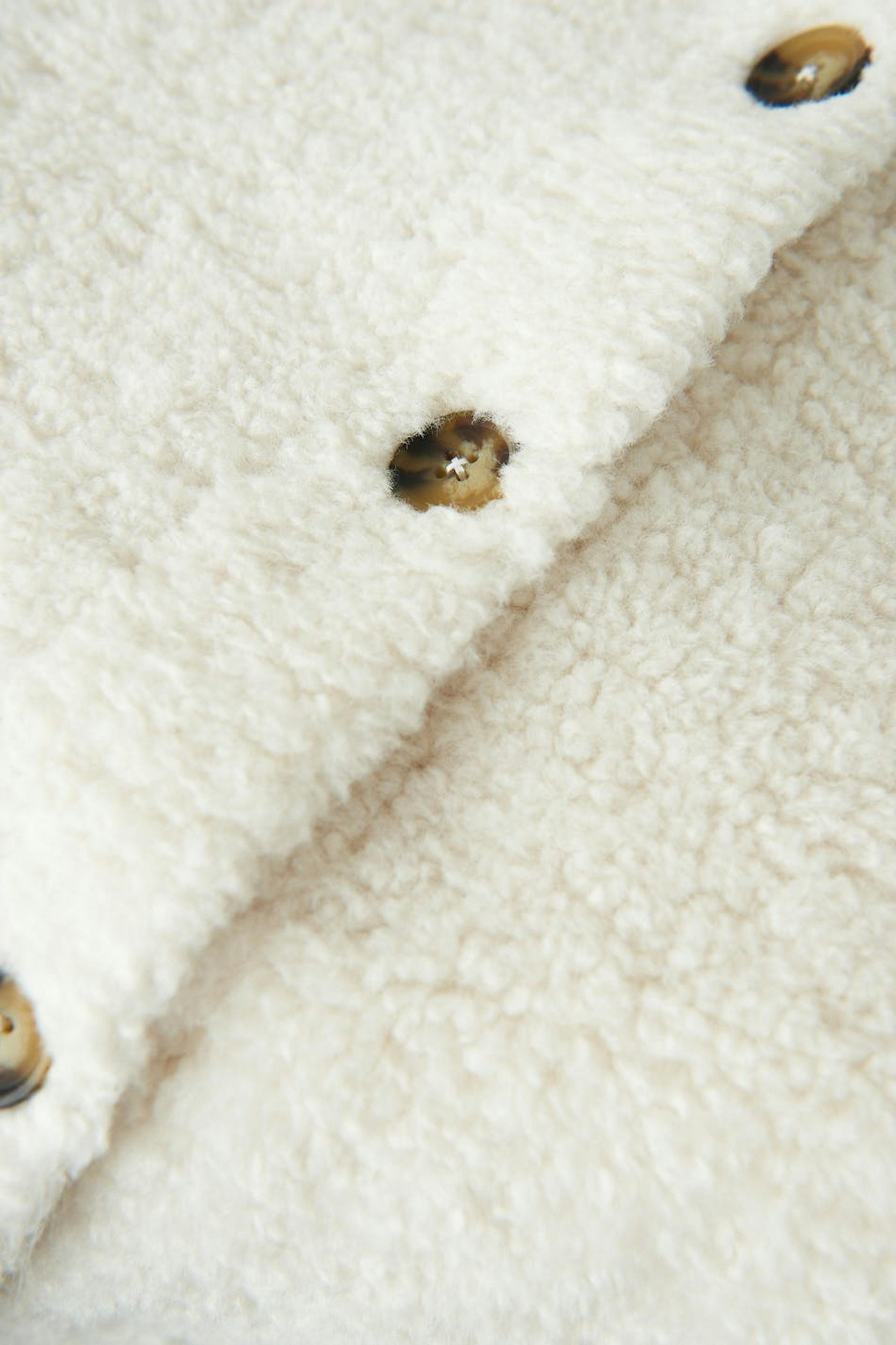Teddy-takki oversized-mallilla. Teddy-takki on valkoinen ja siinä on napituslista edessä. Siinä on taskut ja hihansuut nappikiinnityksellä.