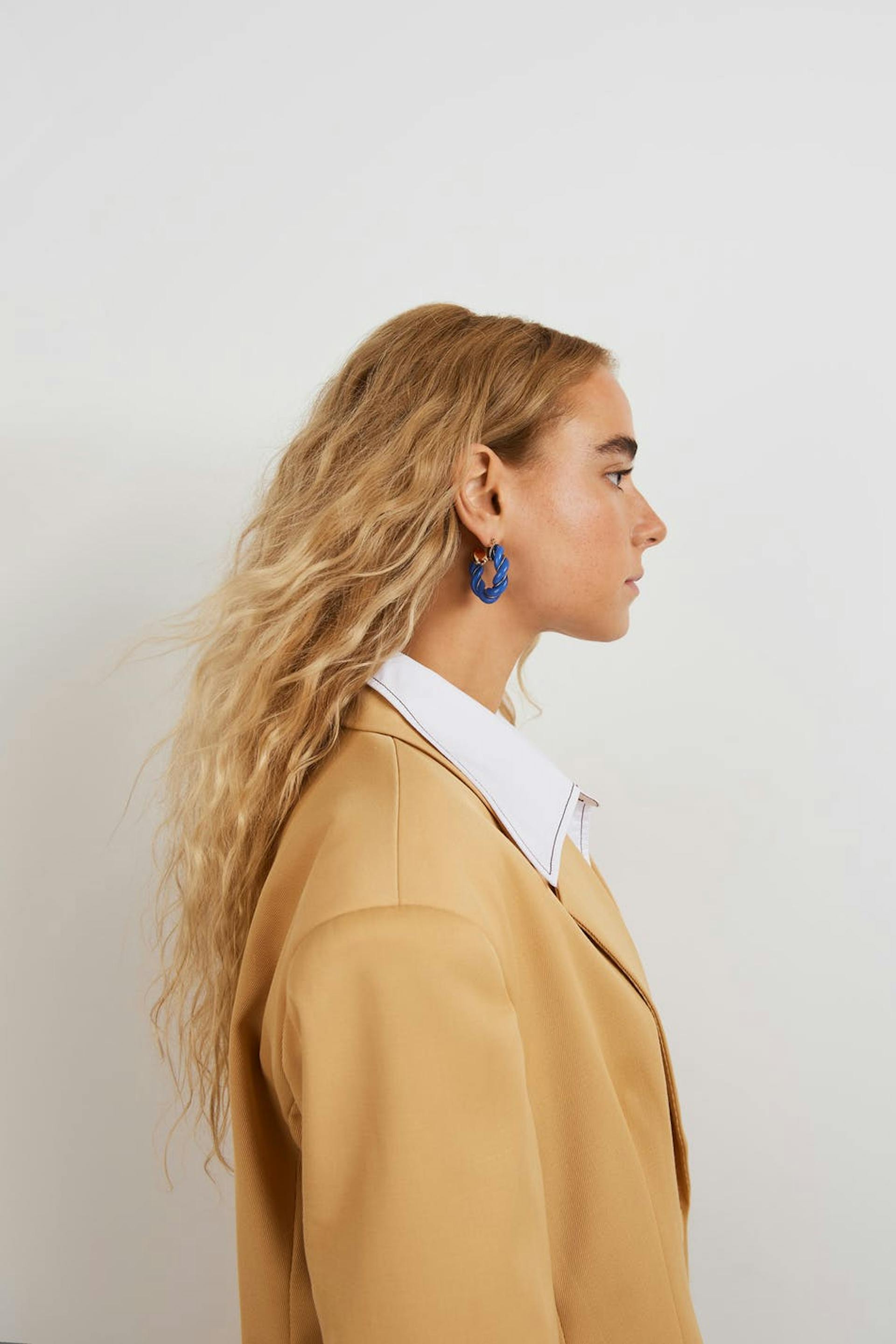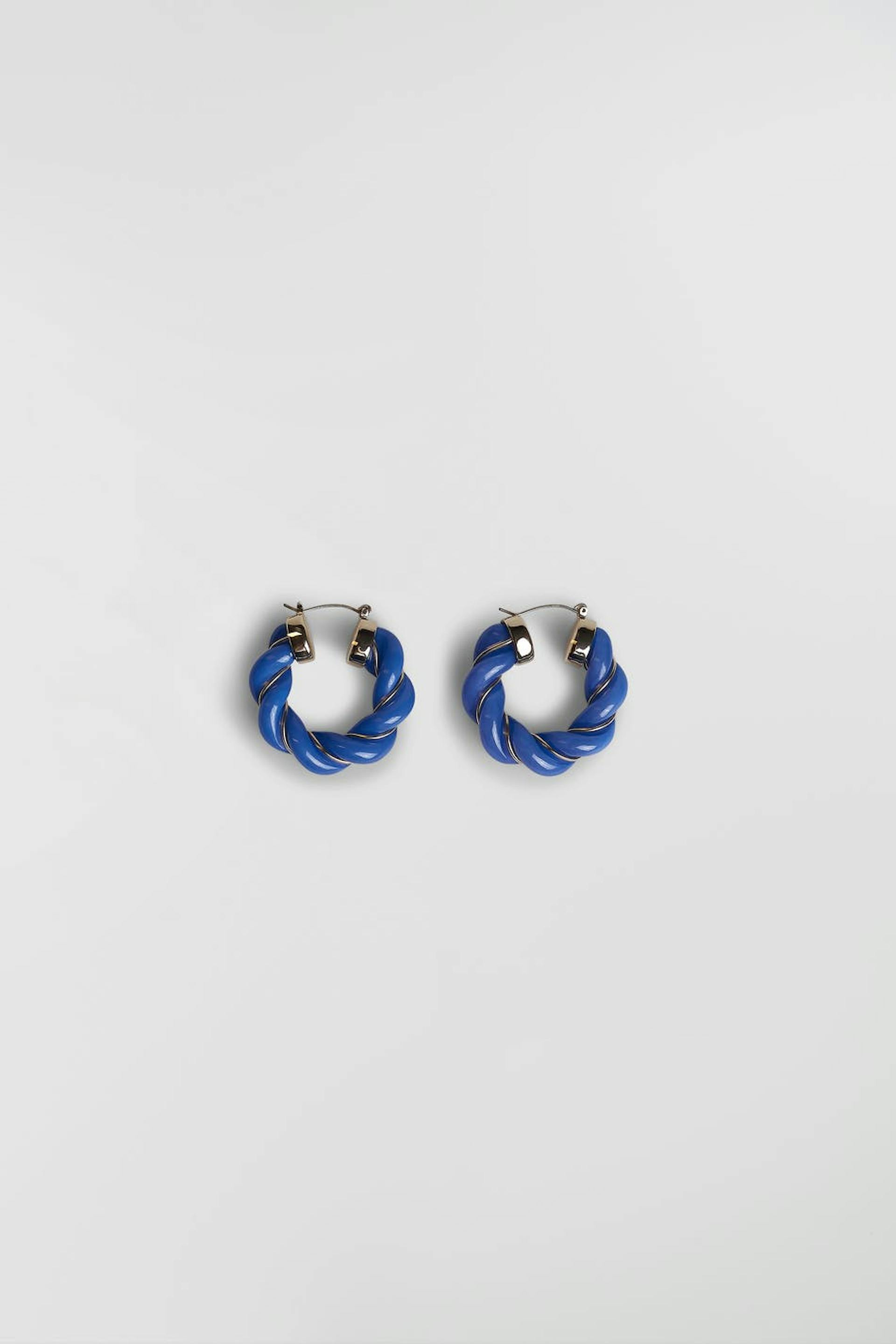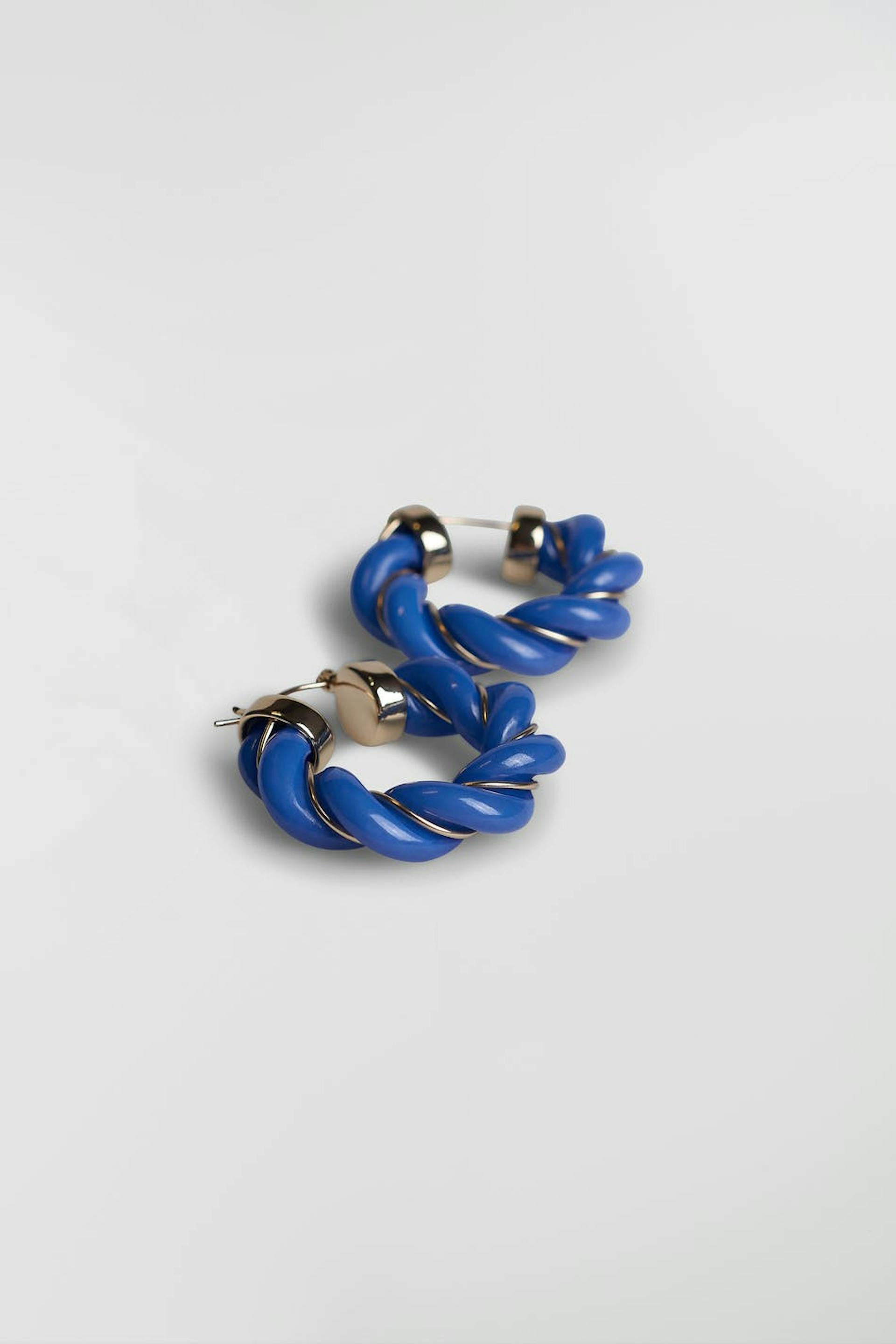 Hobnob X Gina Tricot. Korvakorut kiemuraisella muotoilulla muovista. Korvakorut ovat sinisiä ja niissä on kultayksityiskohdat.