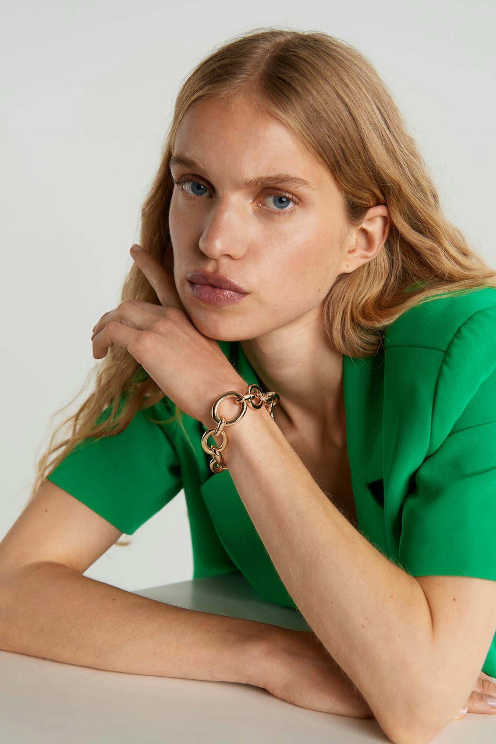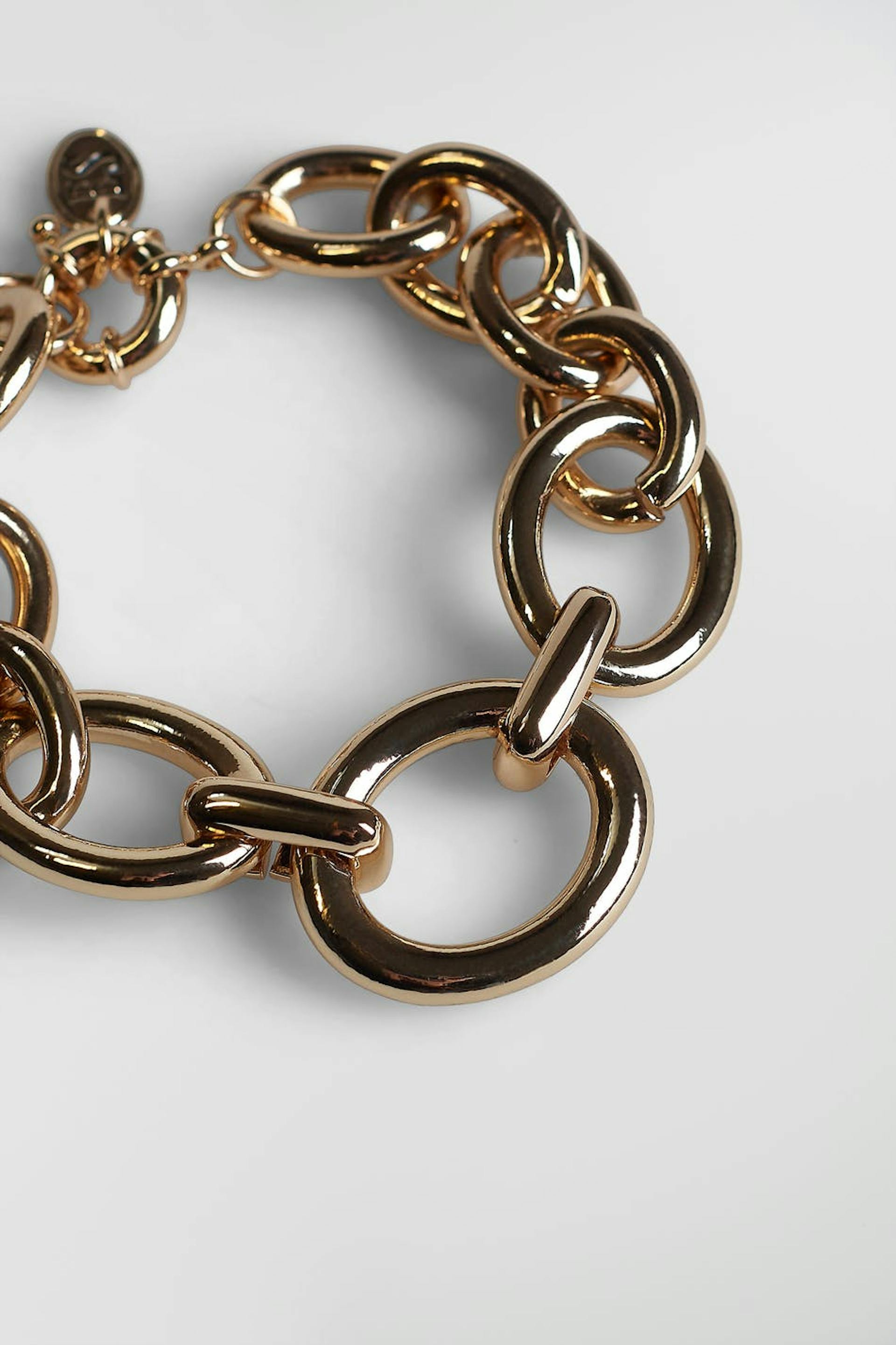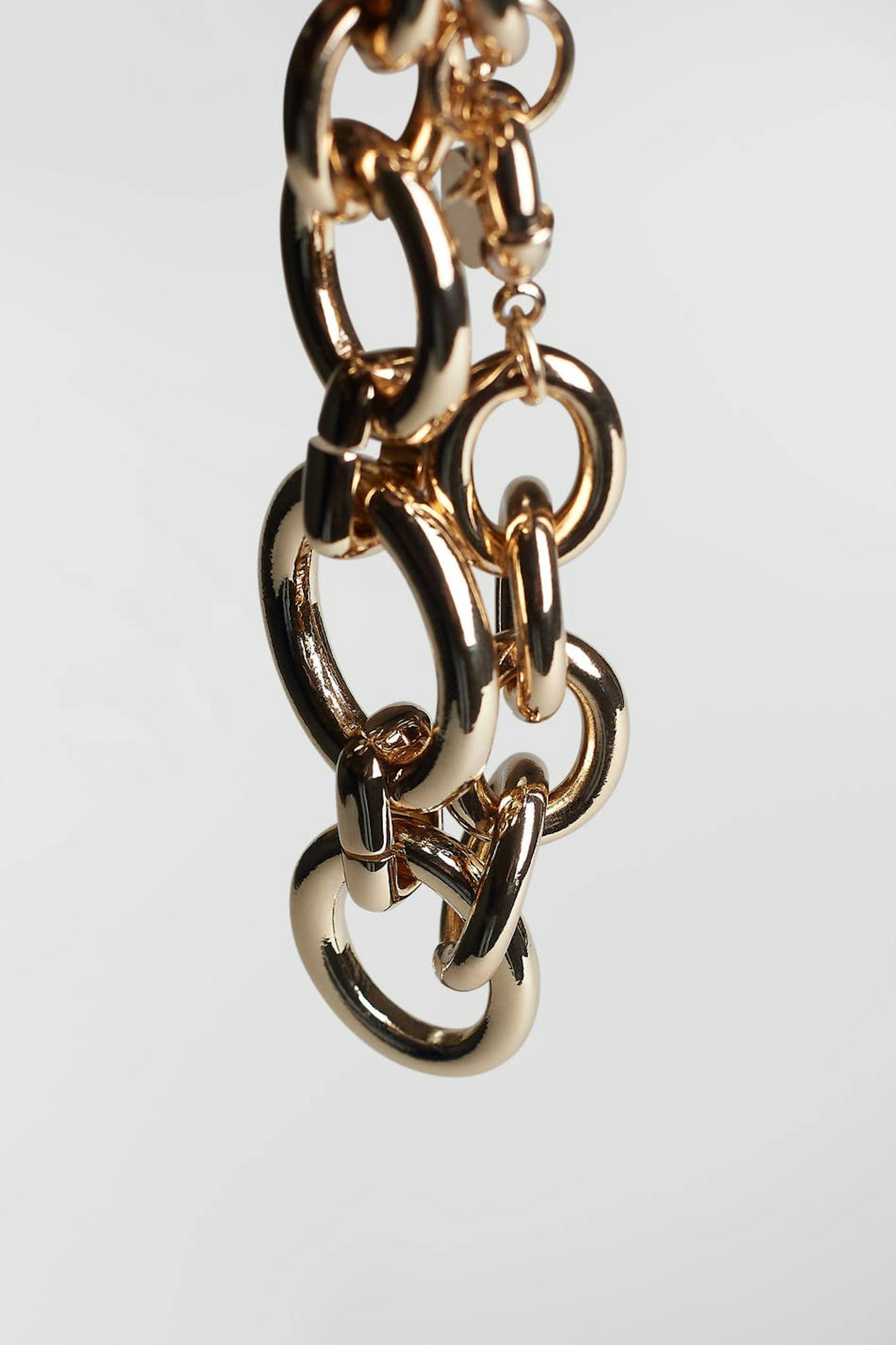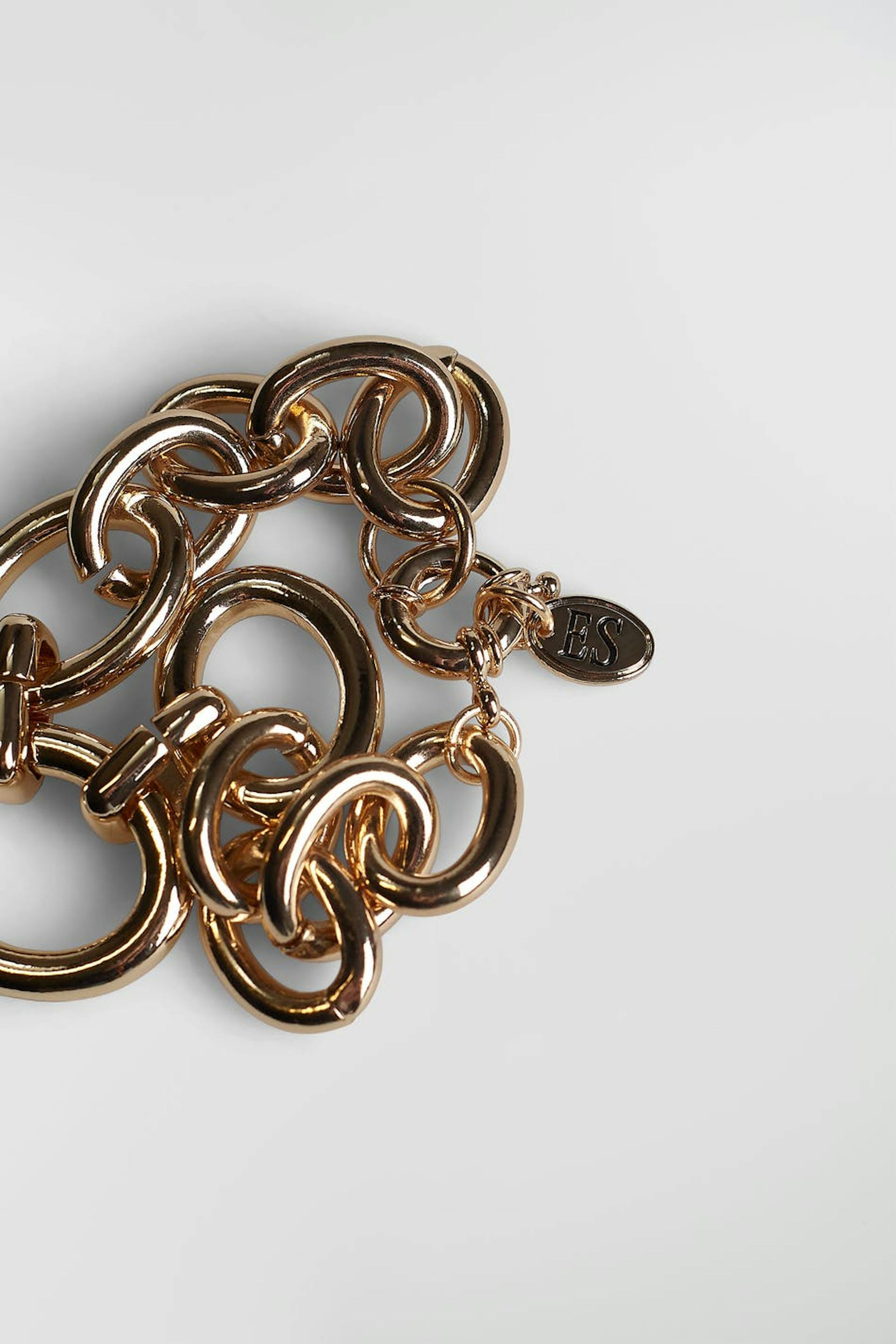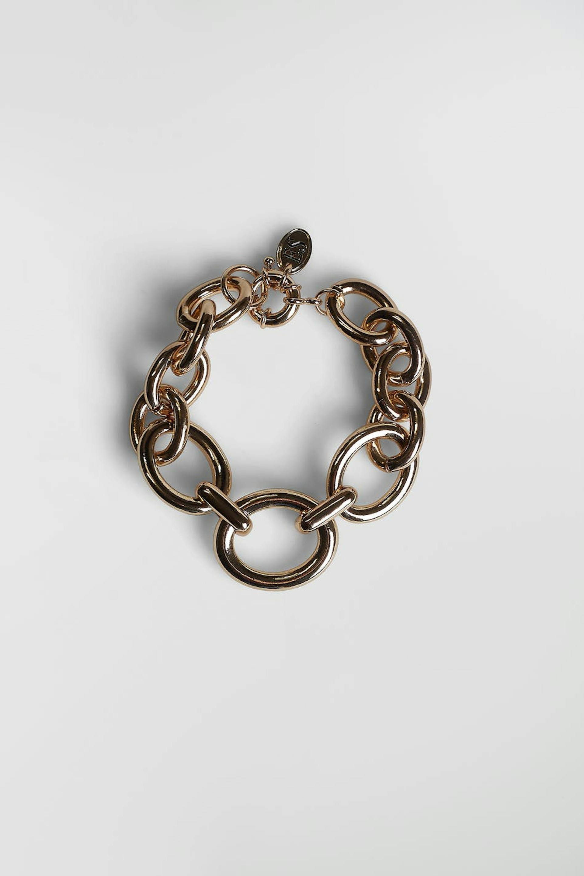 Emili Sindlev suunnittelema. Paksu rannekoru ketjumuotoilulla ketjurenkailla eri muodoissa. Rannekoru on kultainen.