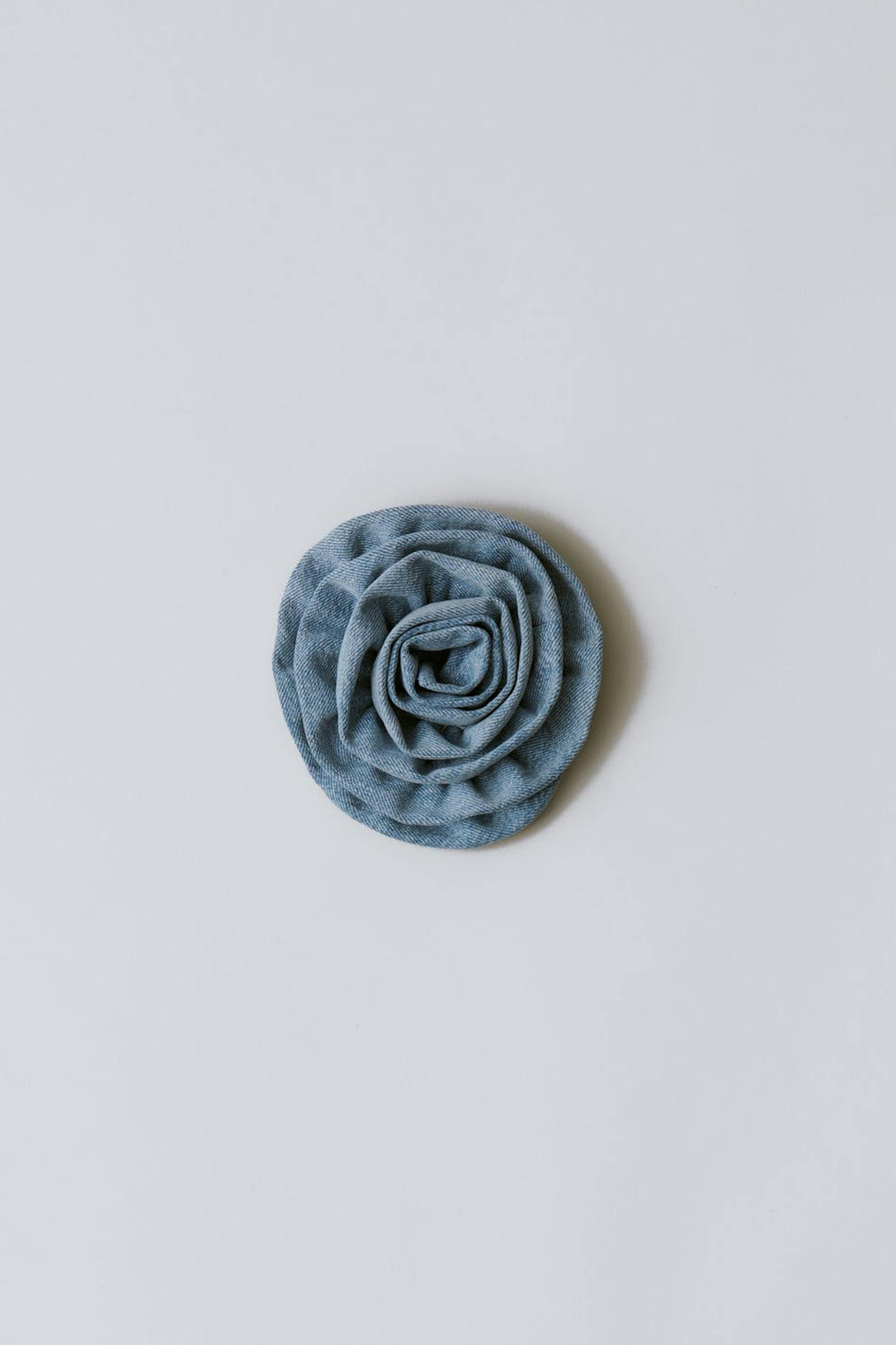 REMADE DENIM COLLECTION. Suuri rintaneula denimistä kukan muotoisena.
