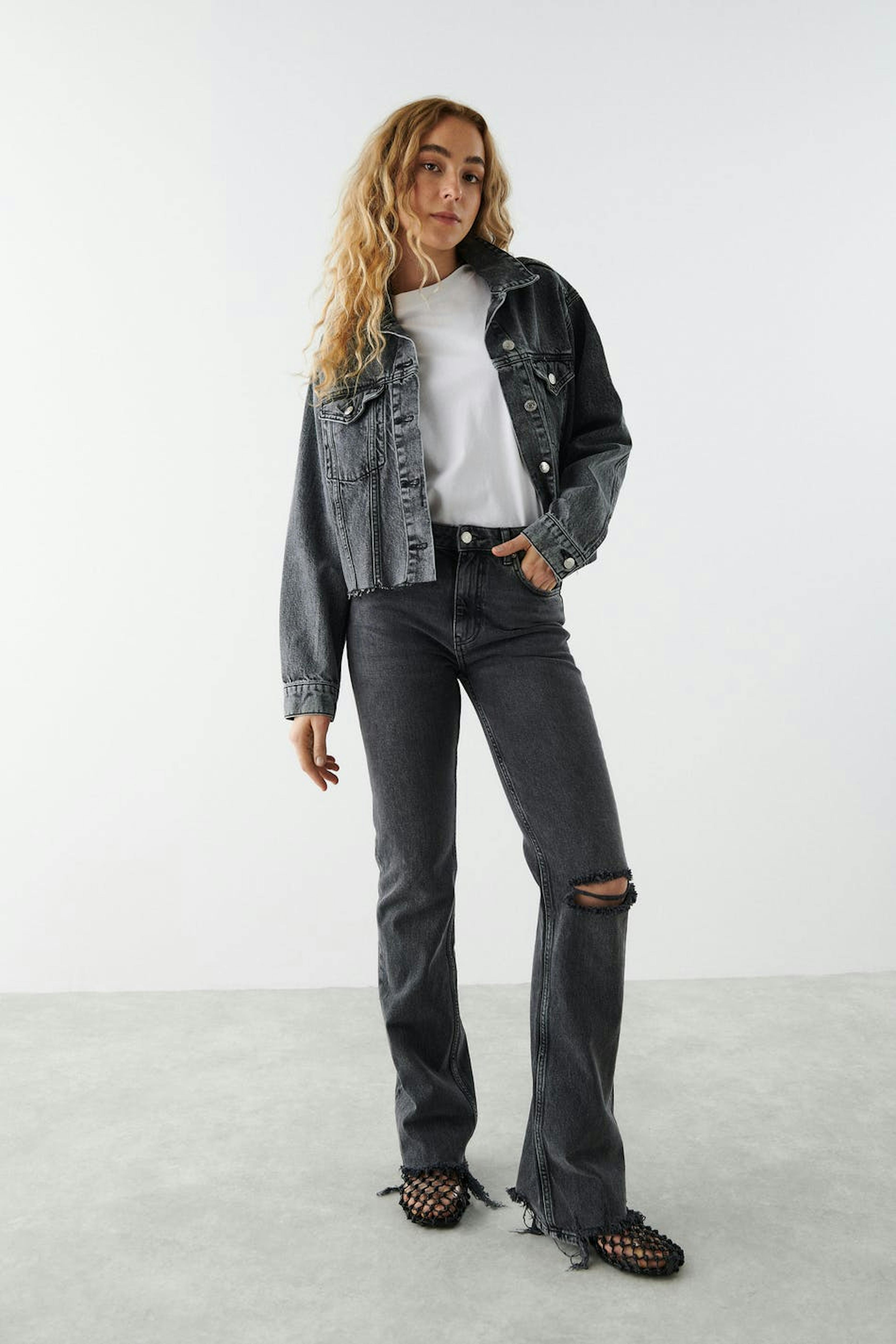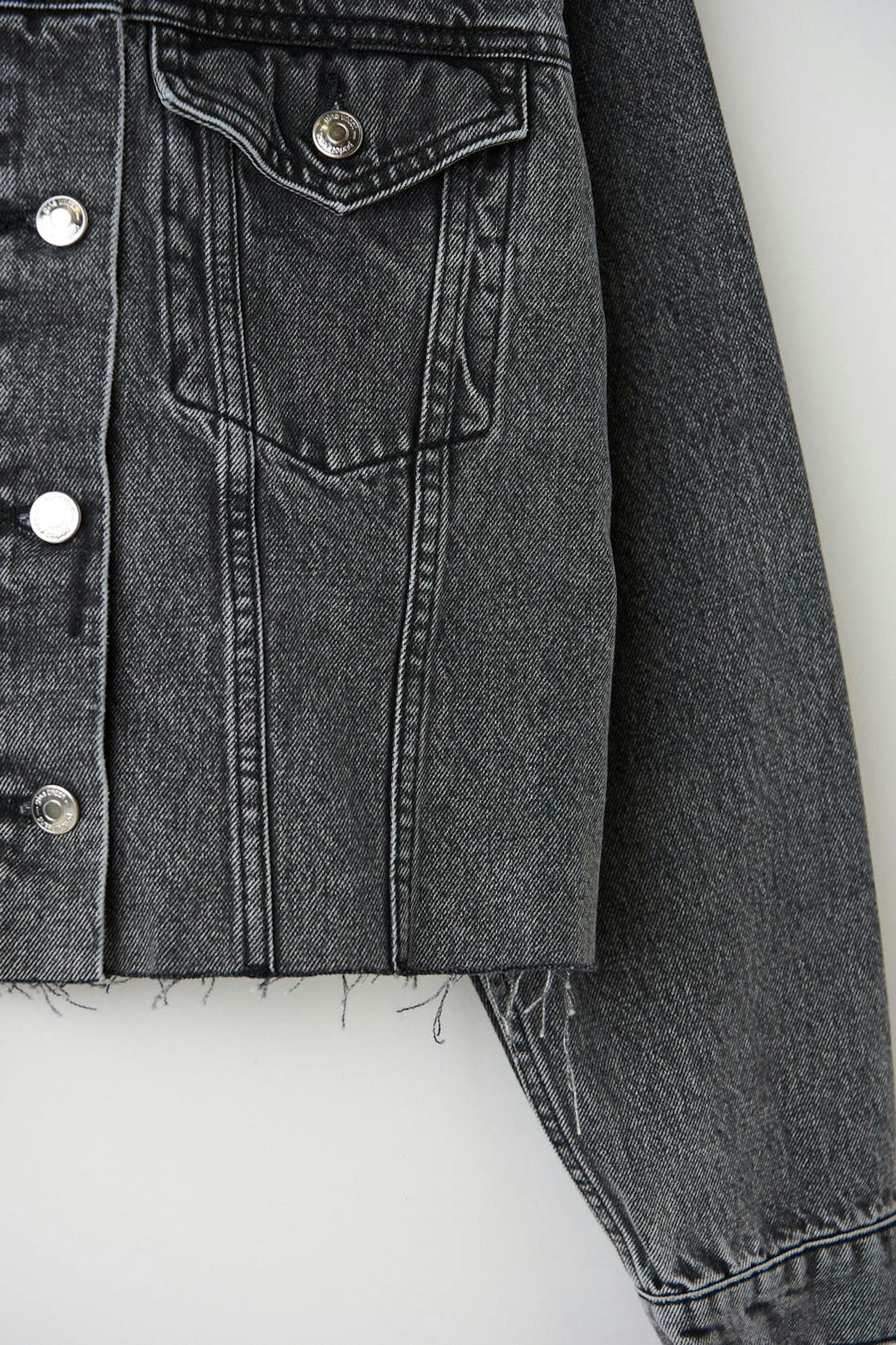 Lyhyt farkkutakki käsittelemättömällä reunalla alhaalla. Takki on harmaa ja siinä on laatikkomainen malli joustamattomasta denimistä. Siinä on kaulus, rintataskut ja napituslista edessä.