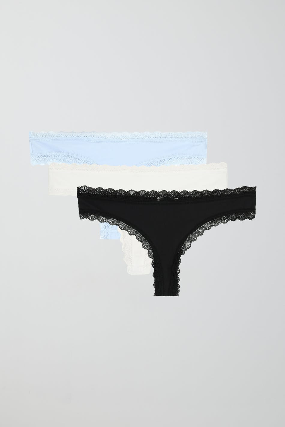 Stringit 3 kpl -pakkauksella ja pitsireunoilla. Stringit ovat sinisiä ja niissä on haaravälin vuori. Niissä on pehmeä, ribattu laatu.