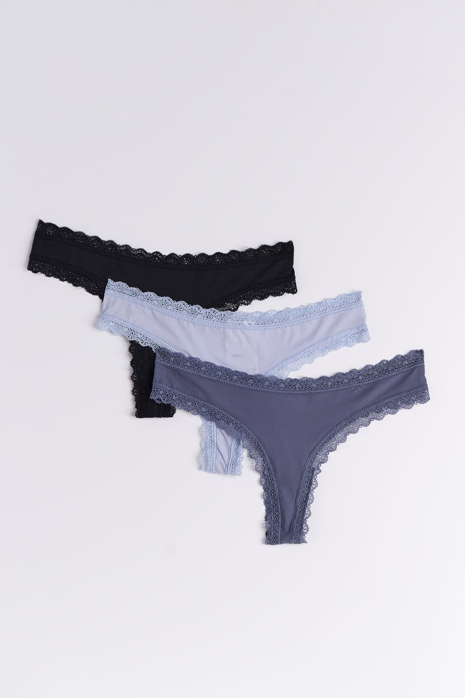 Stringit 3 kpl -pakkauksella ja pitsireunoilla. Stringit ovat harmaita, mustia ja sinisiä. Niissä on haaravälin vuori ja pehmeä, ribattu laatu.