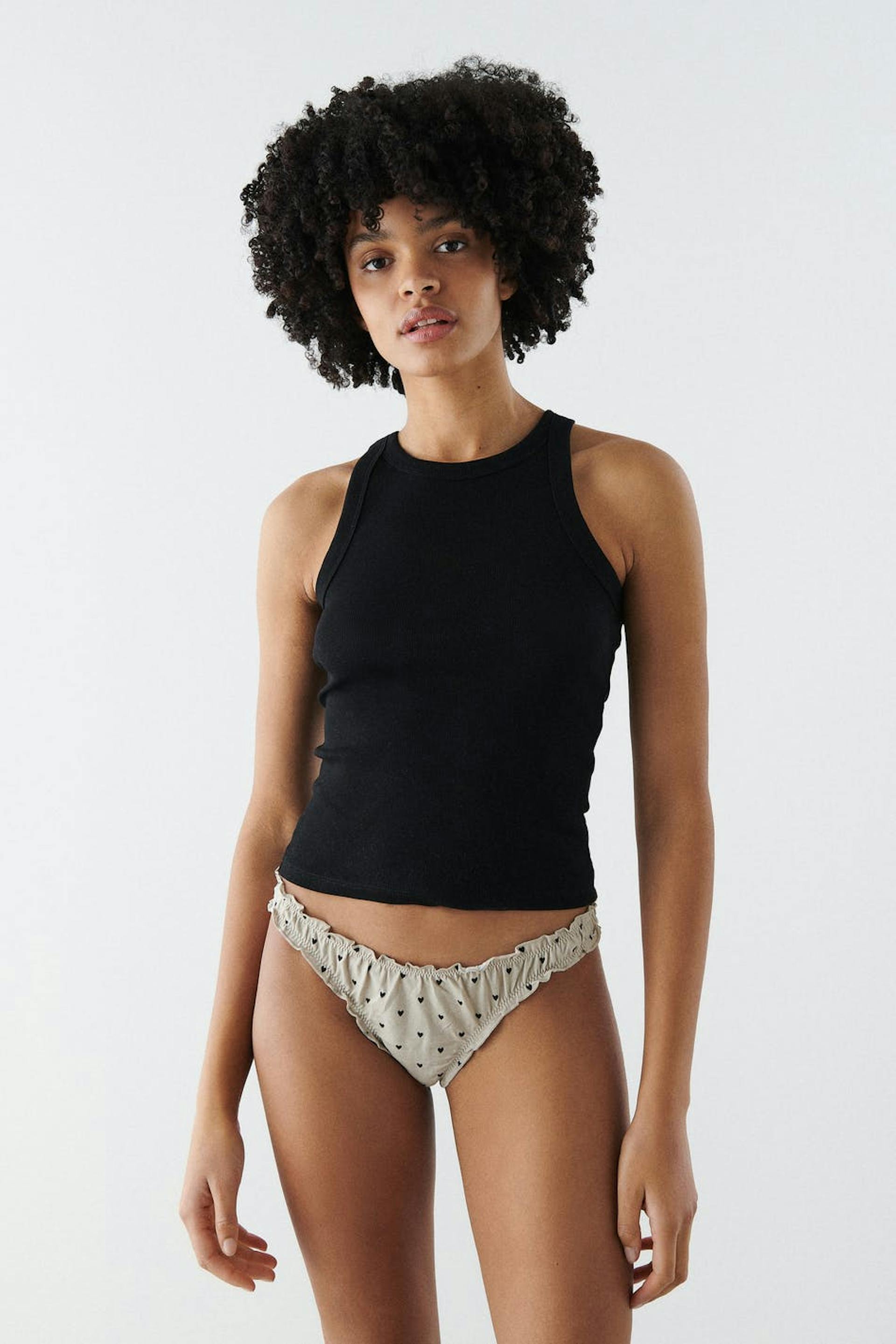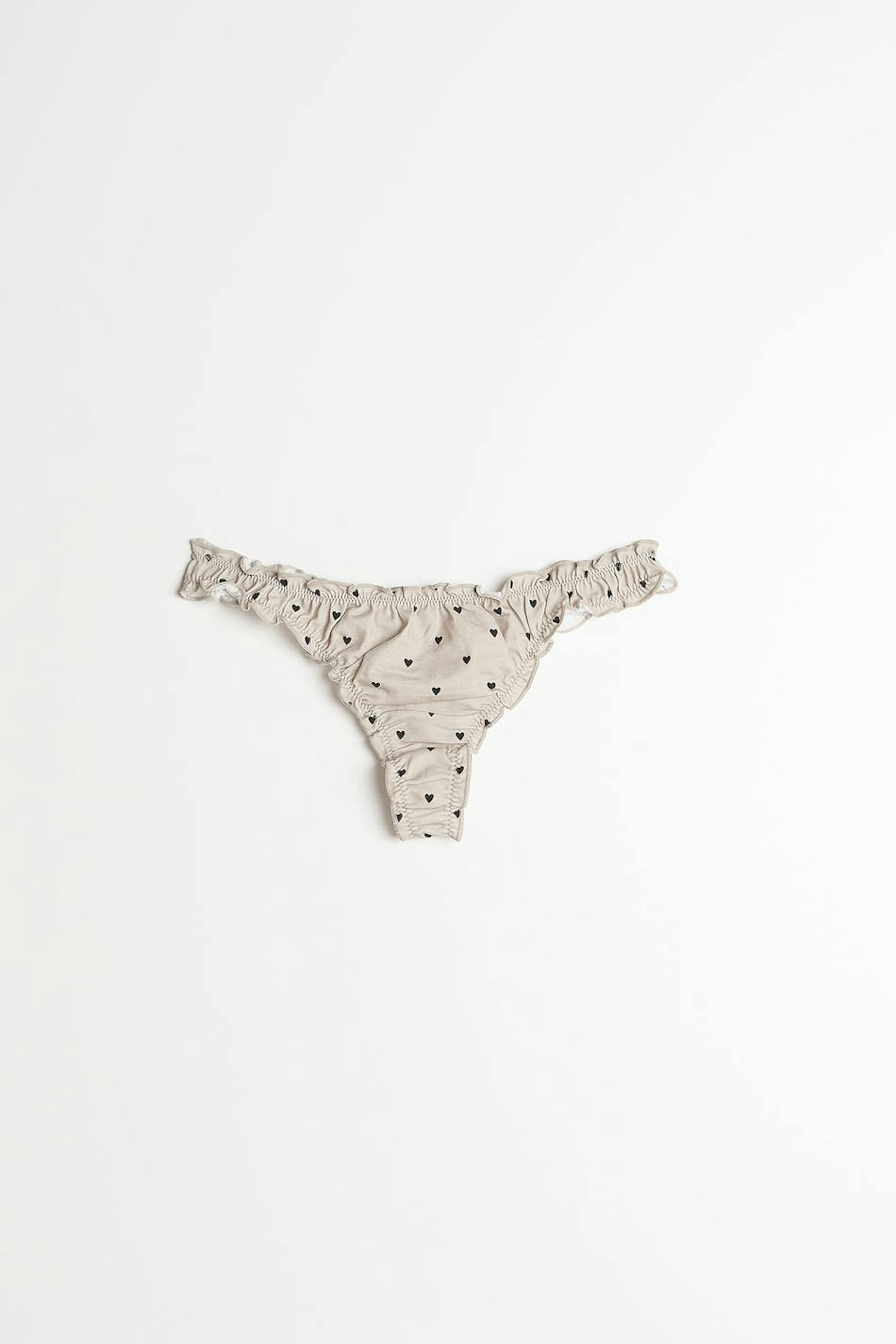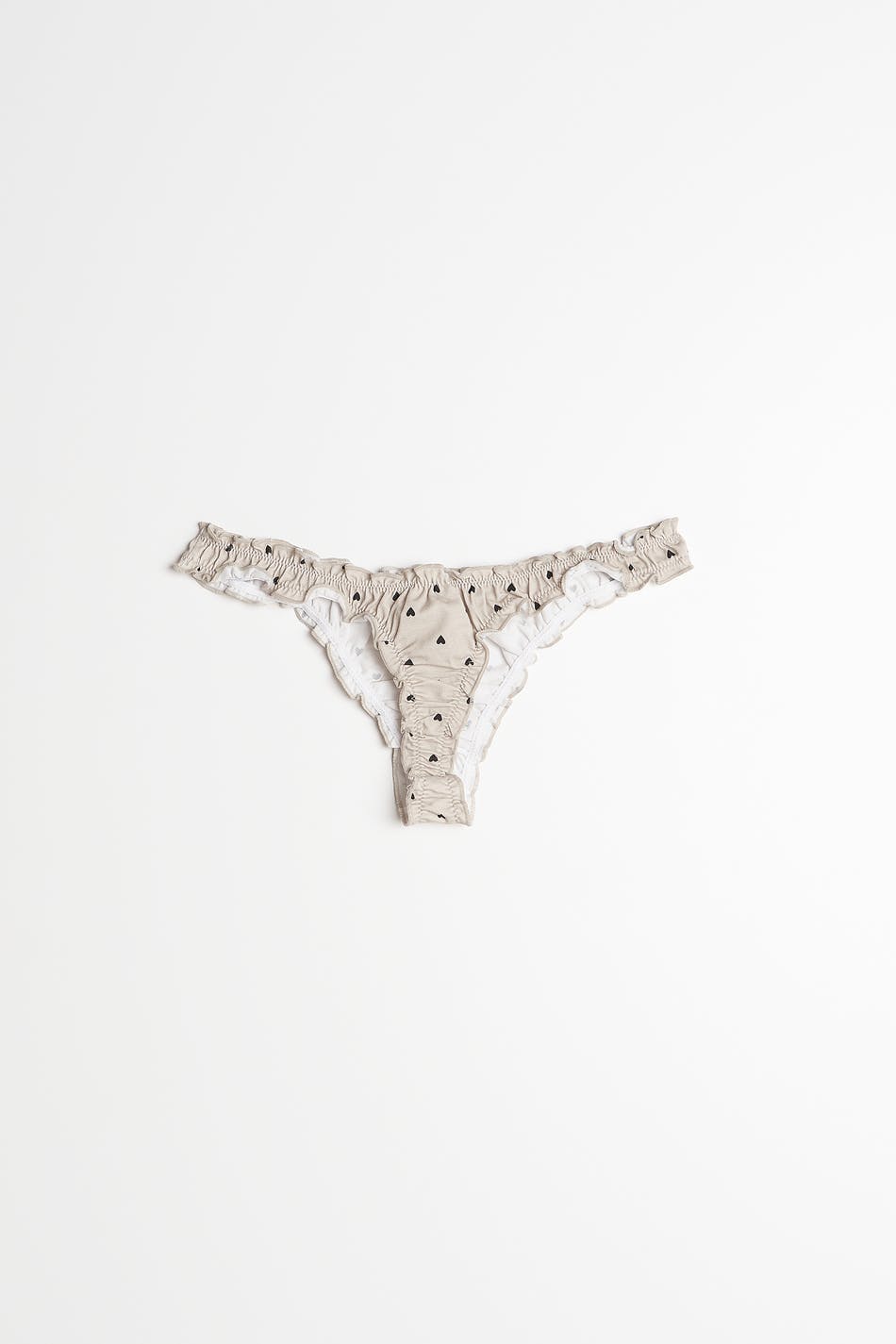 Pikkuhousut sydäneillä. Pikkuhousut ovat beigejä ja niissä on röyhelöt. Niissä on vuori puuvillasta jalkovälissä.