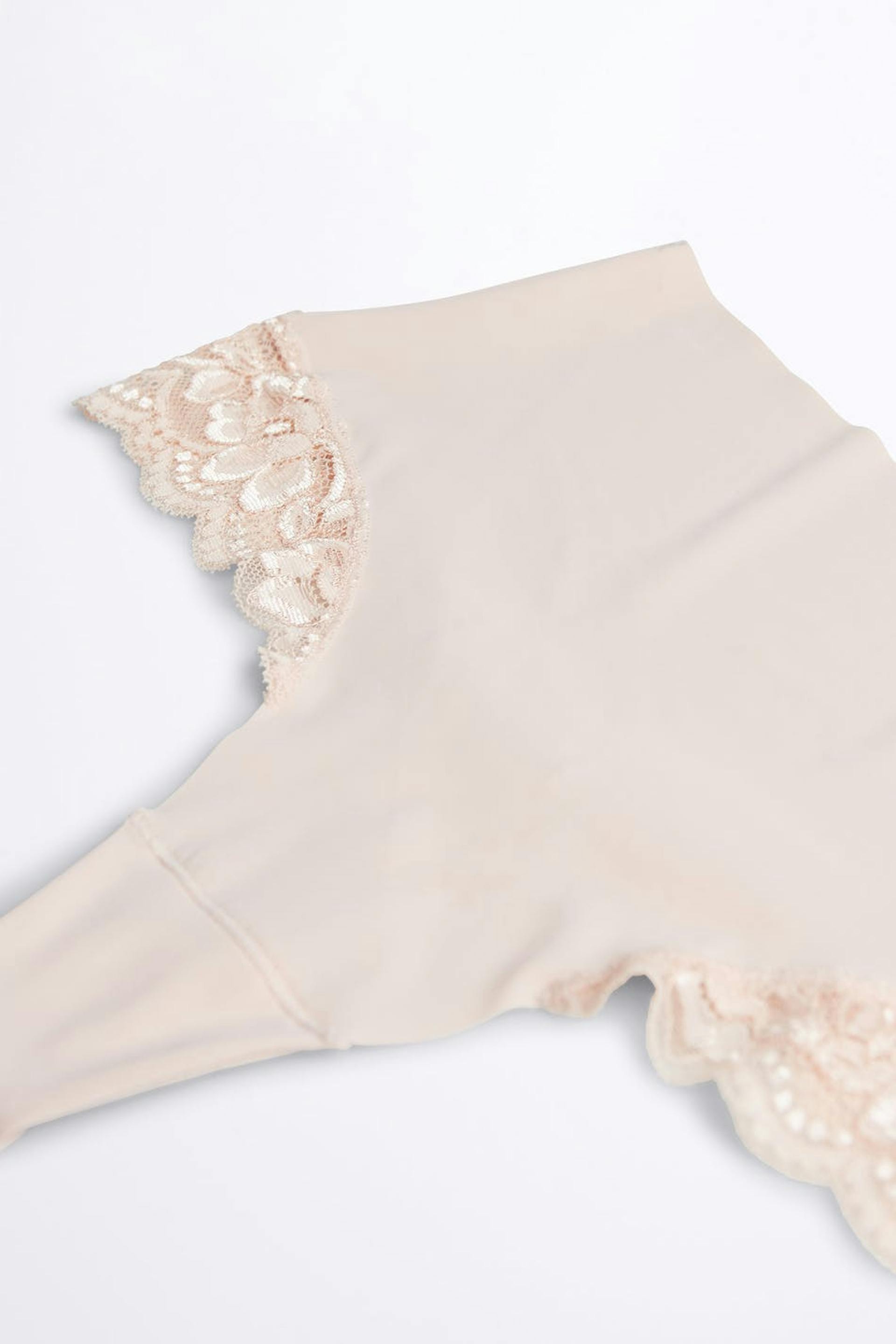 Stringit korkealla vyötäröllä. Stringit ovat vanhan roosan värisiä ja niissä on vuoraus puuvillasta jalkojen välissä. Ne valmistetaan mikrokuidusta ja niissä on paneloinnit pitsistä sivuissa.