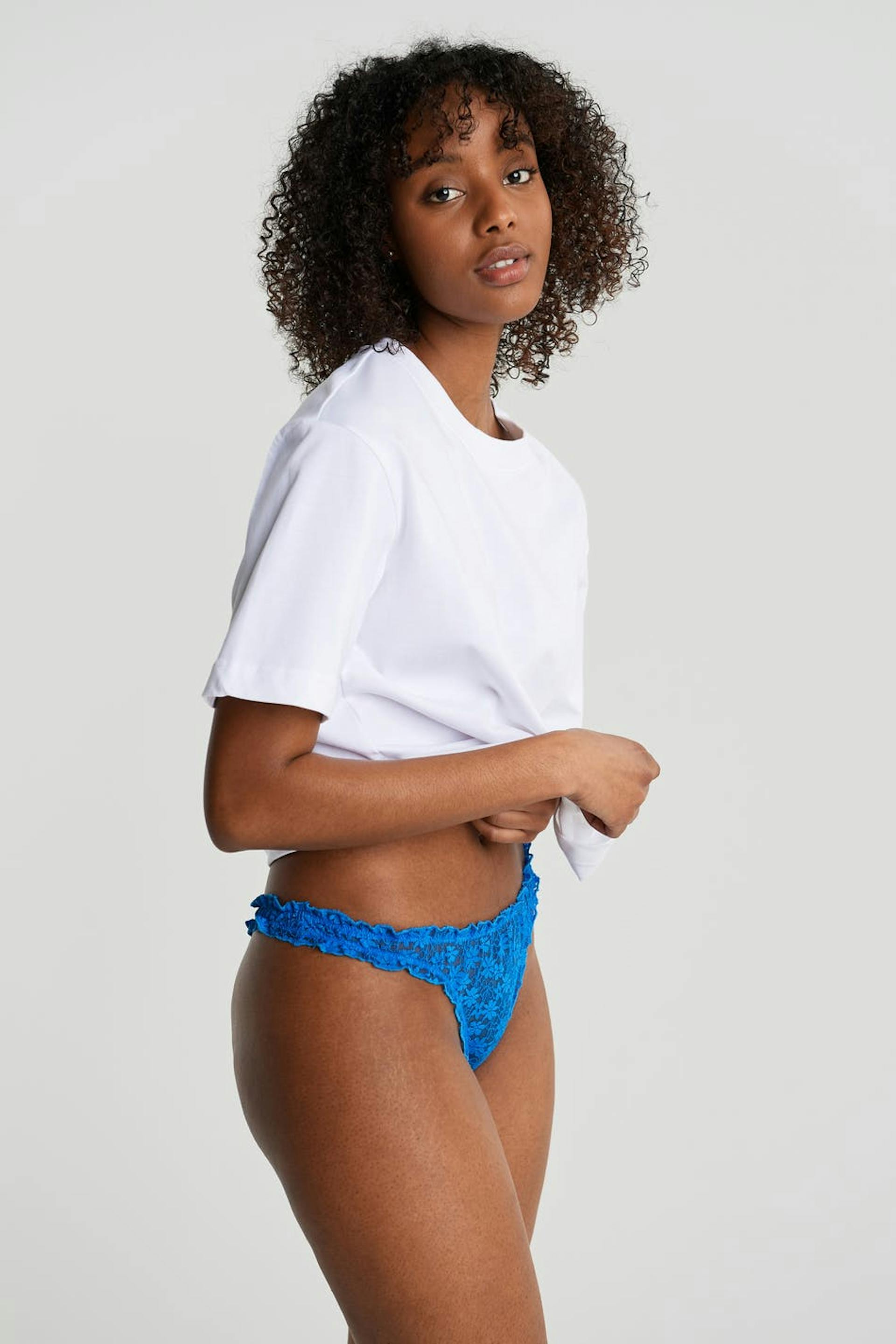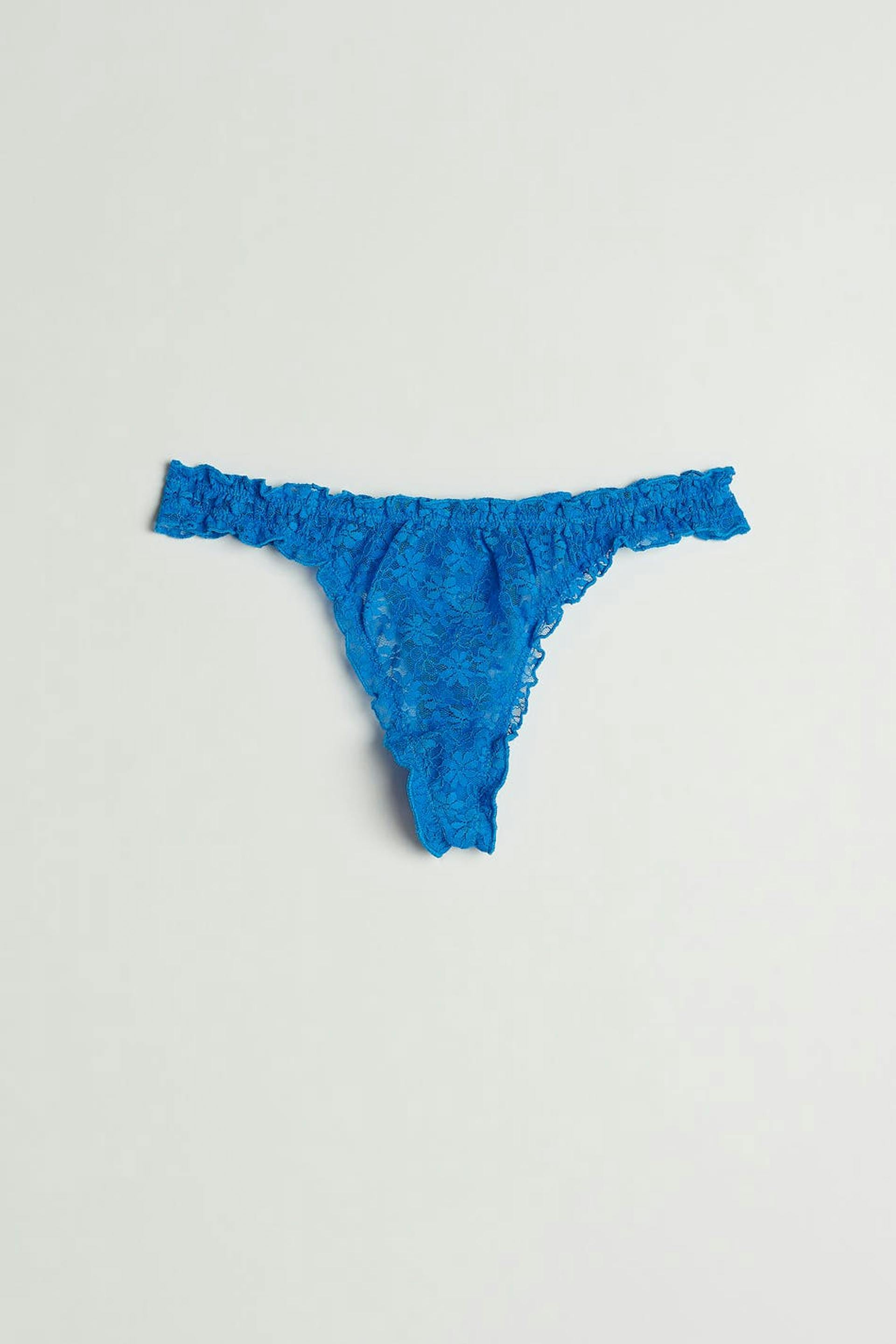 Stringit röyhelöillä reunassa. Stringit ovat sinisiä ja niissä on vuori puuvillasta jalkojen välissä. Ne valmistetaan pitsistä.