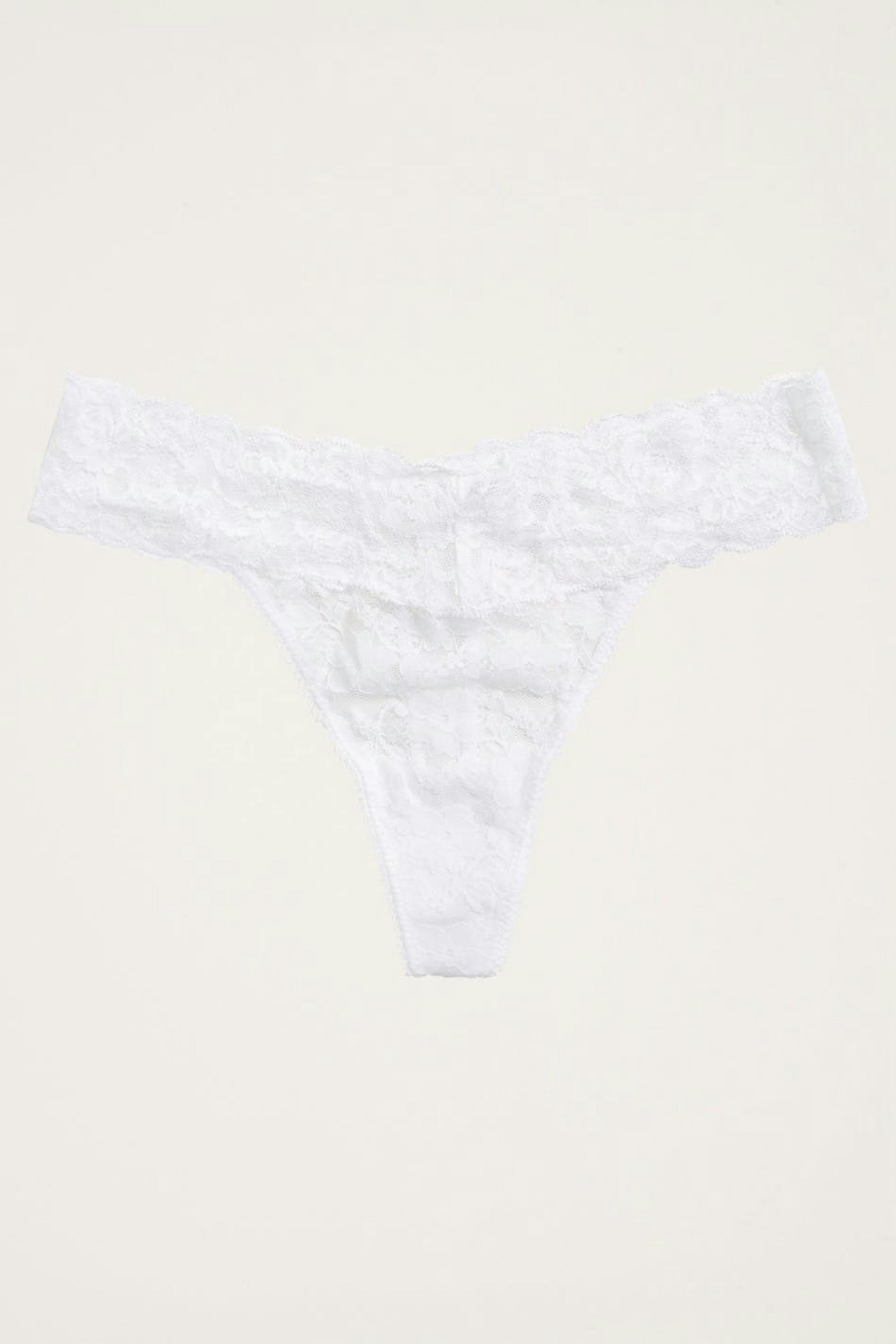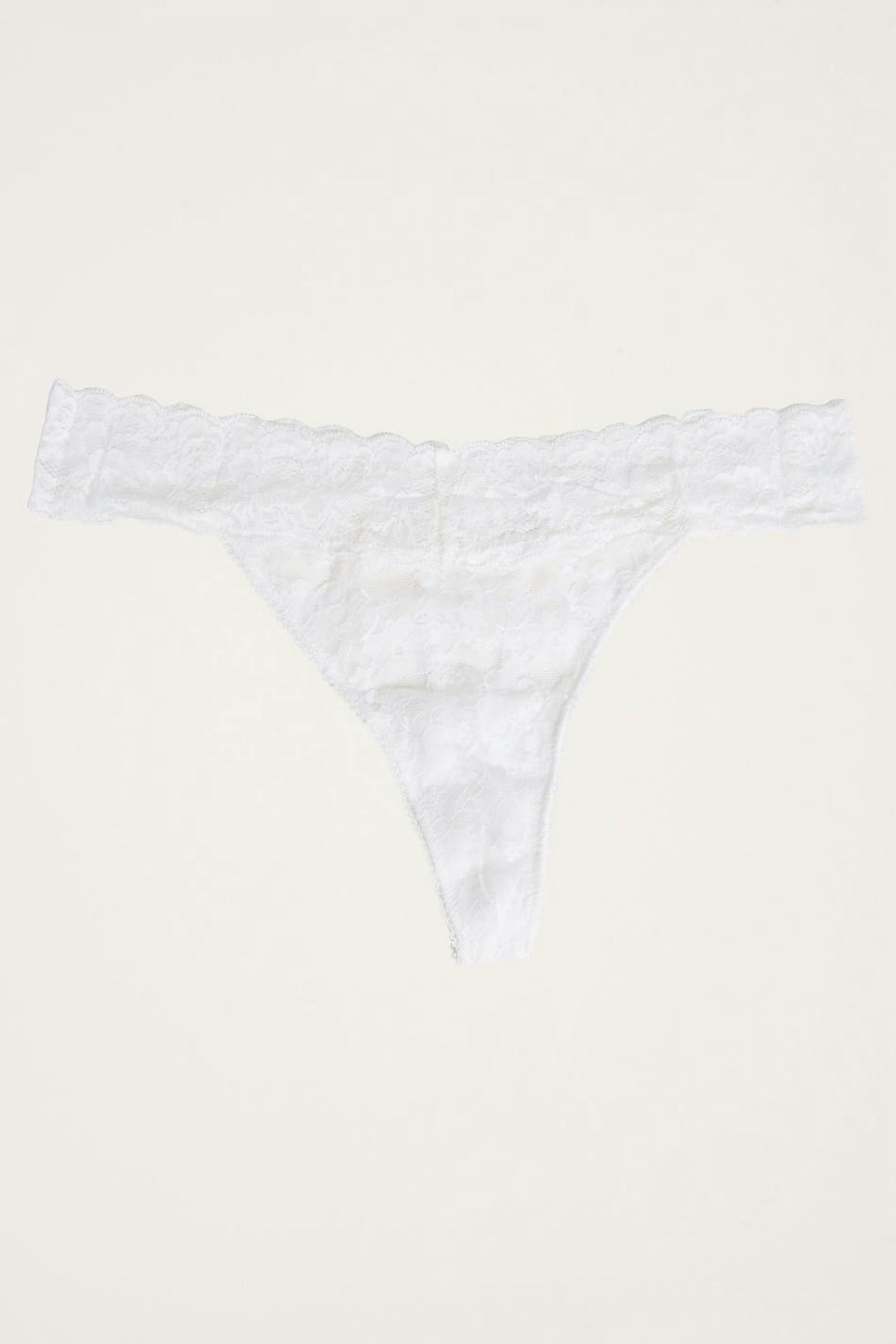 Stringi joustonauhalla pitsistä vyötäröllä. Stringi on valkoinen. Se valmistetaan pitsistä.