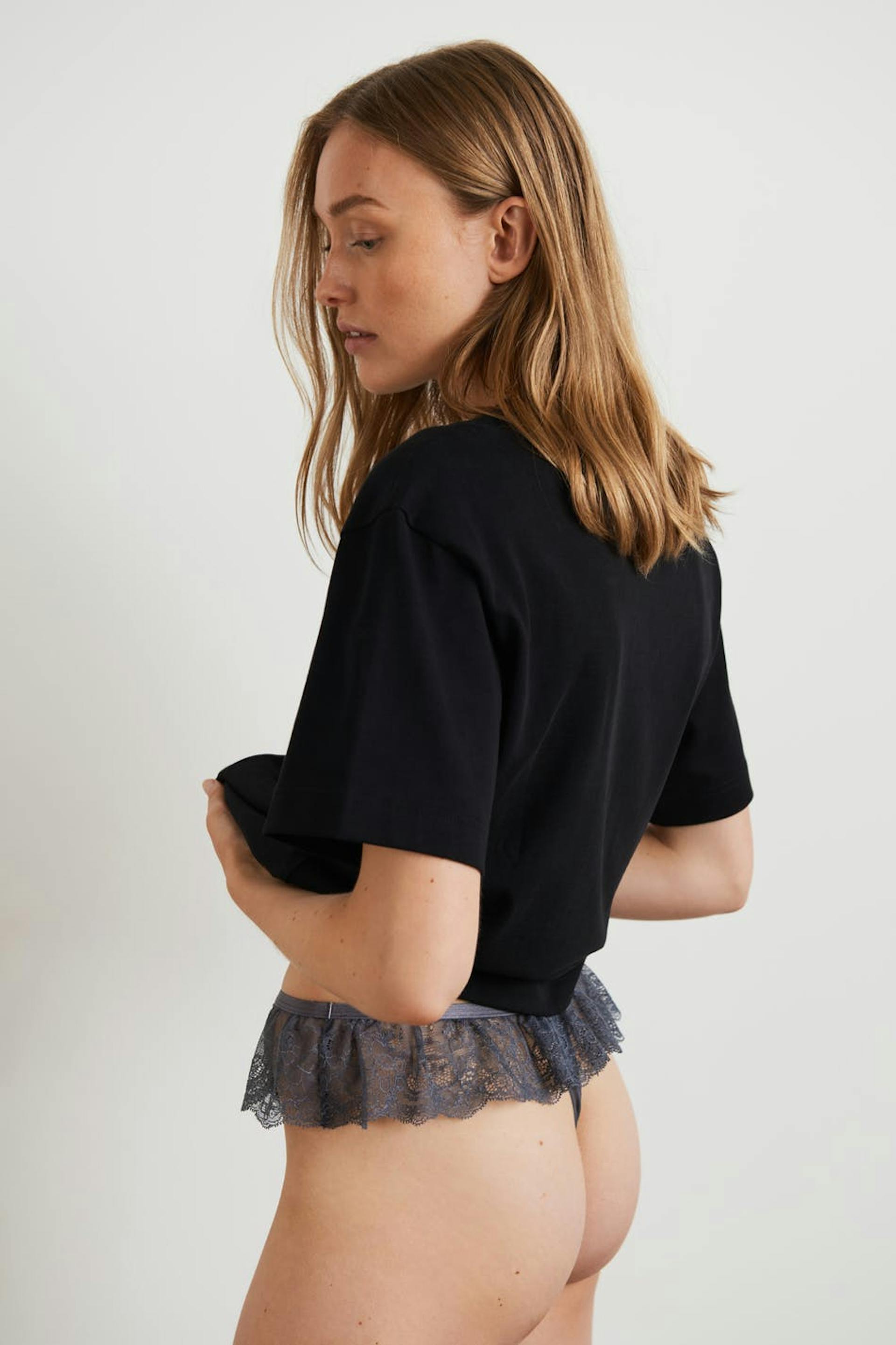 Stringit vuorilla puuvillasta jalkovälissä. Ne valmistetaan pitsistä.