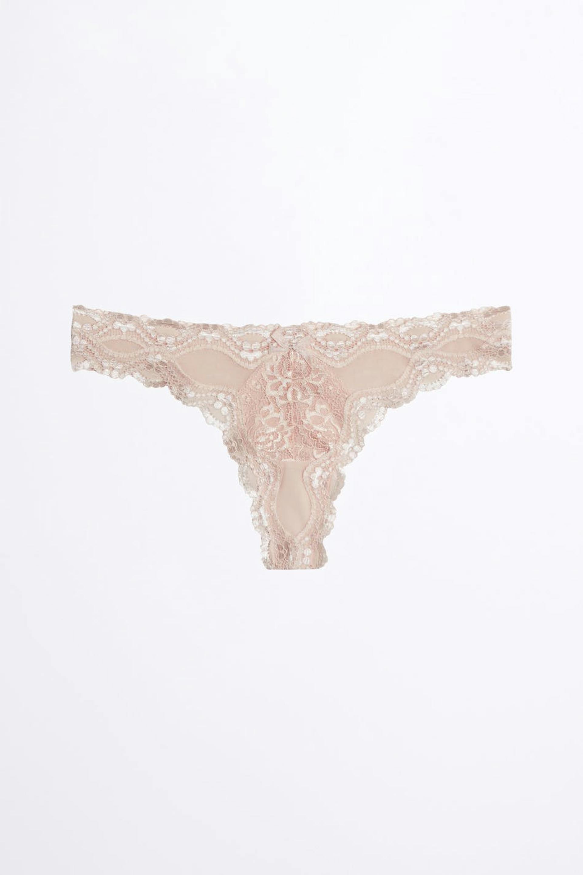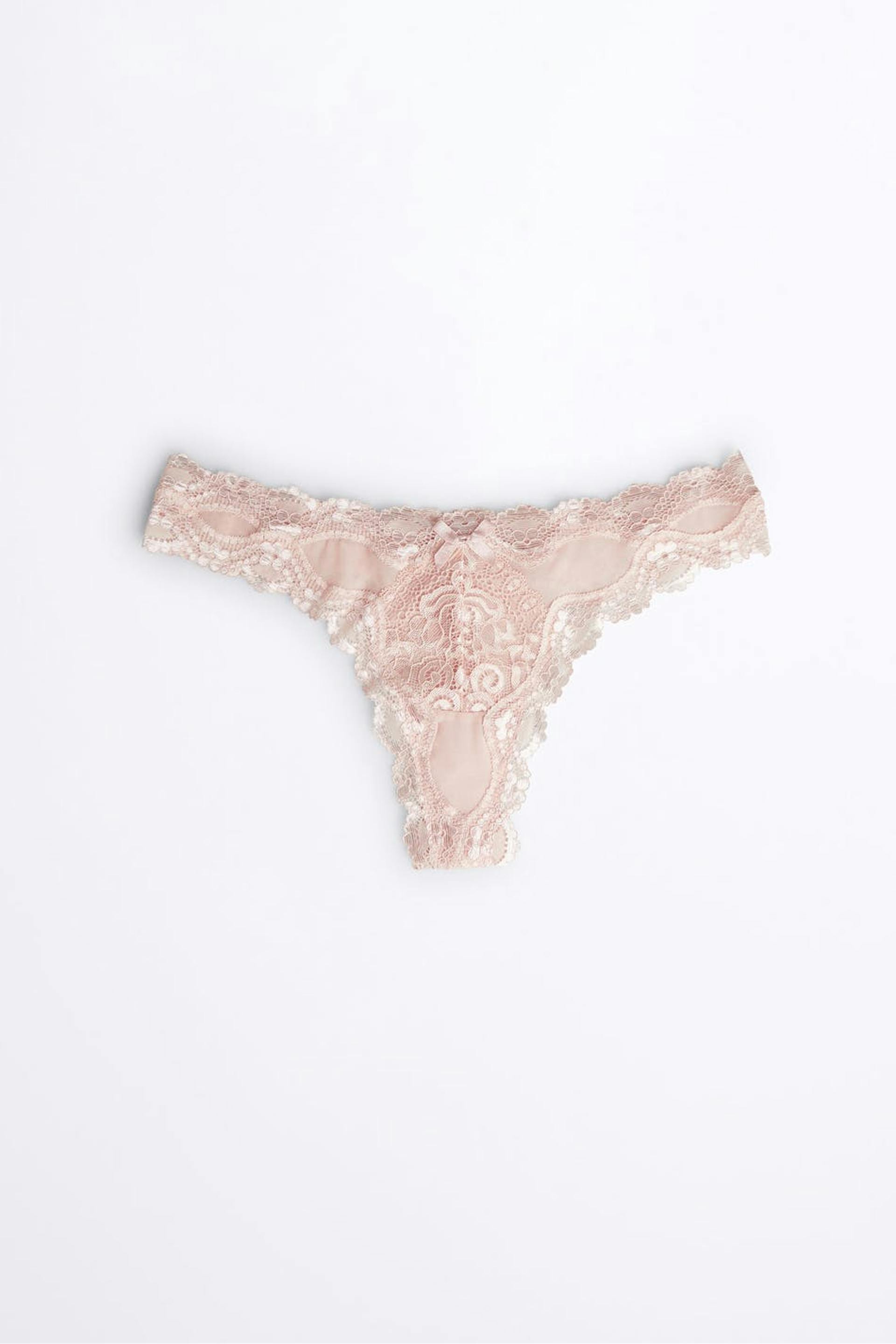 Pikkuhousut stringimallilla. Pikkuhousut ovat pinkkejä ja niissä on pitsikangas edessä ja reunassa.