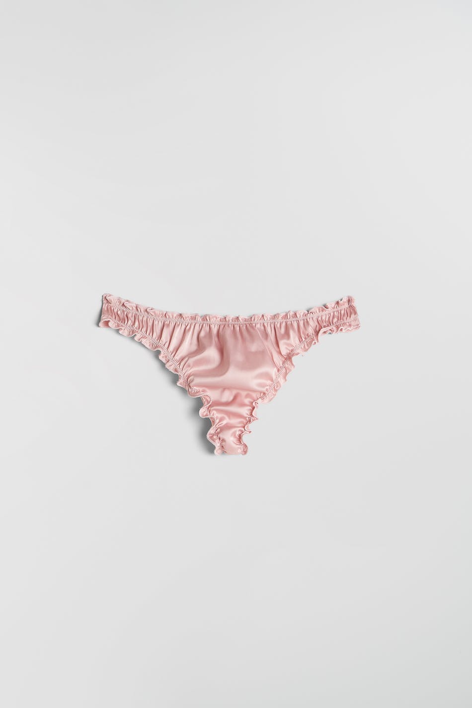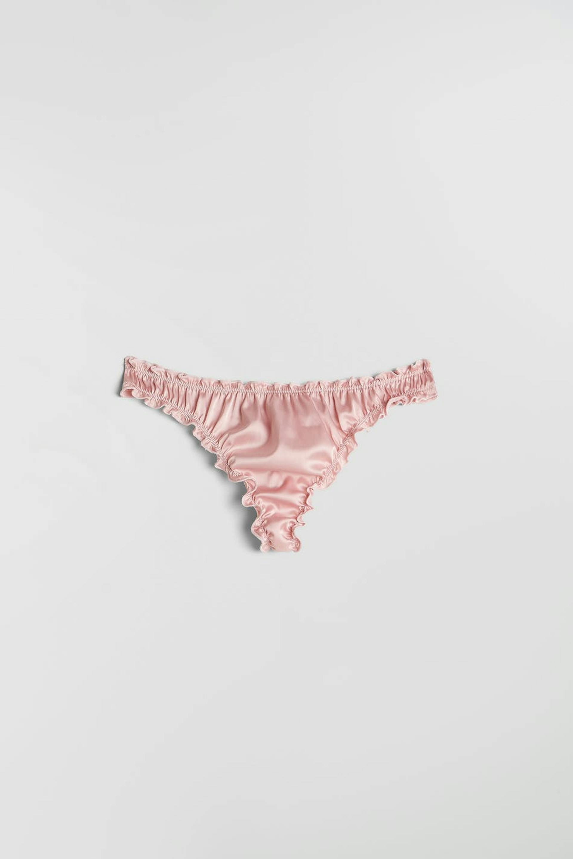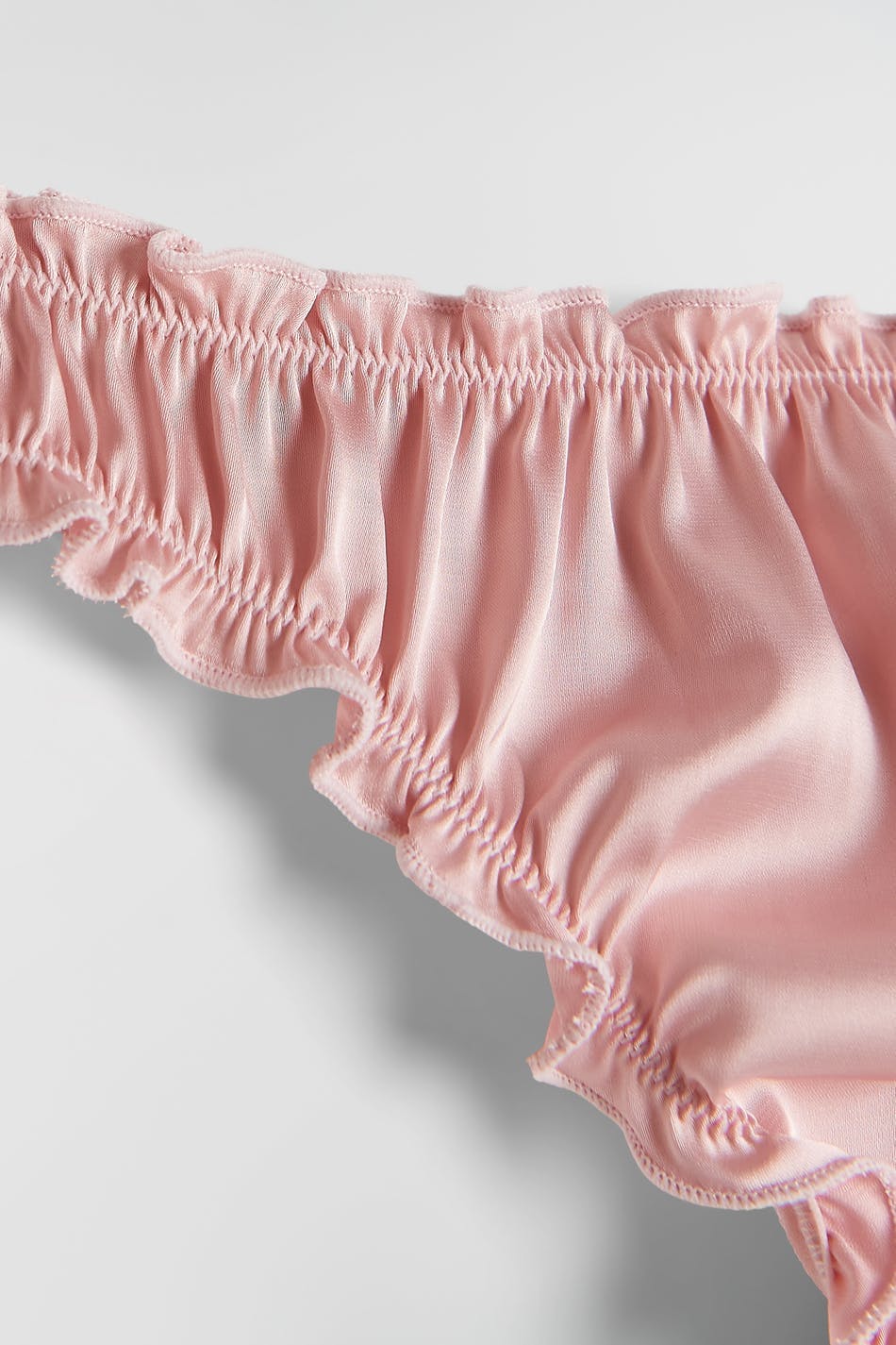Satin string with frills at all openings. Cotton lining at crotch. Supplier: Crown-Max (H.K.) Ltd Production unit: Huizhou Jiaye Garment Co Ltd