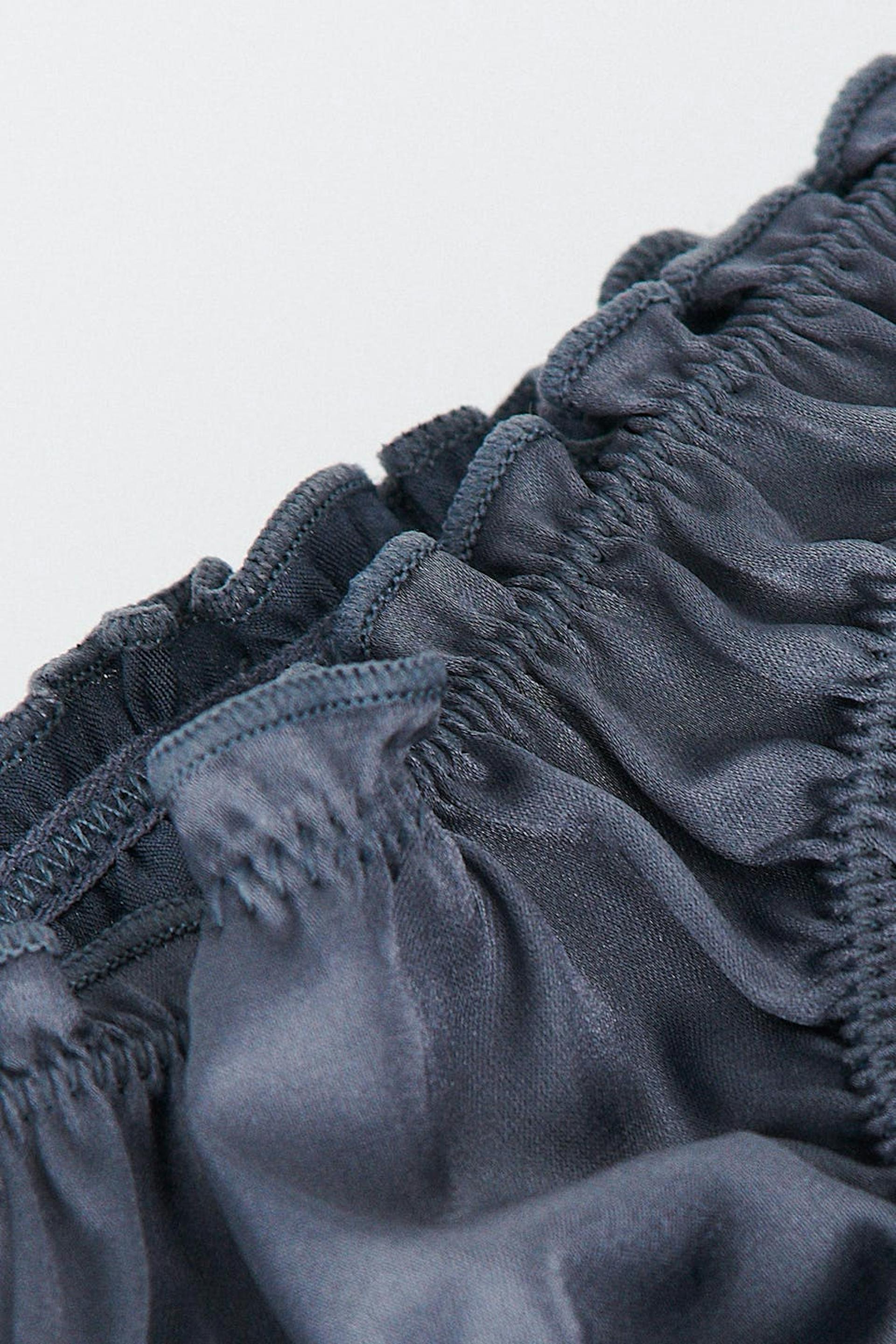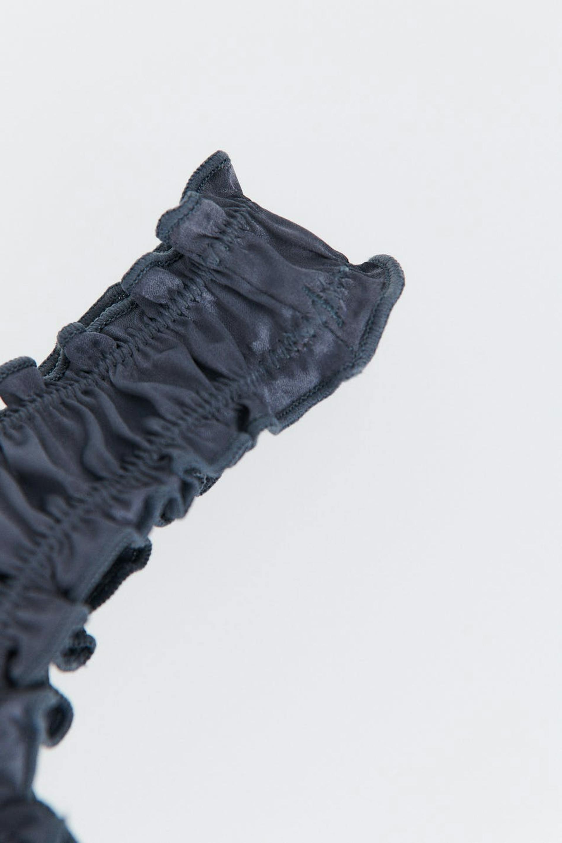 Stringi satiinista röyhelöreunoilla. Stringi on harmaa ja siinä on vuorattu haara puuvillasta.