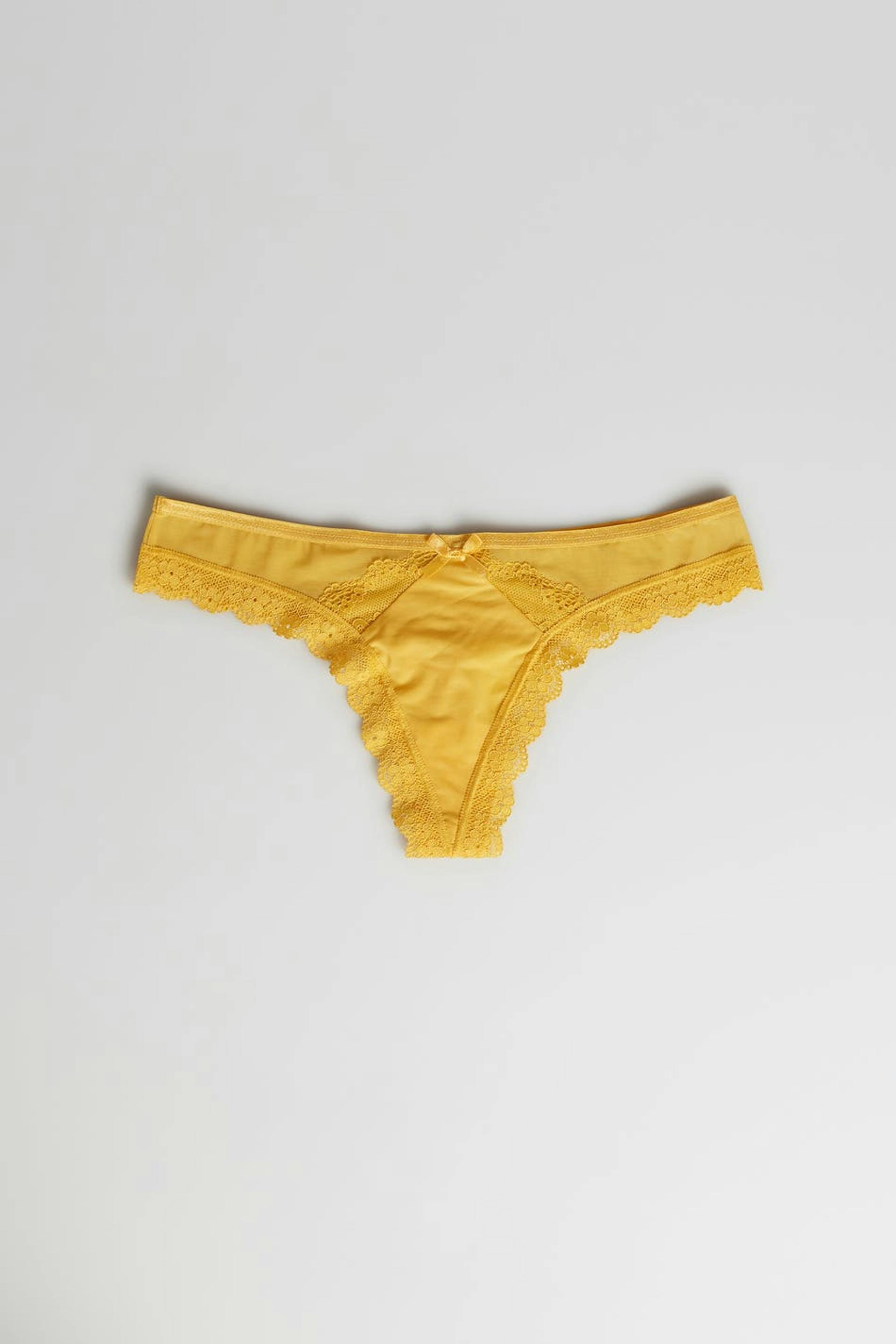 Pikkuhousut pitsiyksityiskohdilla jalkojen aukoissa. Pikkuhousut ovat keltaisia.