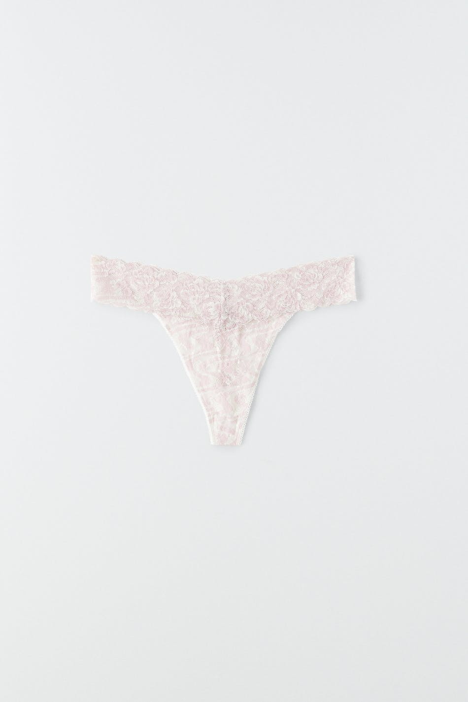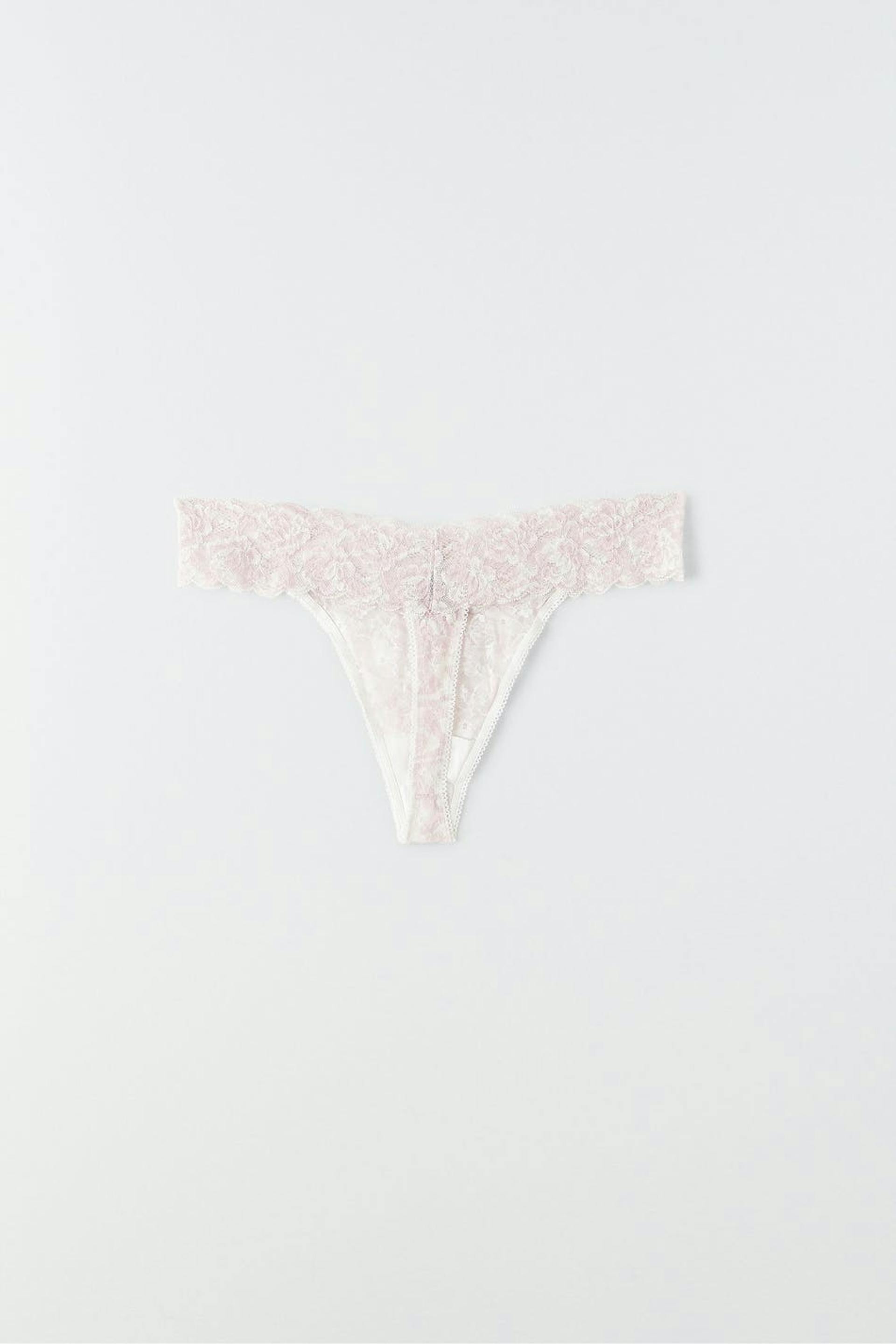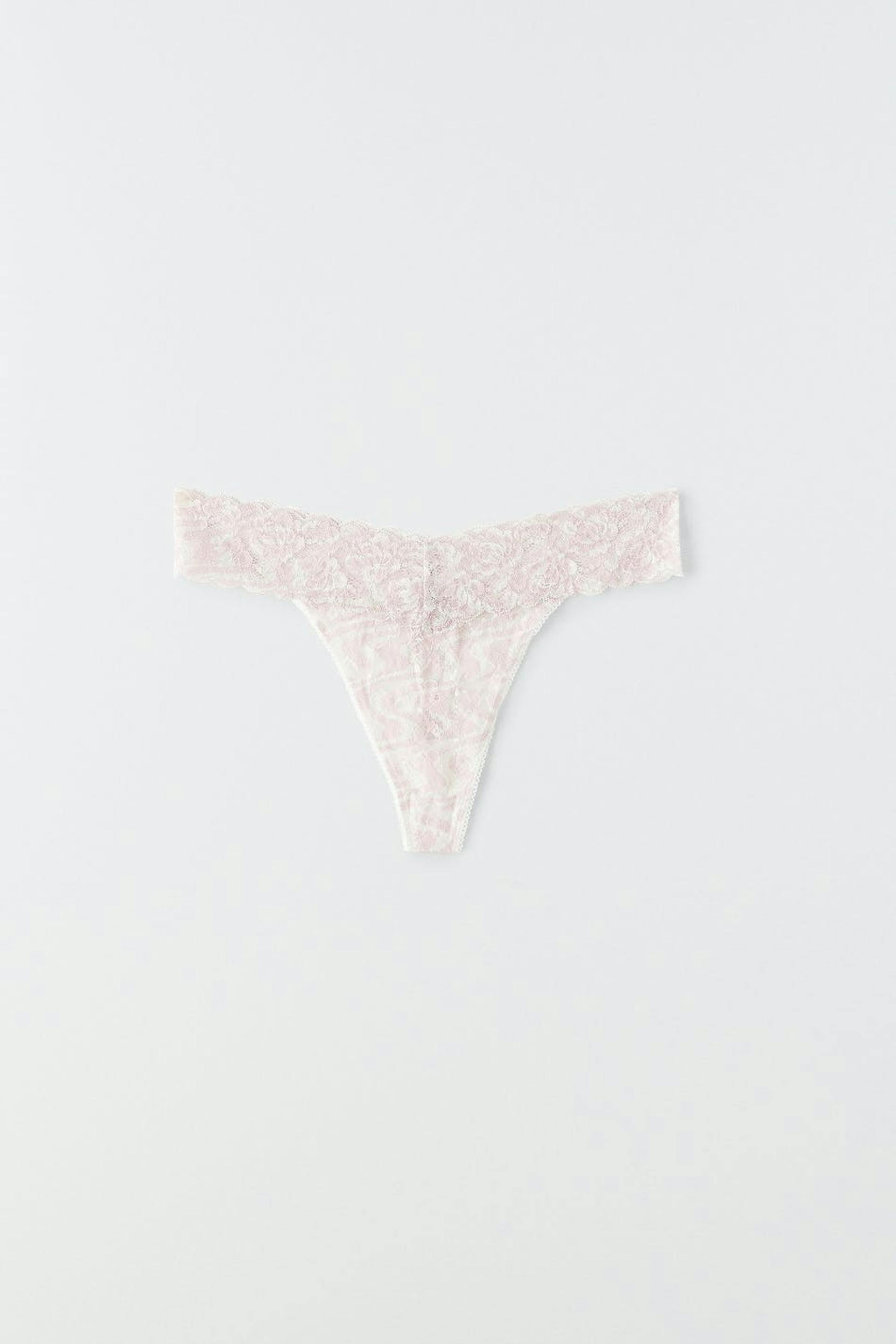 Stringit pehmeällä, elastisella pitsikankaalla. Stringit ovat pinkkejä ja valkoisia ja niissä on vuorattu haara.