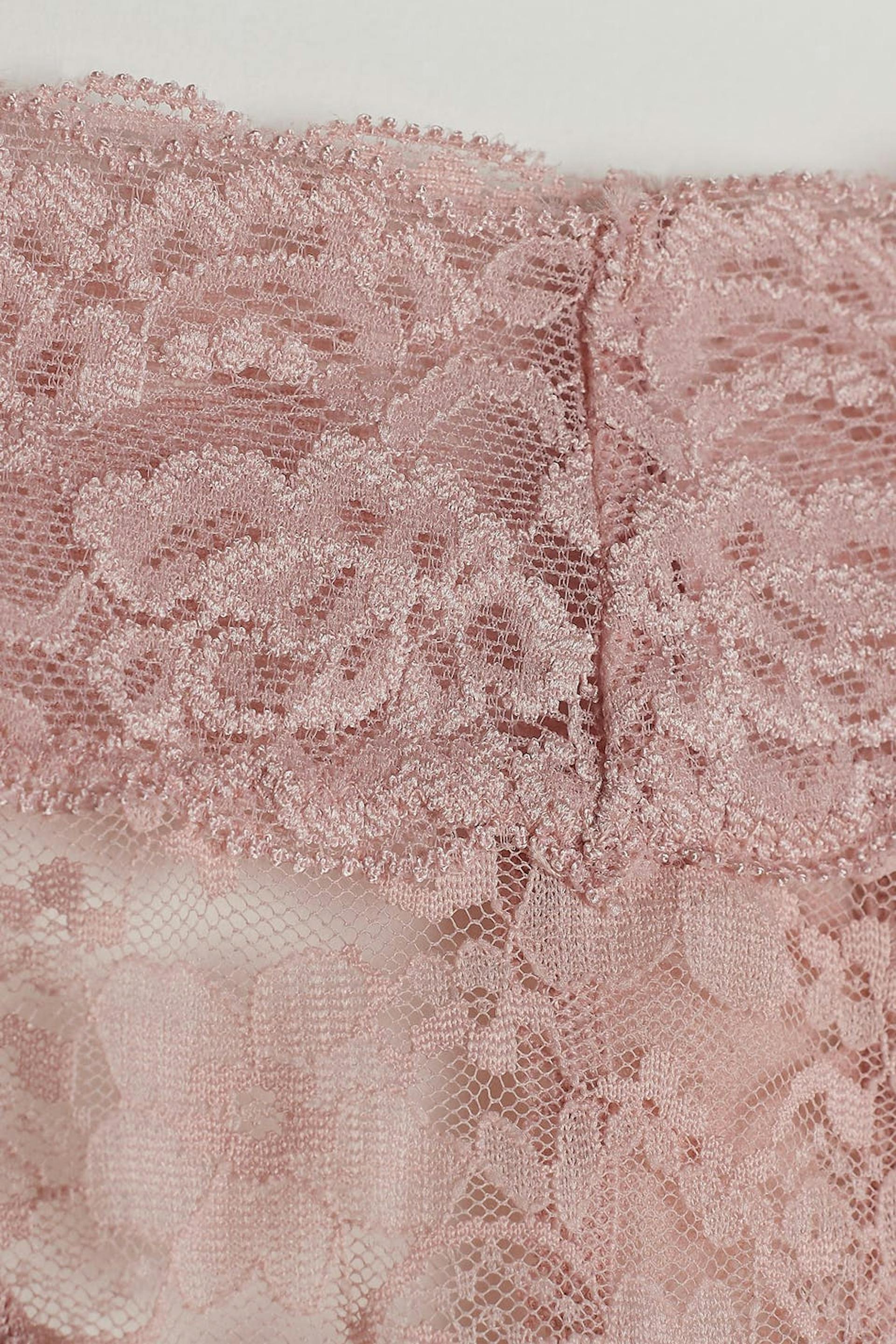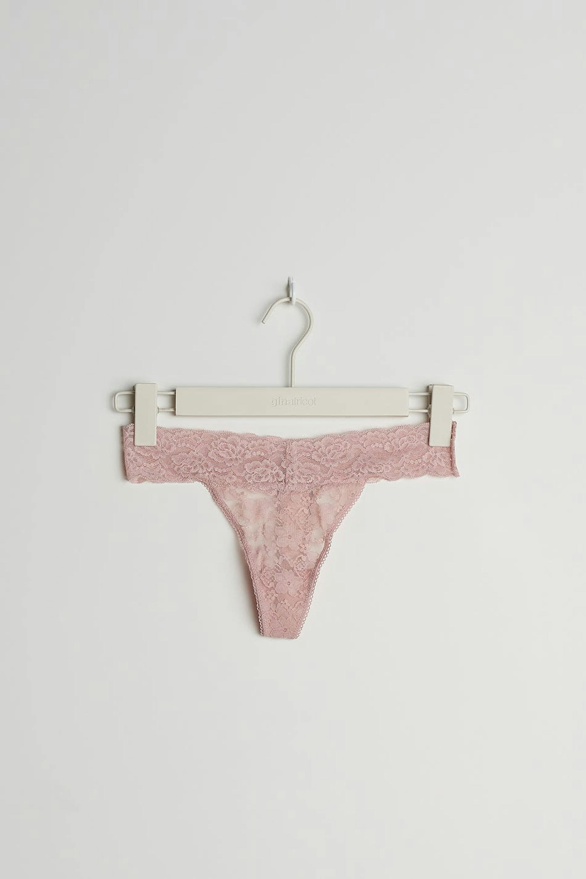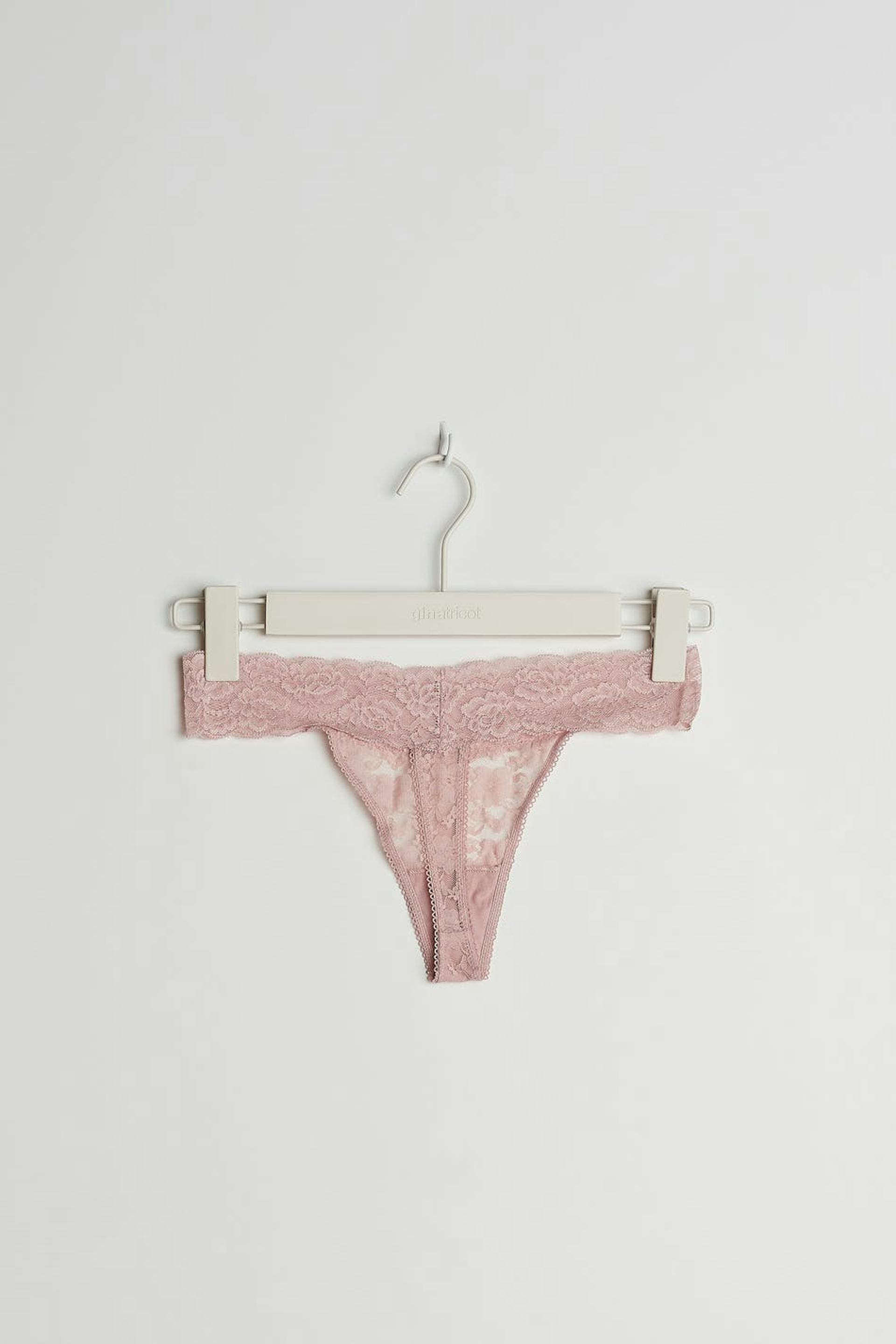 Pikkuhousut stringimallilla. Pikkuhousut ovat pinkkejä. Ne valmistetaan pitsistä.