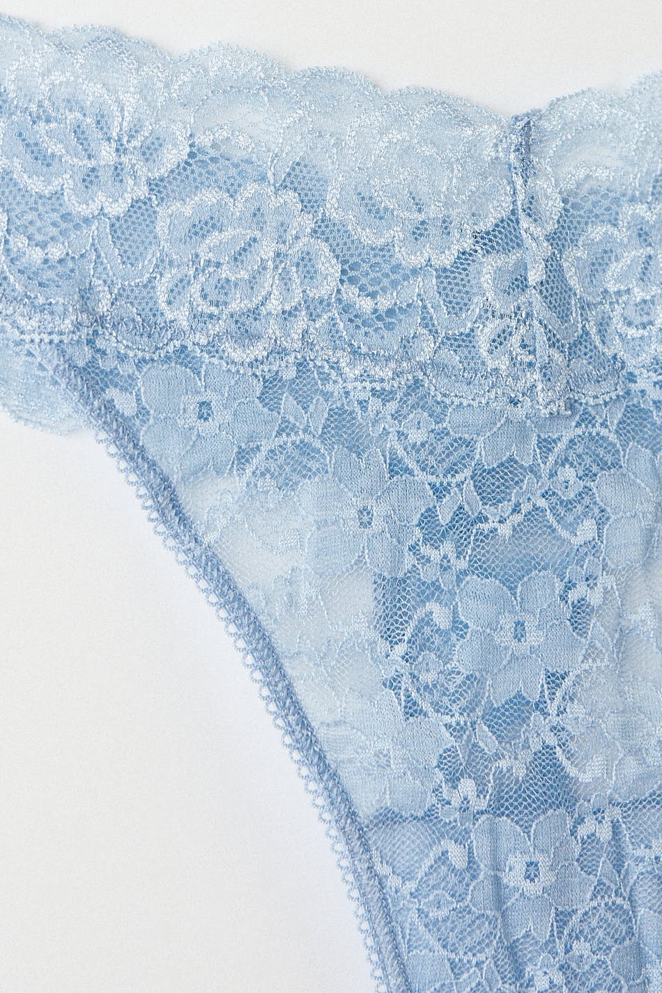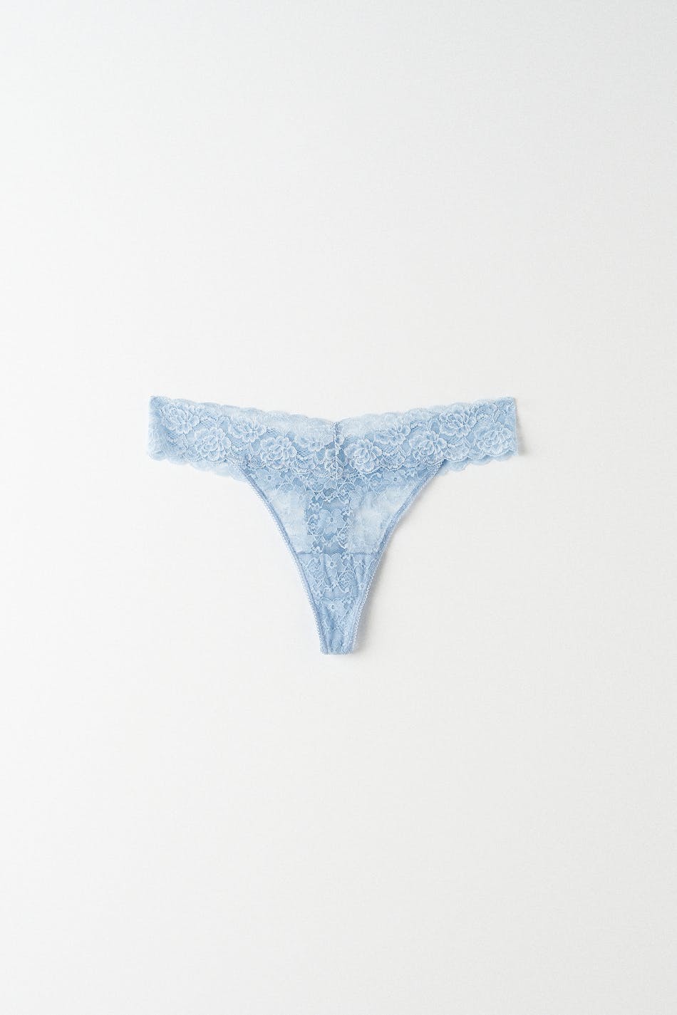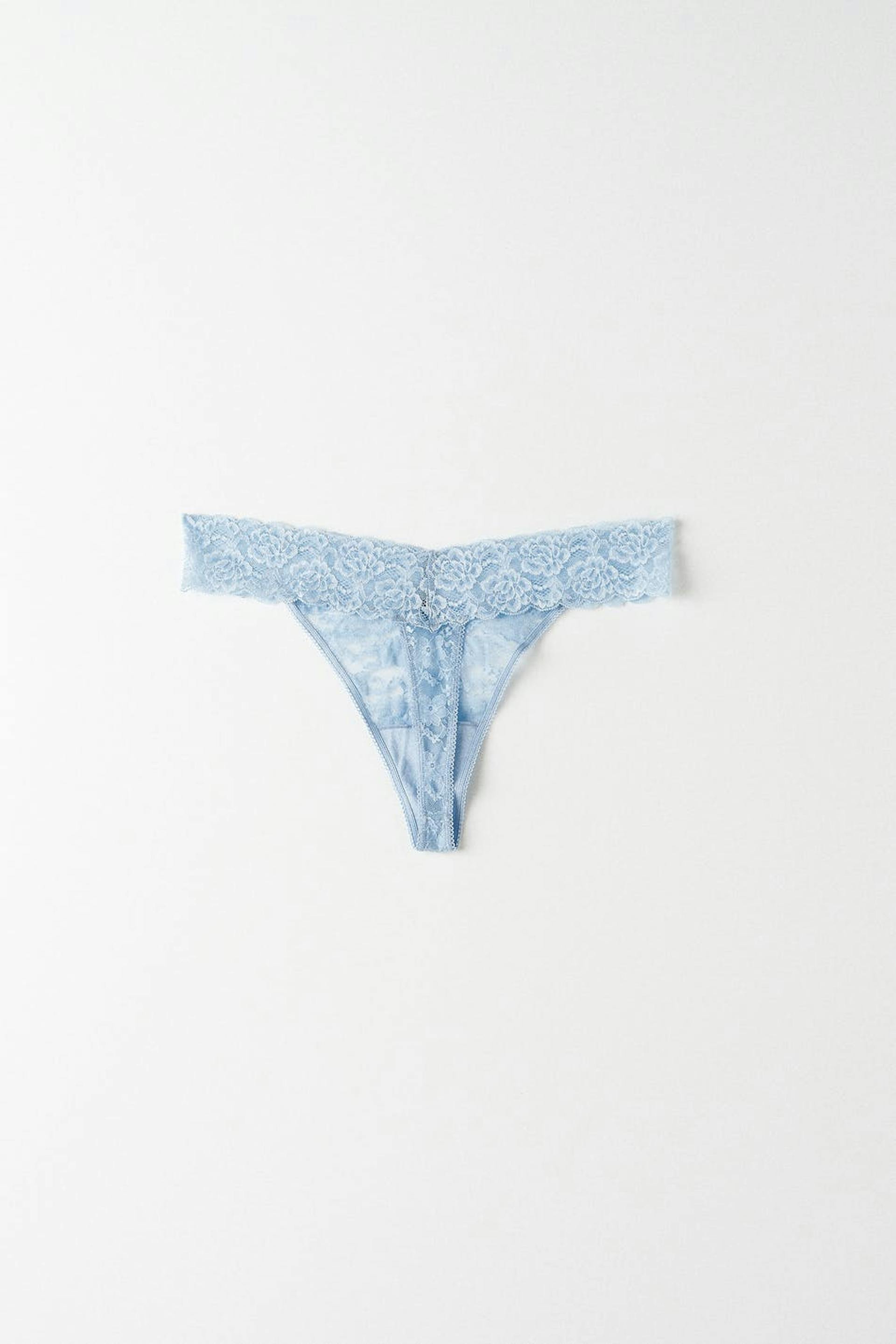 Stringit pehmeällä, elastisella pitsikankaalla. Stringit ovat sinisiä ja niissä on vuorattu haara.