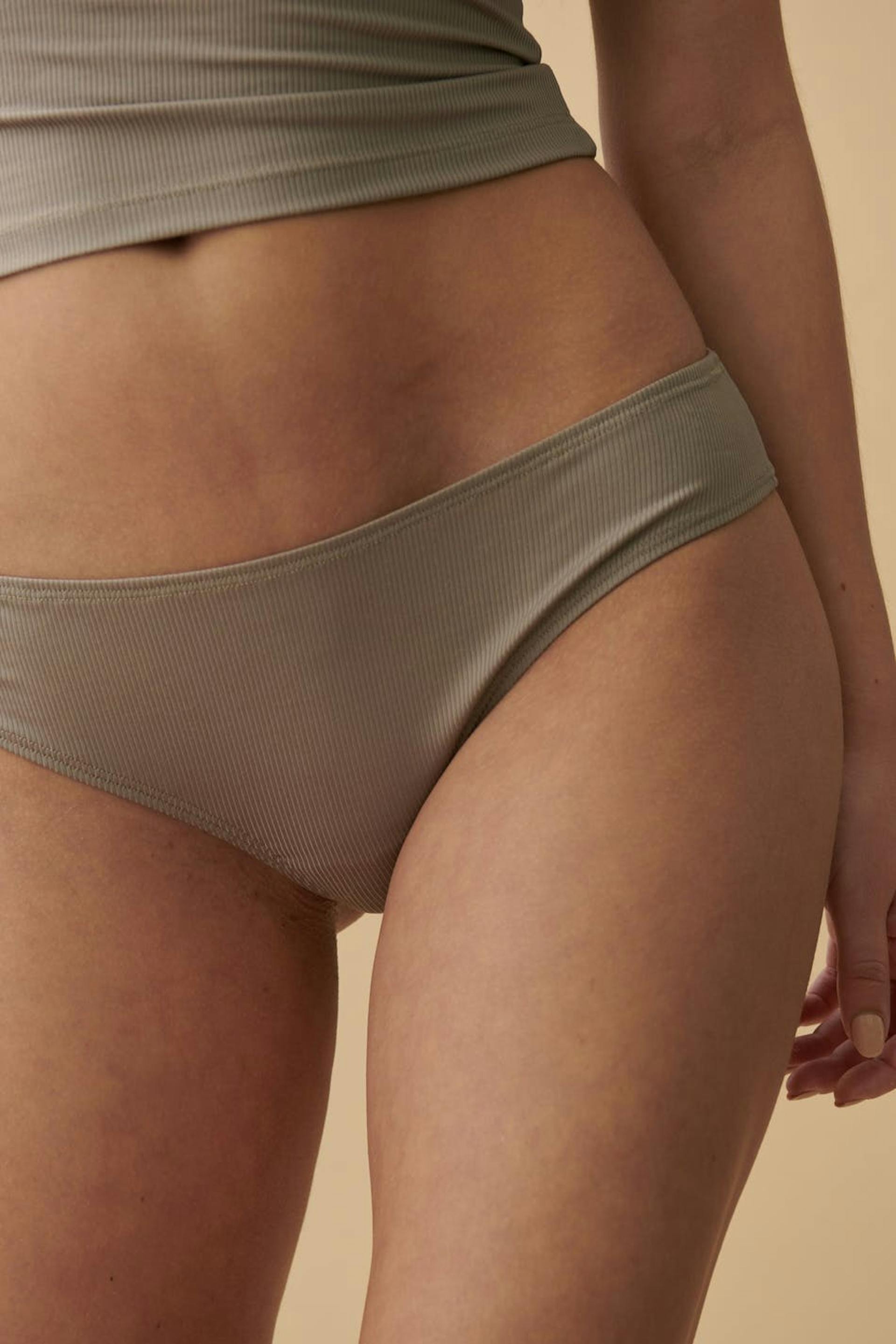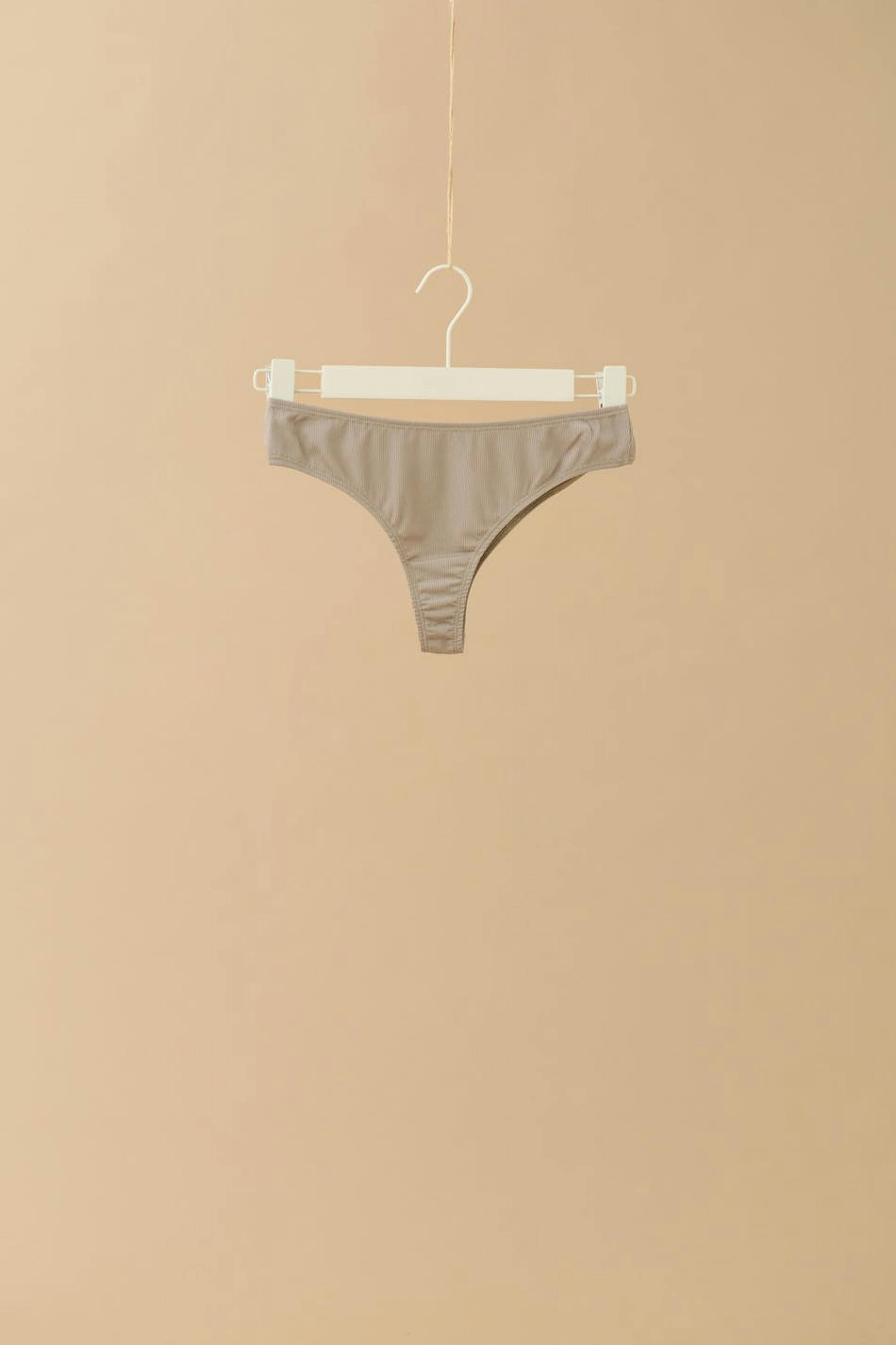 Allvar X Gina Tricot. Pehmeät brasilialaiset alushousut haaravälin vuorilla. Brasilialaiset alushousut ovat beigejä ja niissä on ribattu laatu. Kaikki malliston vaatteet on valmistettu paikan päällä Ruotsin Boråsissa, ja ne on valmistettu ruotsalaisista metsistä peräisin olevista puukuiduista.