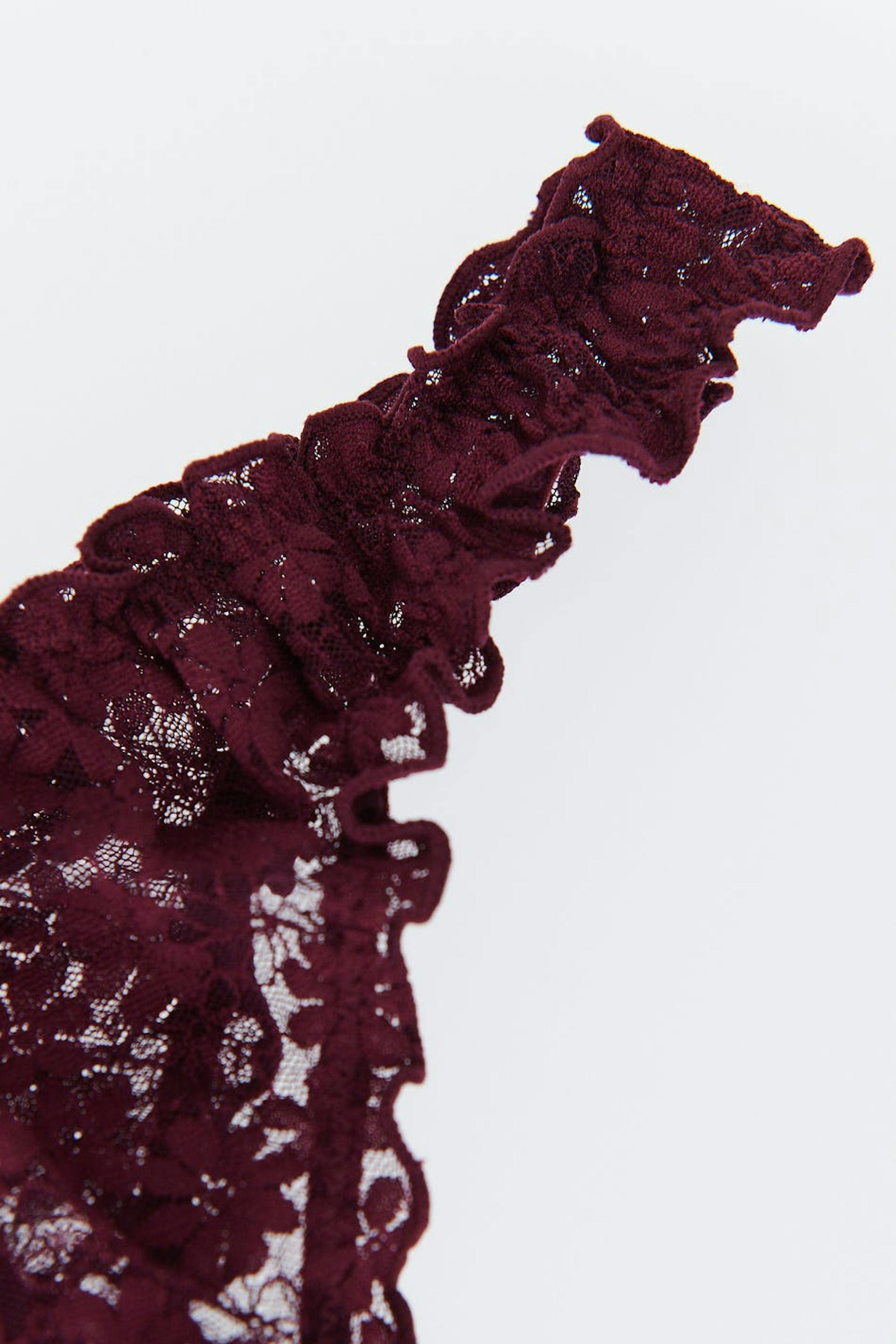 Stringit pitsistä röyhelöreunoilla. Stringit ovat punaisia ja niissä on haaravälin vuori puuvillasta.