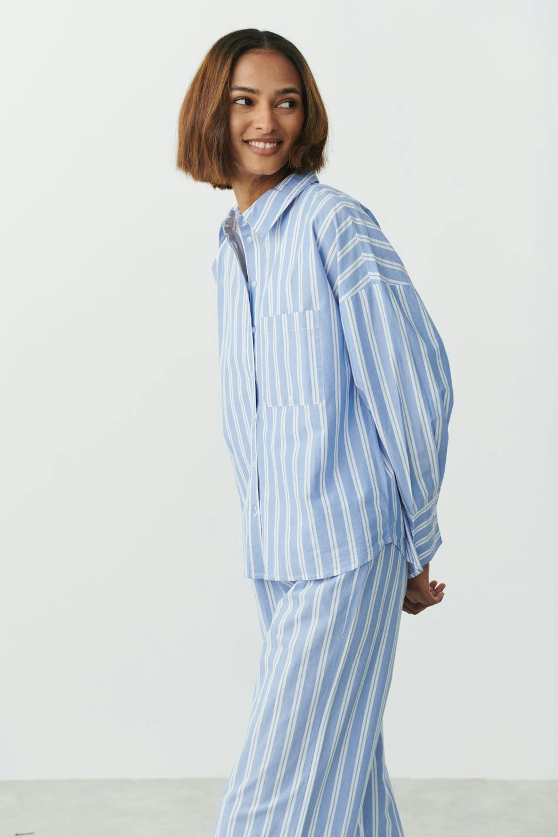 Raidallinen pyjamapaita puuvillasta napituslistalla edessä. Paita on sininen ja siinä on pitkä hiha napilla ja hihansuulla.